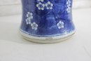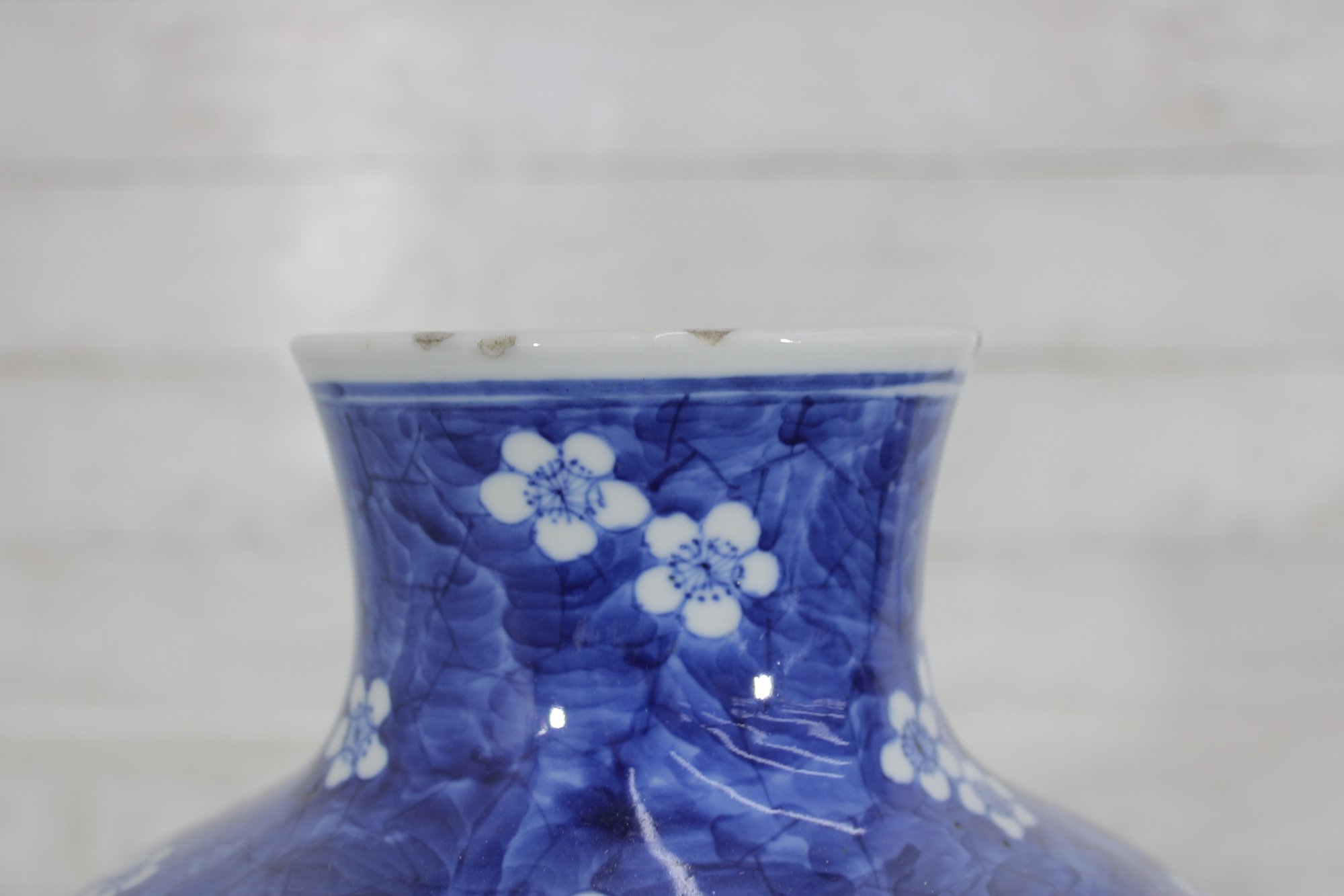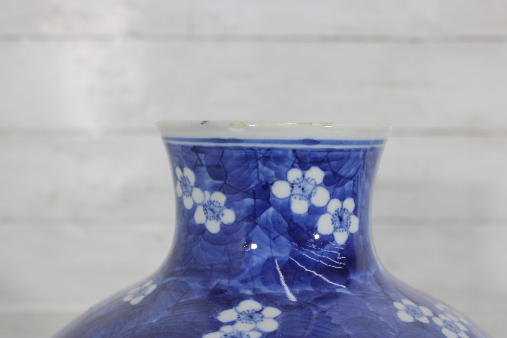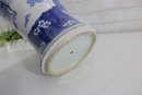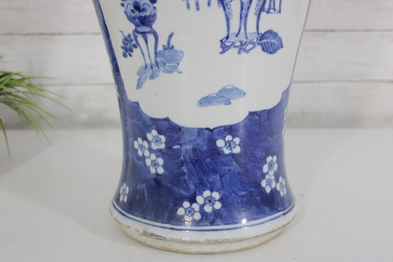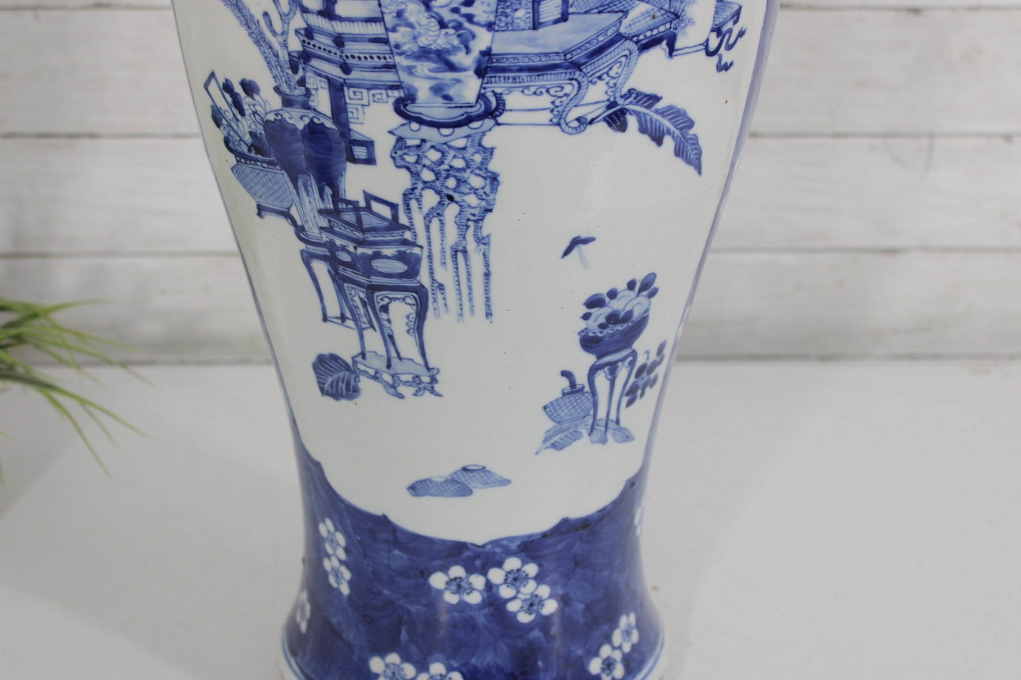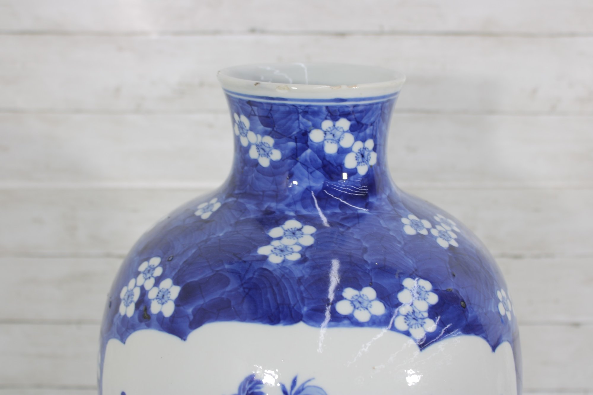 an impressive large blue and white porcelain floor vase featuring traditional Asian-inspired scenic and floral motifs. This striking piece measures approximately 24 inches tall, making it a bold decorative statement.