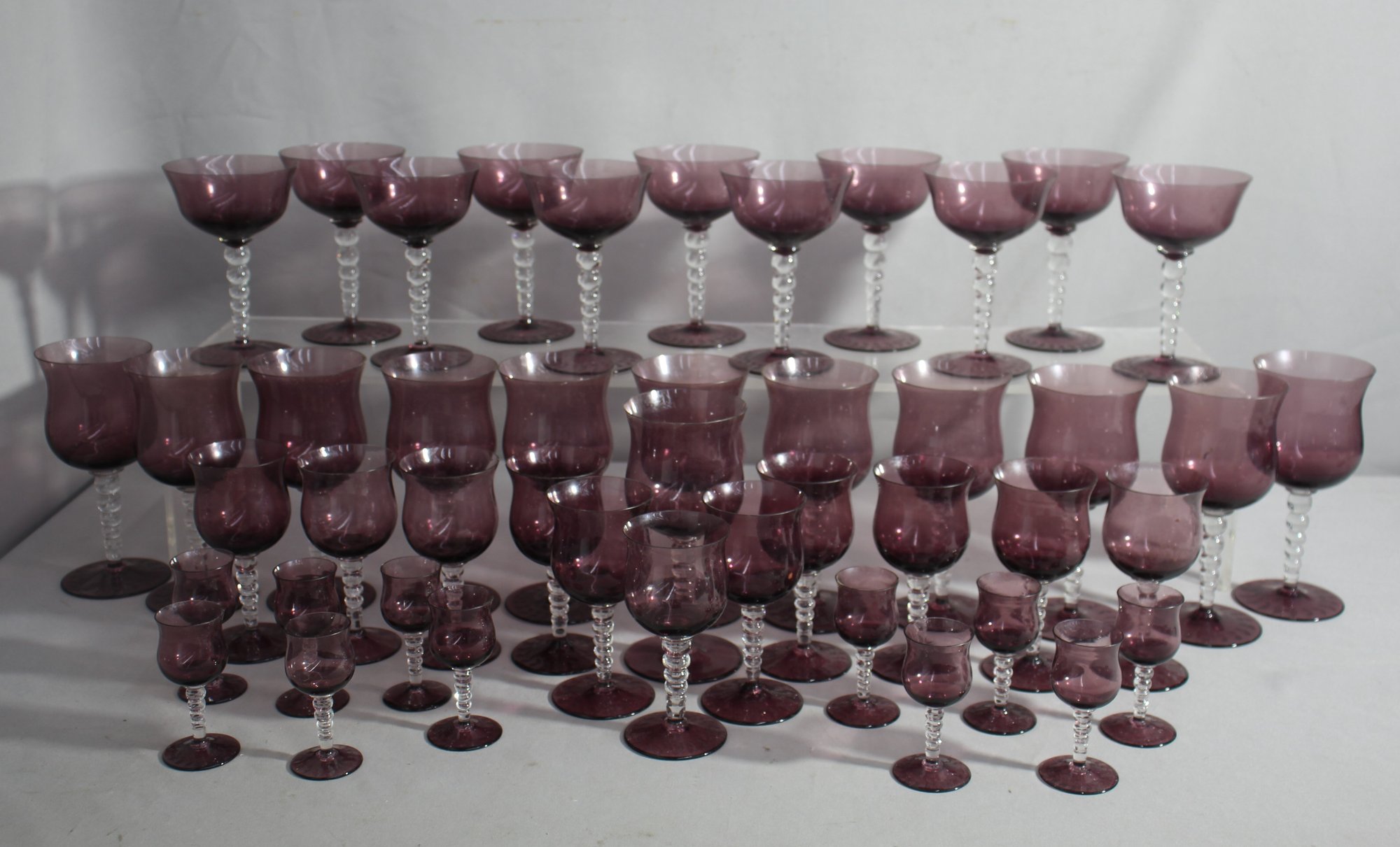 This exquisite collection features a large assortment of elegant purple wine glasses, each adorned with clear, intricately designed stems. Perfect for both collectors and entertainers, these wine glasses are sure to add a touch of sophistication to any occasion.