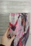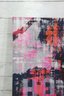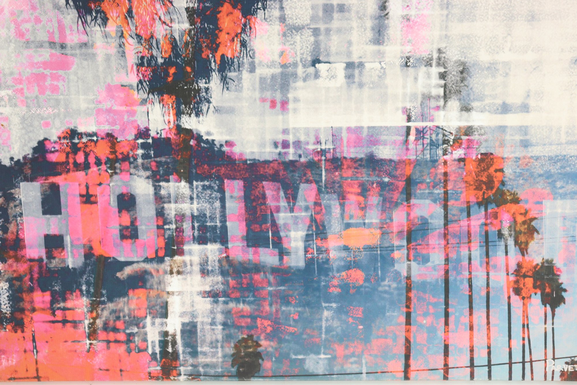 a large contemporary abstract painting on canvas, featuring a layered urban palm tree composition rendered in bold tones of pink, coral, blue, gray, black, and white. The artwork combines distressed textures, graphic elements, and painterly overlays, creating a dynamic city-meets-coastal aesthetic.