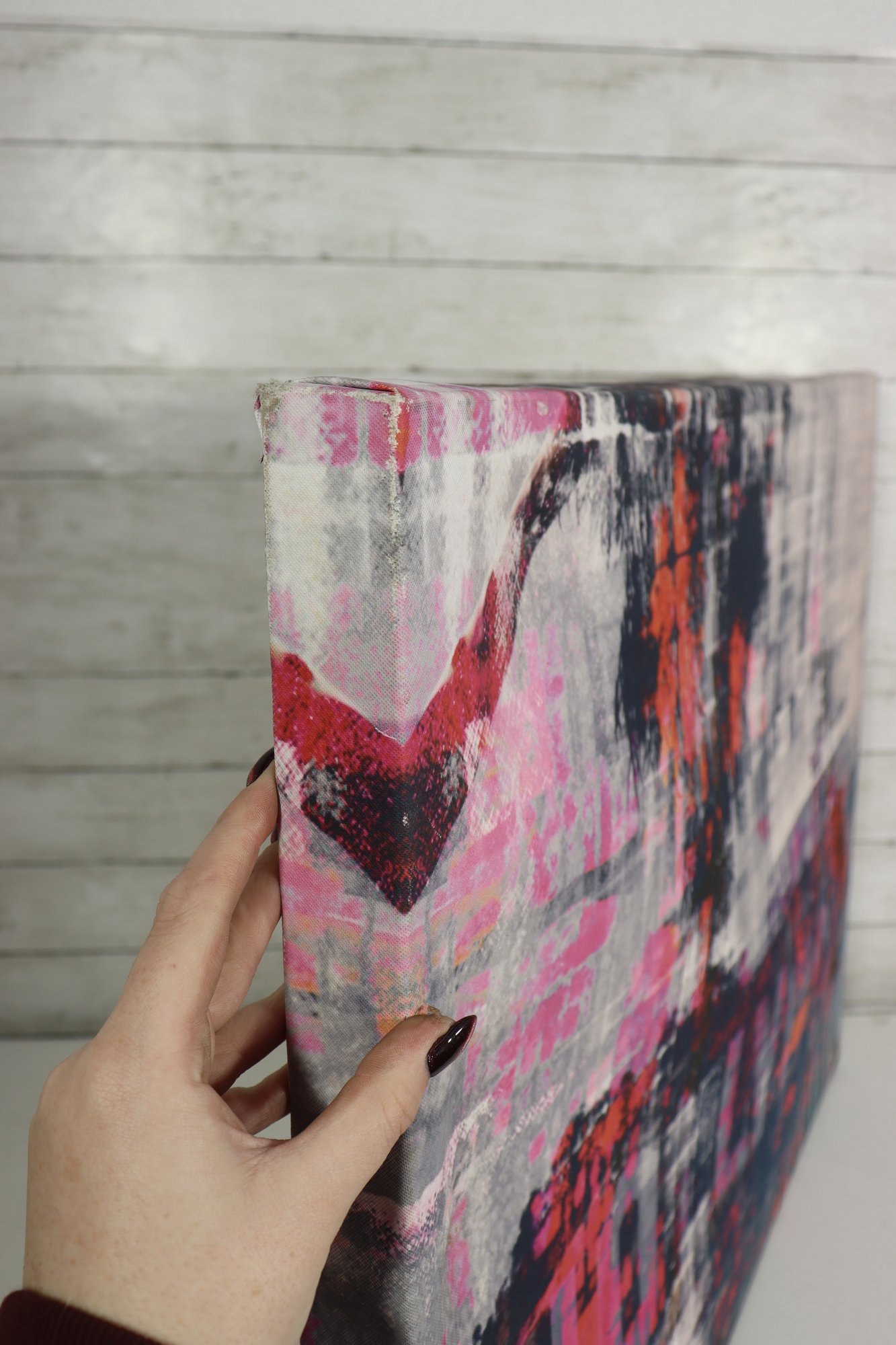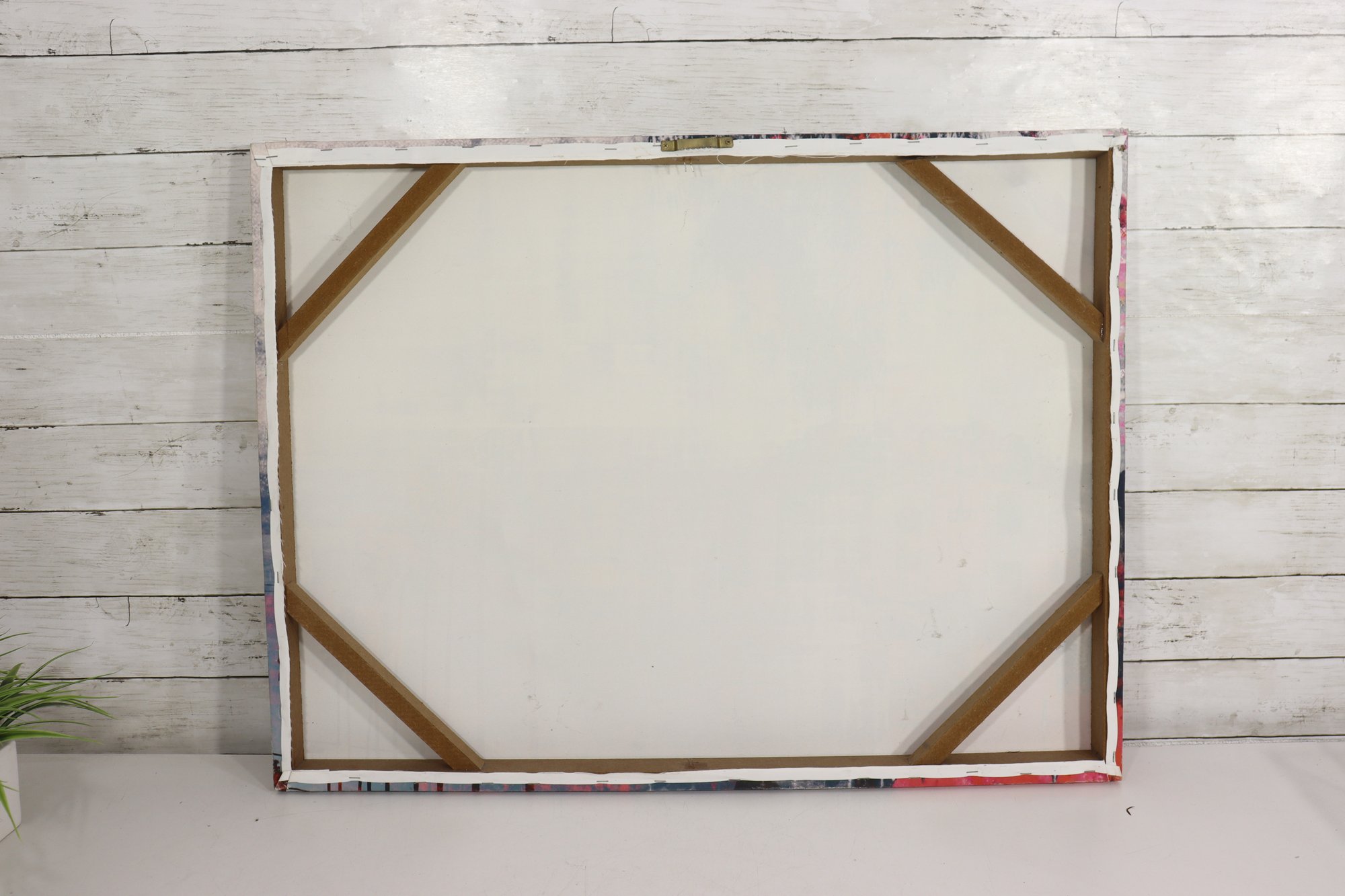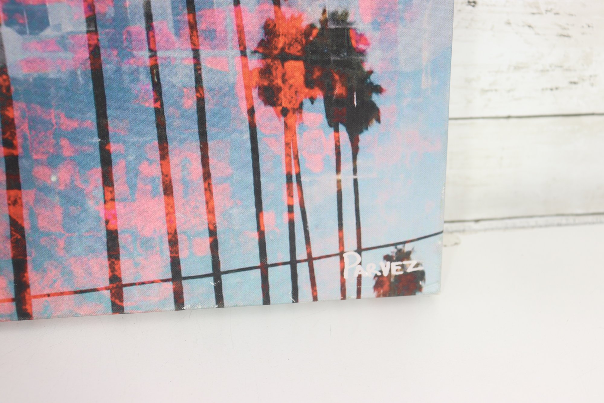 Hints of architectural forms and textural blocks contrast with silhouetted palm trees, giving the piece a modern, street-art–inspired feel. The canvas is stretched over a wooden frame and is ready for display as-is or for framing, depending on personal preference.