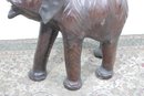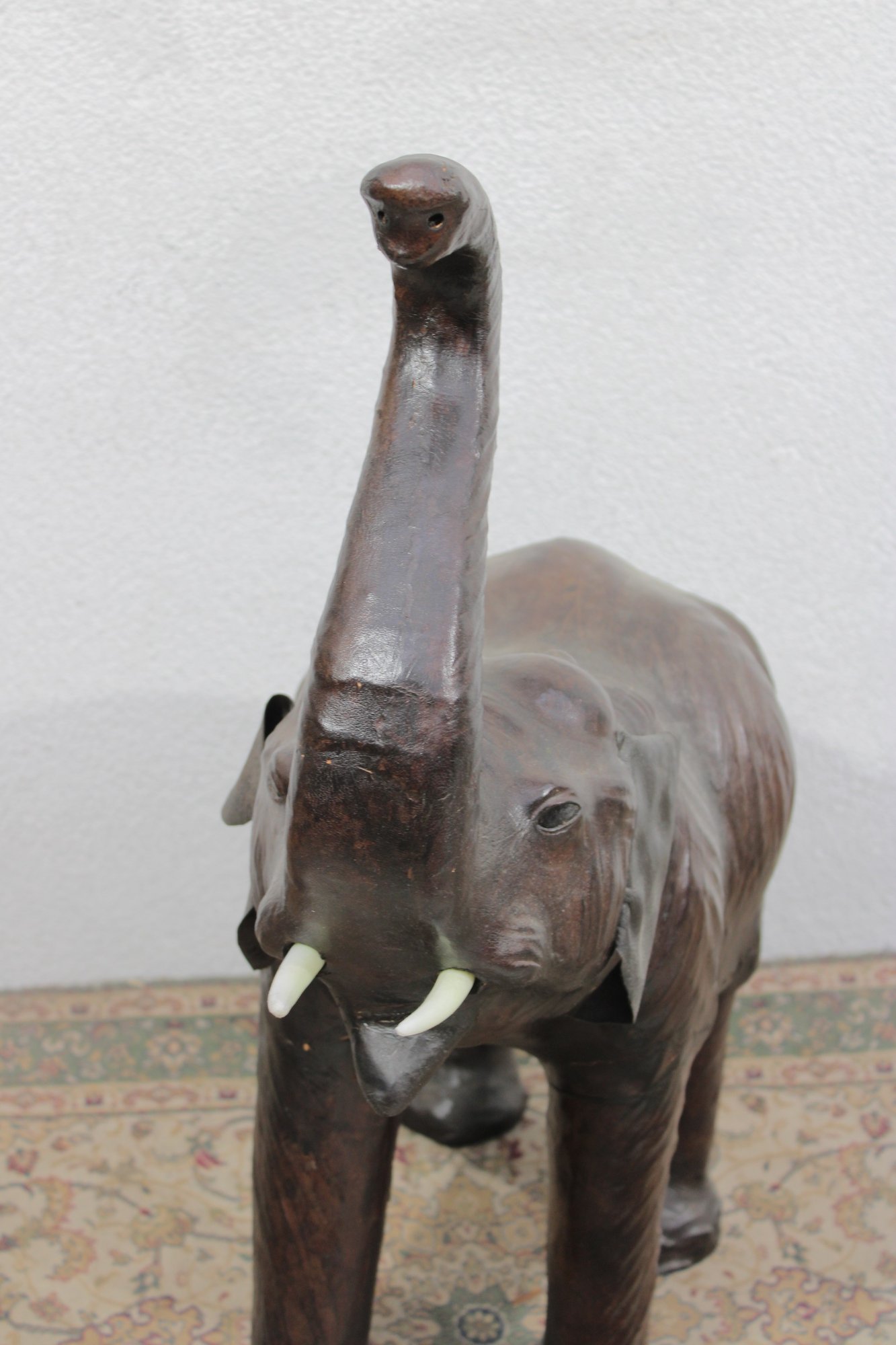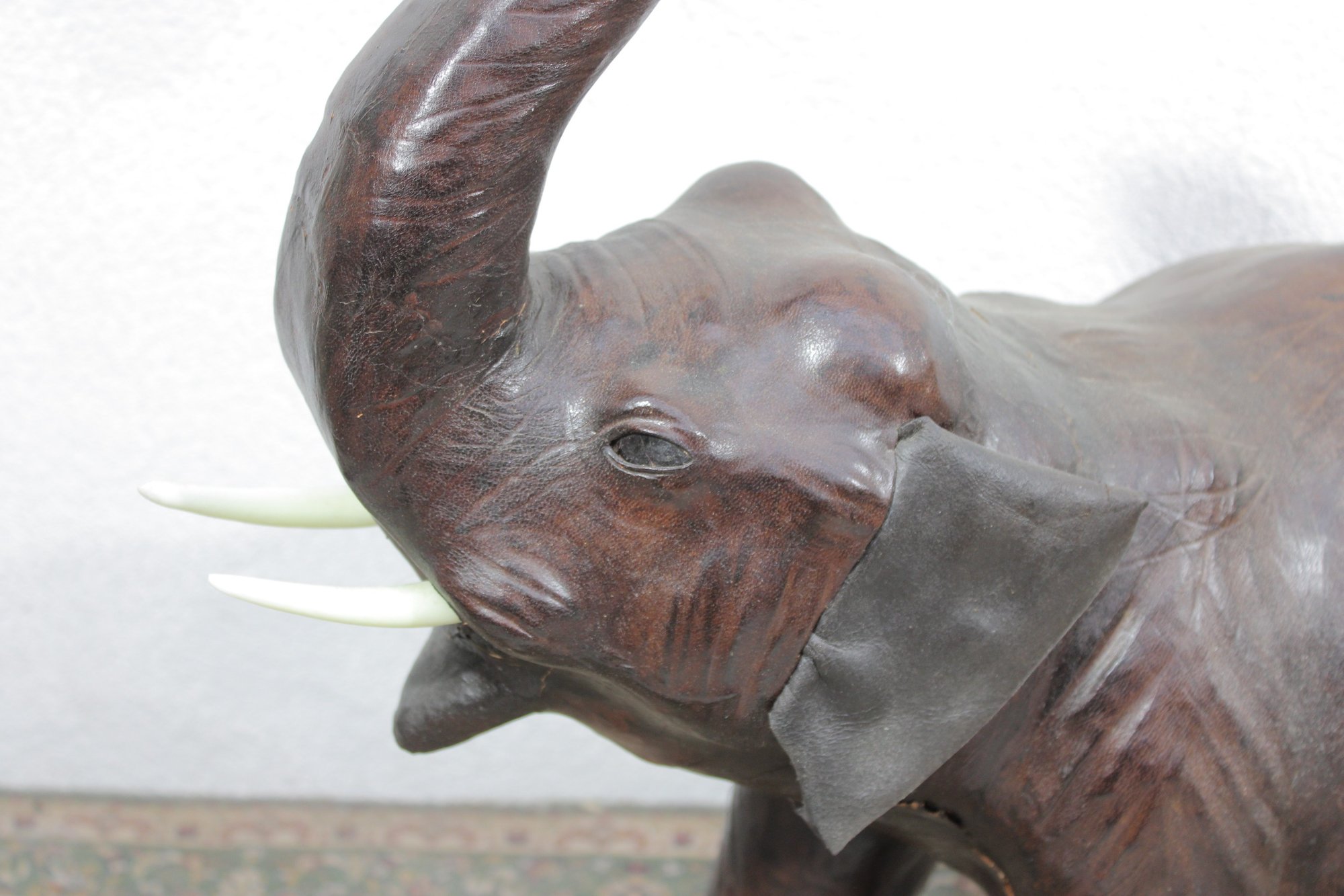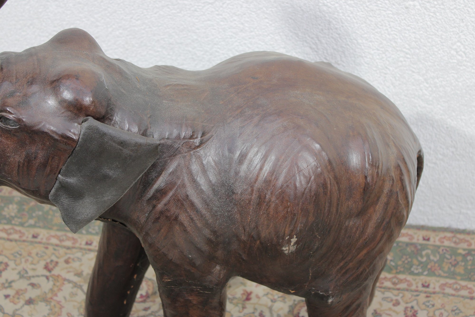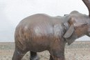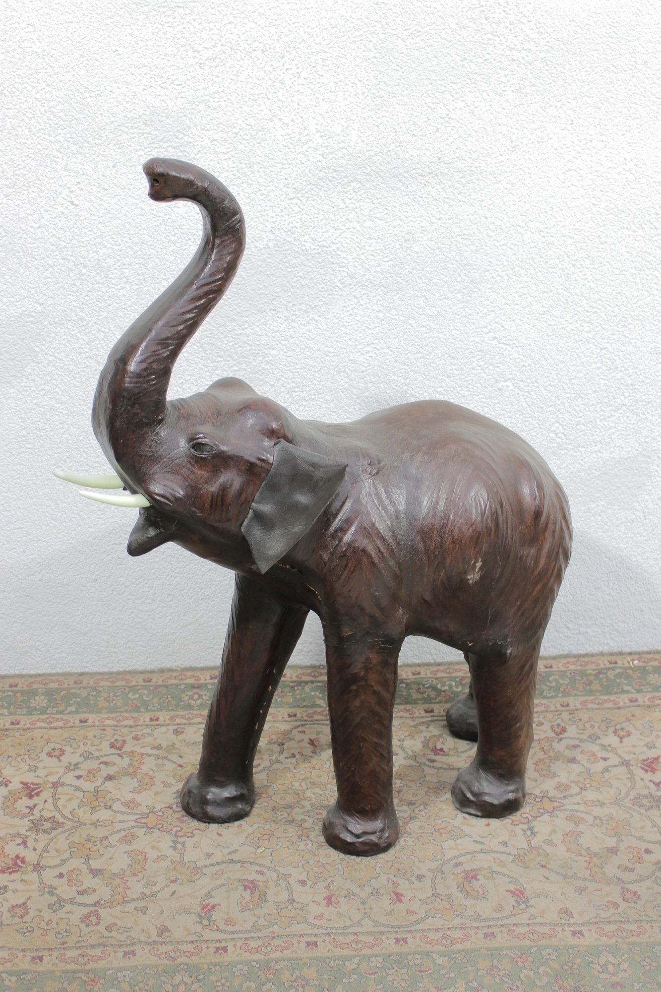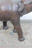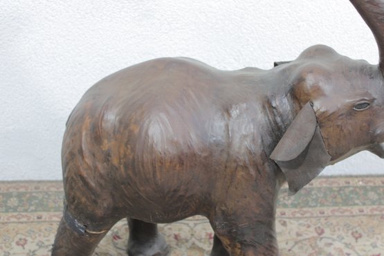The elephant is shown with raised trunk — a traditional symbol of good luck — and features sculpted body contours beneath the textured leather surface. The warm brown tones, visible grain, and handcrafted look give it a vintage, well-traveled character that fits beautifully into traditional, global-inspired, or eclectic interiors.