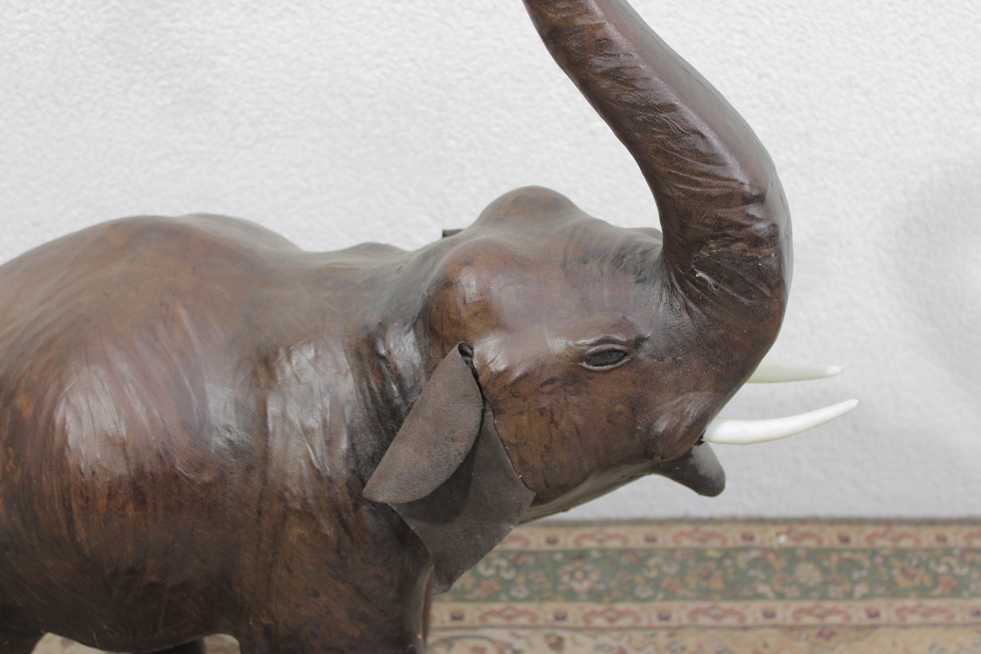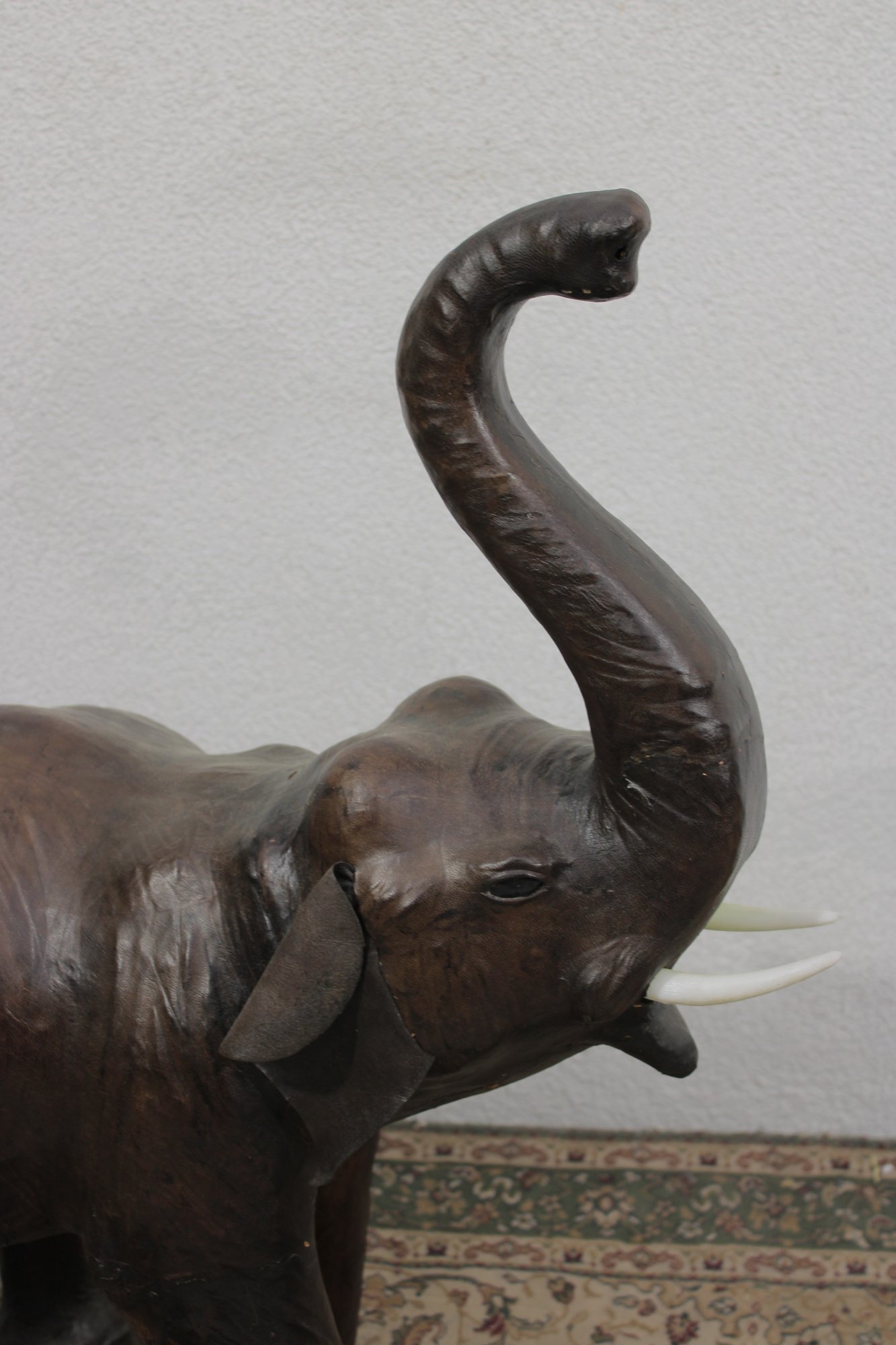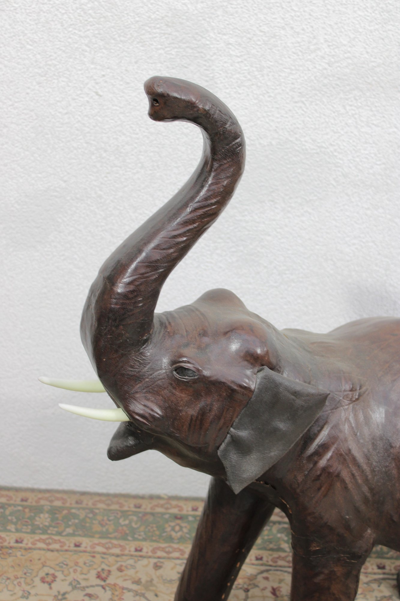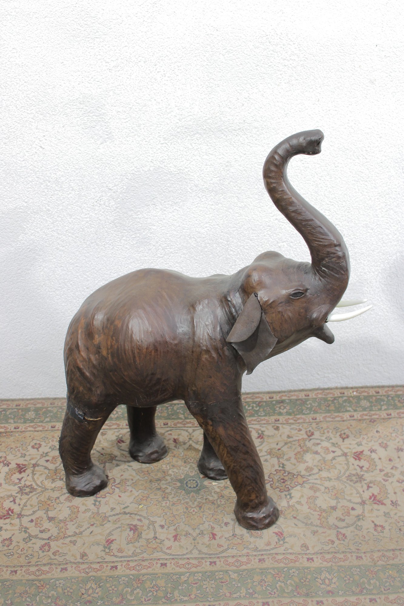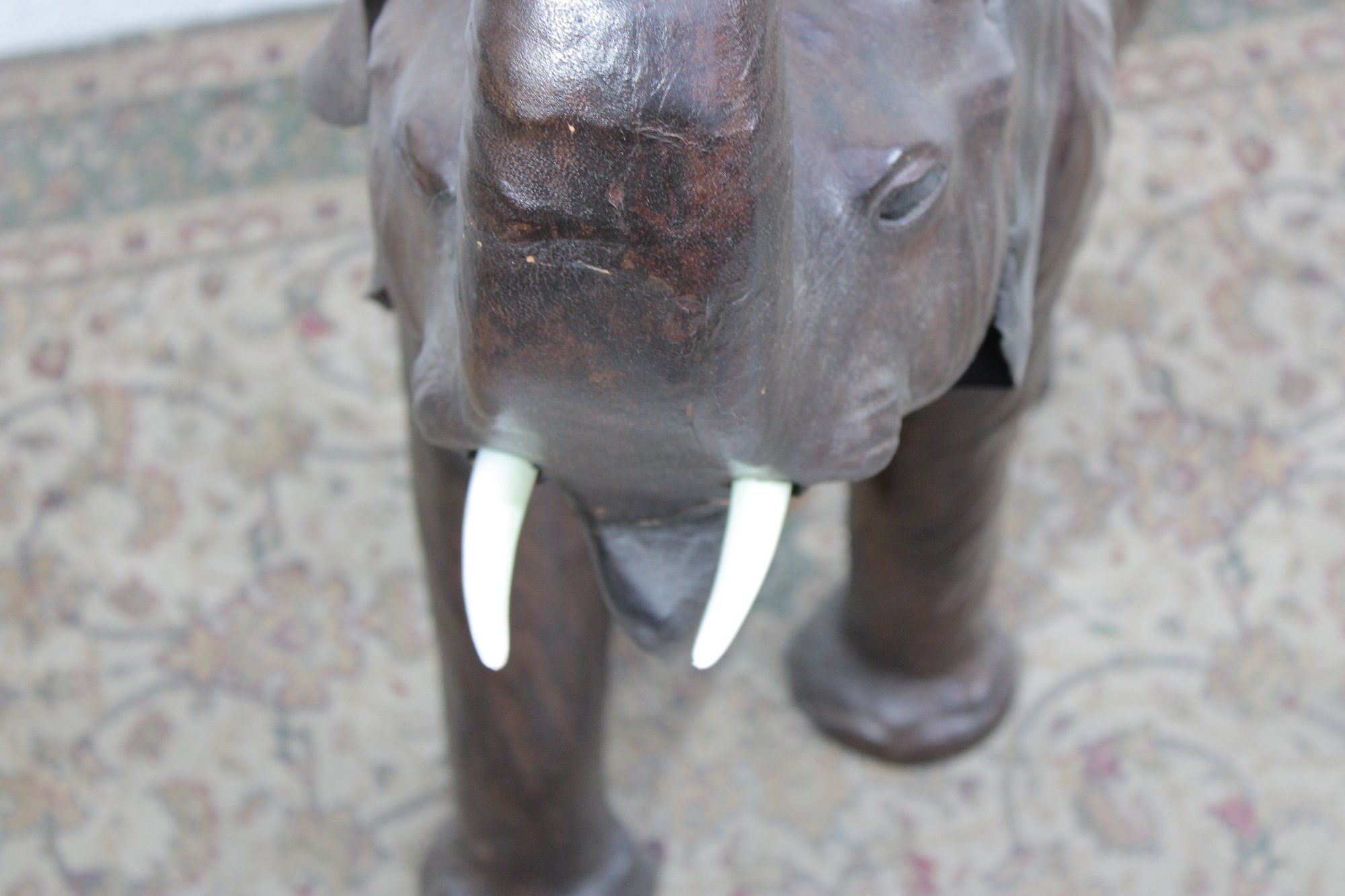 The elephant is shown with raised trunk — a traditional symbol of good luck — and features sculpted body contours beneath the textured leather surface. The warm brown tones, visible grain, and handcrafted look give it a vintage, well-traveled character that fits beautifully into traditional, global-inspired, or eclectic interiors.