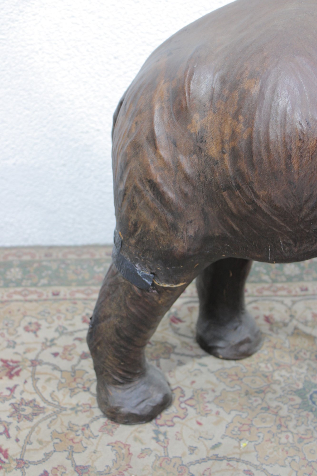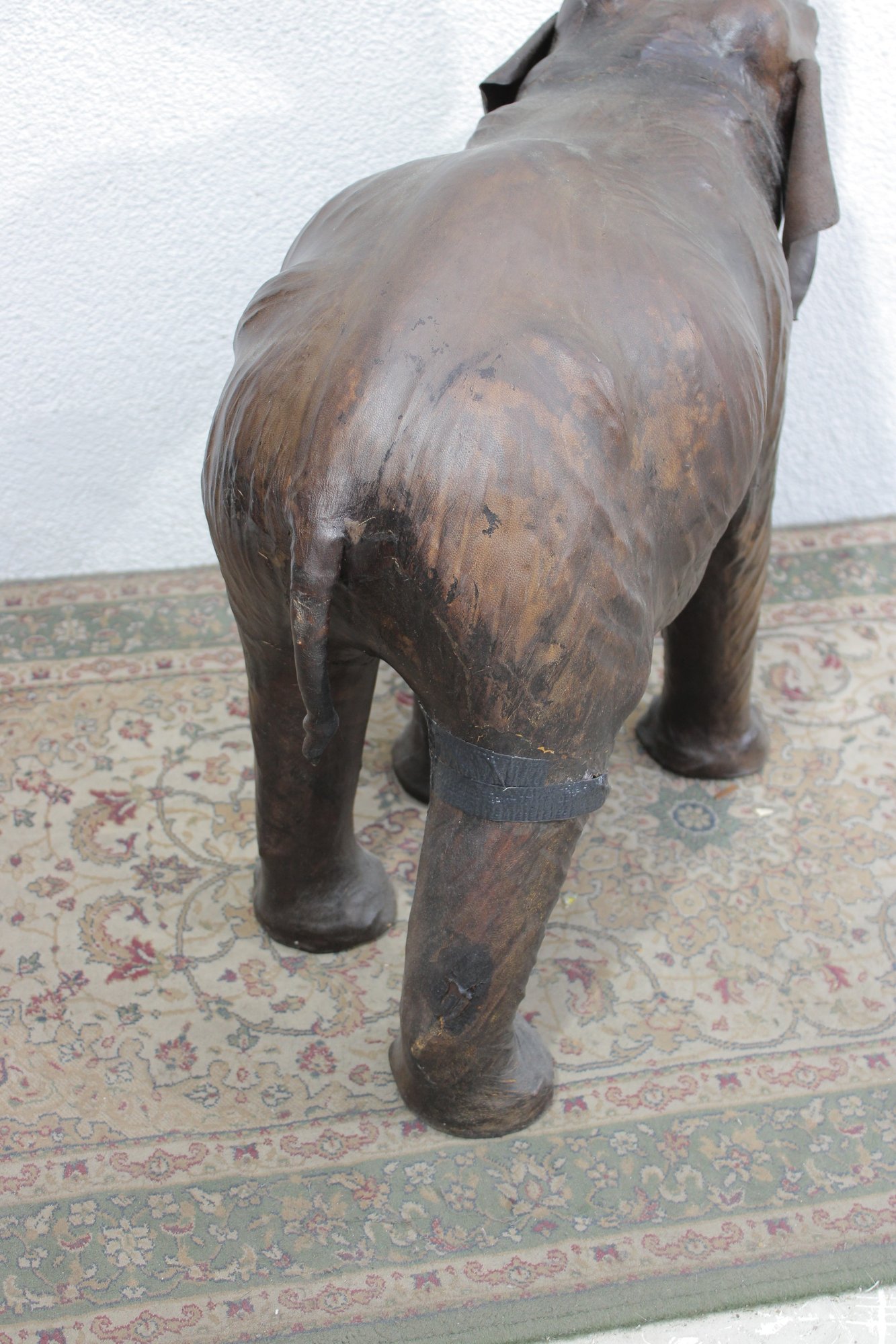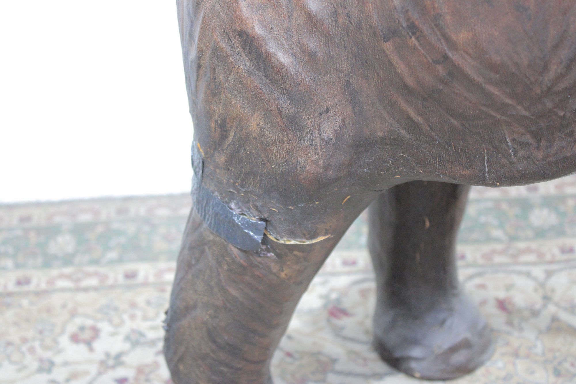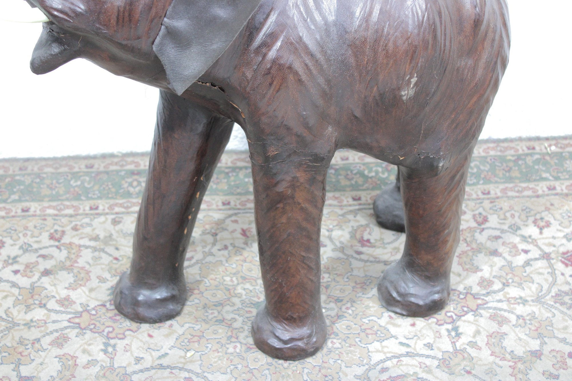 The elephant is shown with raised trunk — a traditional symbol of good luck — and features sculpted body contours beneath the textured leather surface. The warm brown tones, visible grain, and handcrafted look give it a vintage, well-traveled character that fits beautifully into traditional, global-inspired, or eclectic interiors.