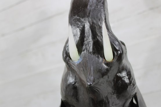Light-colored tusks provide contrast, and the defined ears, trunk, and body lines add depth while keeping a stylized decorative form.