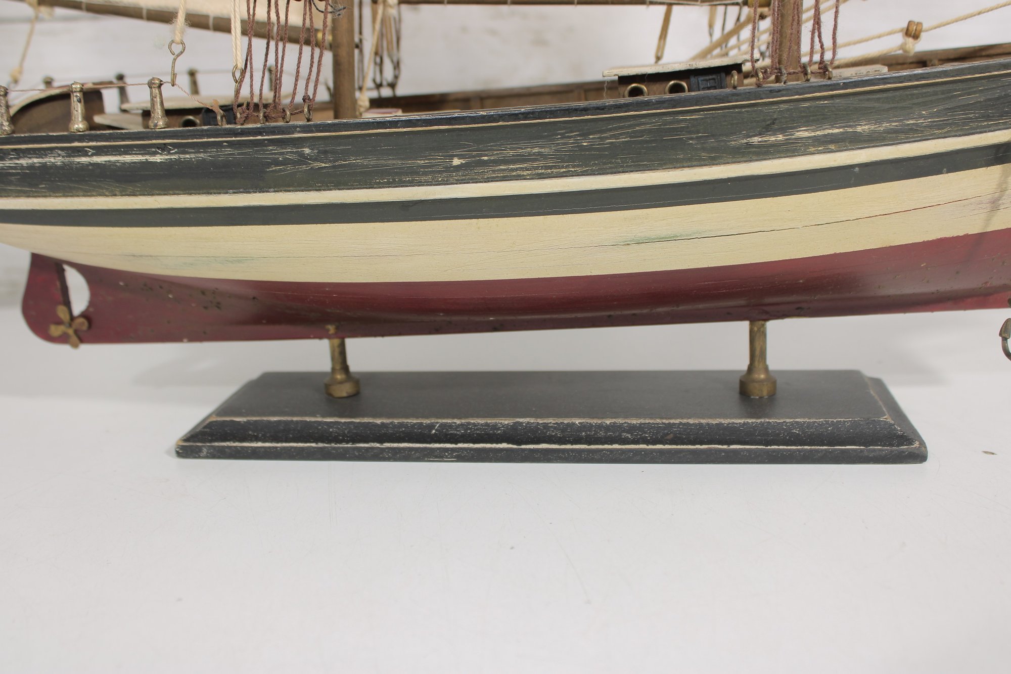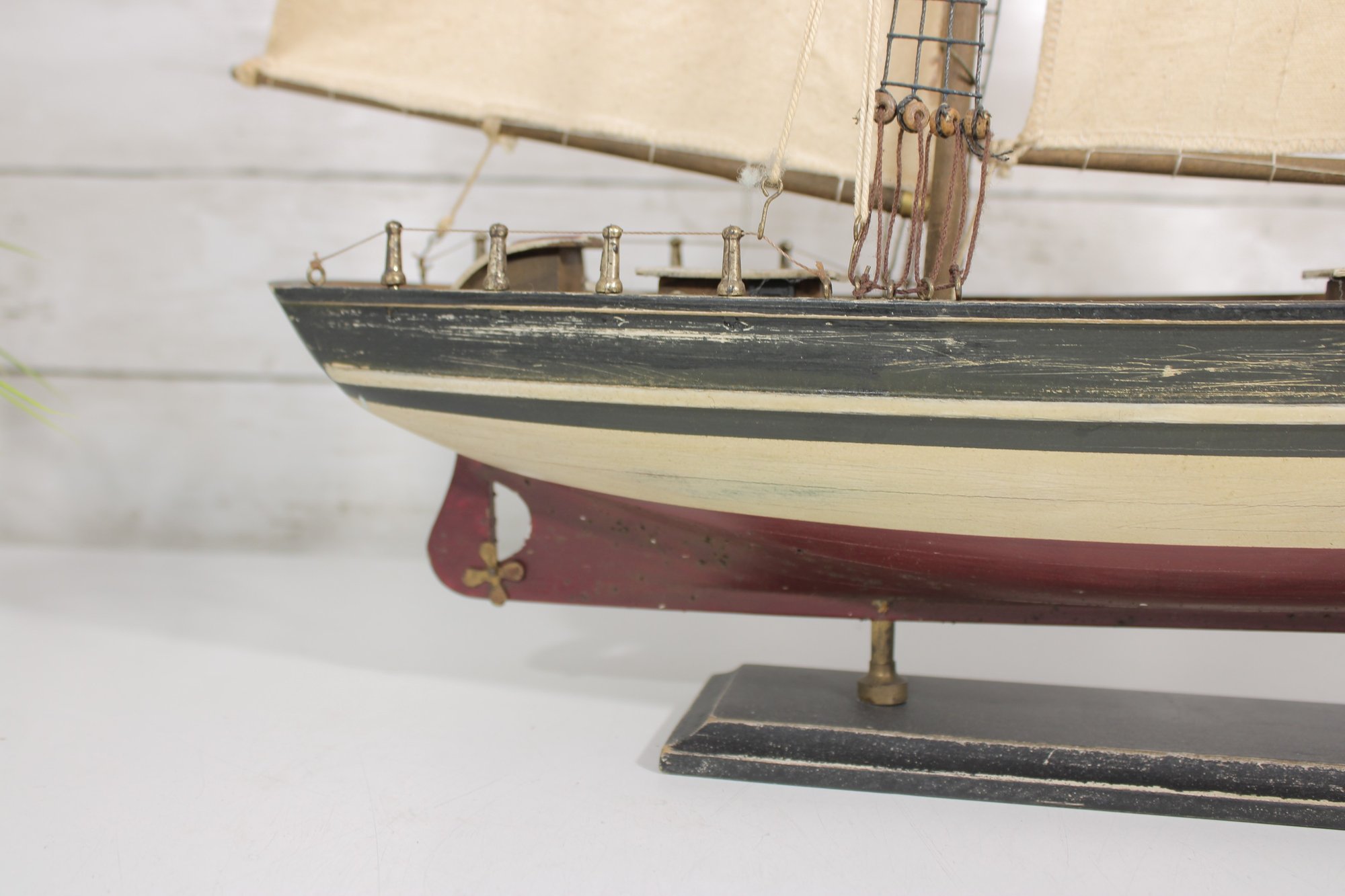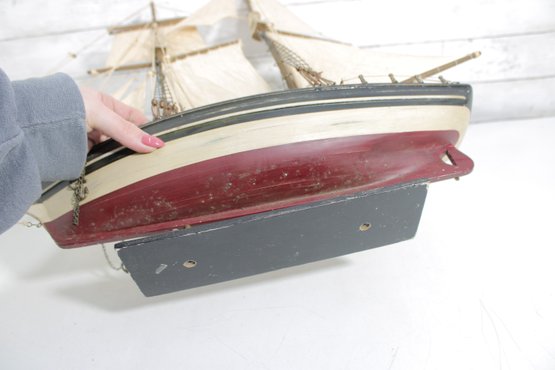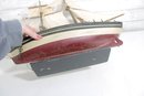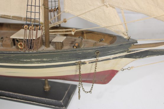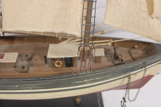 The wooden hull is painted in traditional nautical tones with a red underside and contrasting stripes, while the deck showcases fine details including lifeboats, ladders, railings, and miniature accessories. Metal chain accents and rigging further enhance the realism of the piece. The model is mounted on a sturdy display stand, making it ready for immediate display.