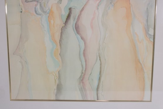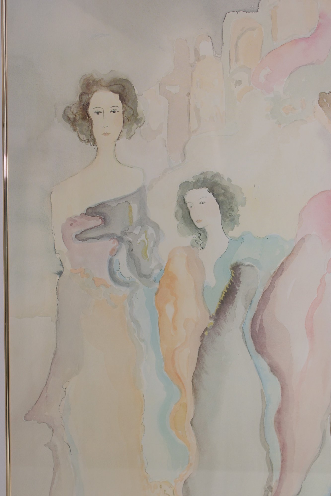 The figures are depicted in an elongated, fluid style, giving the piece a graceful and contemporary feel. The soft watercolor-like palette and abstract forms make this artwork ideal for modern, contemporary, or minimalist interiors.