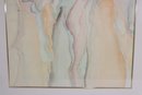 framed abstract figurative art print featuring three stylized female figures rendered in soft pastel tones. The artwork uses flowing lines and blended colors including peach, pink, gray, blue, and cream to create an elegant and modern composition.