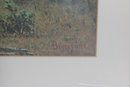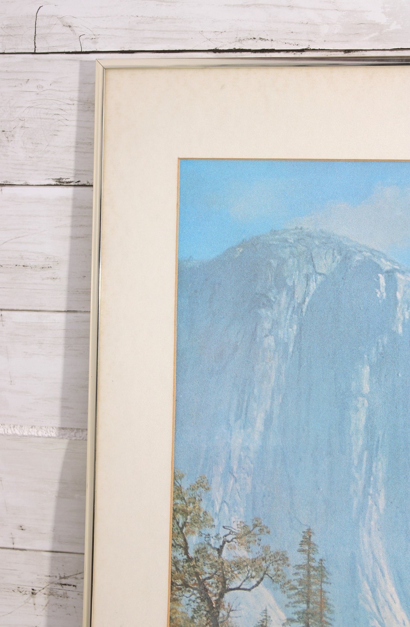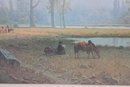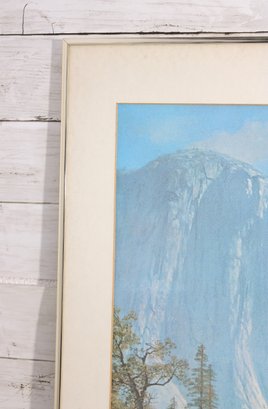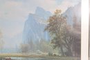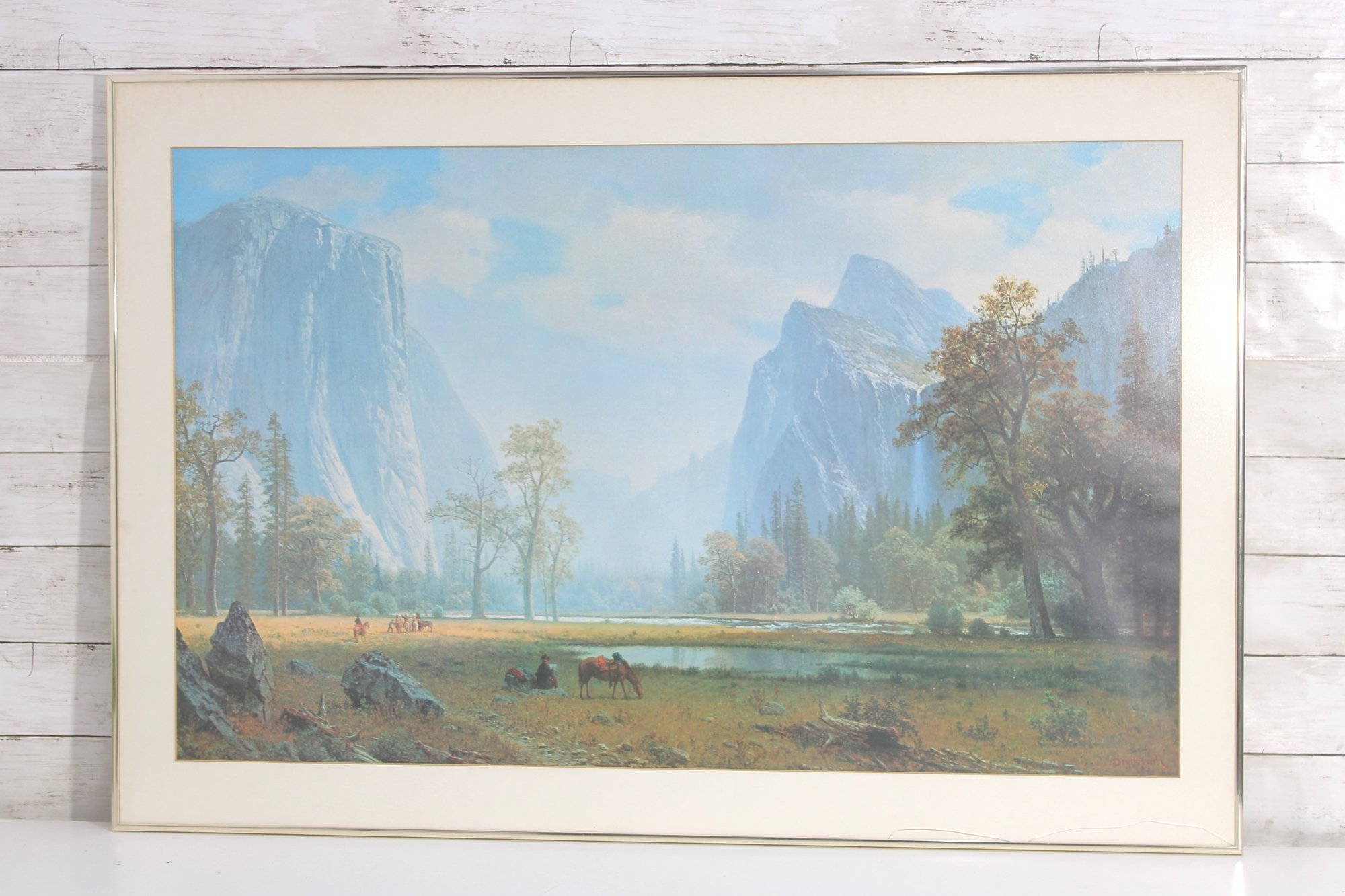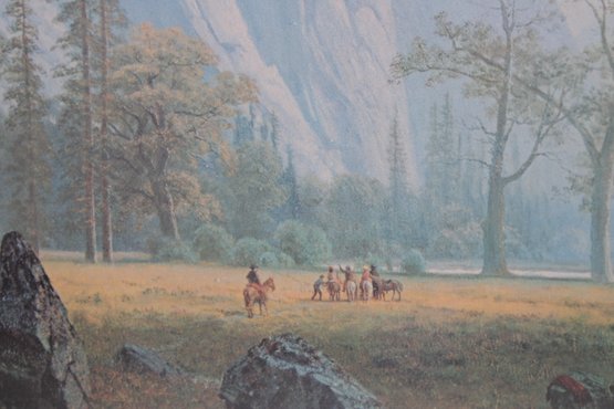 a large framed landscape print after Albert Bierstadt, one of the most celebrated painters of the American West. This beautiful reproduction depicts a serene Yosemite Valley scene with towering granite cliffs, a tranquil river, and a group of Native American riders and horses gathered in the meadow, capturing the romanticized wilderness landscapes Bierstadt was famous for.