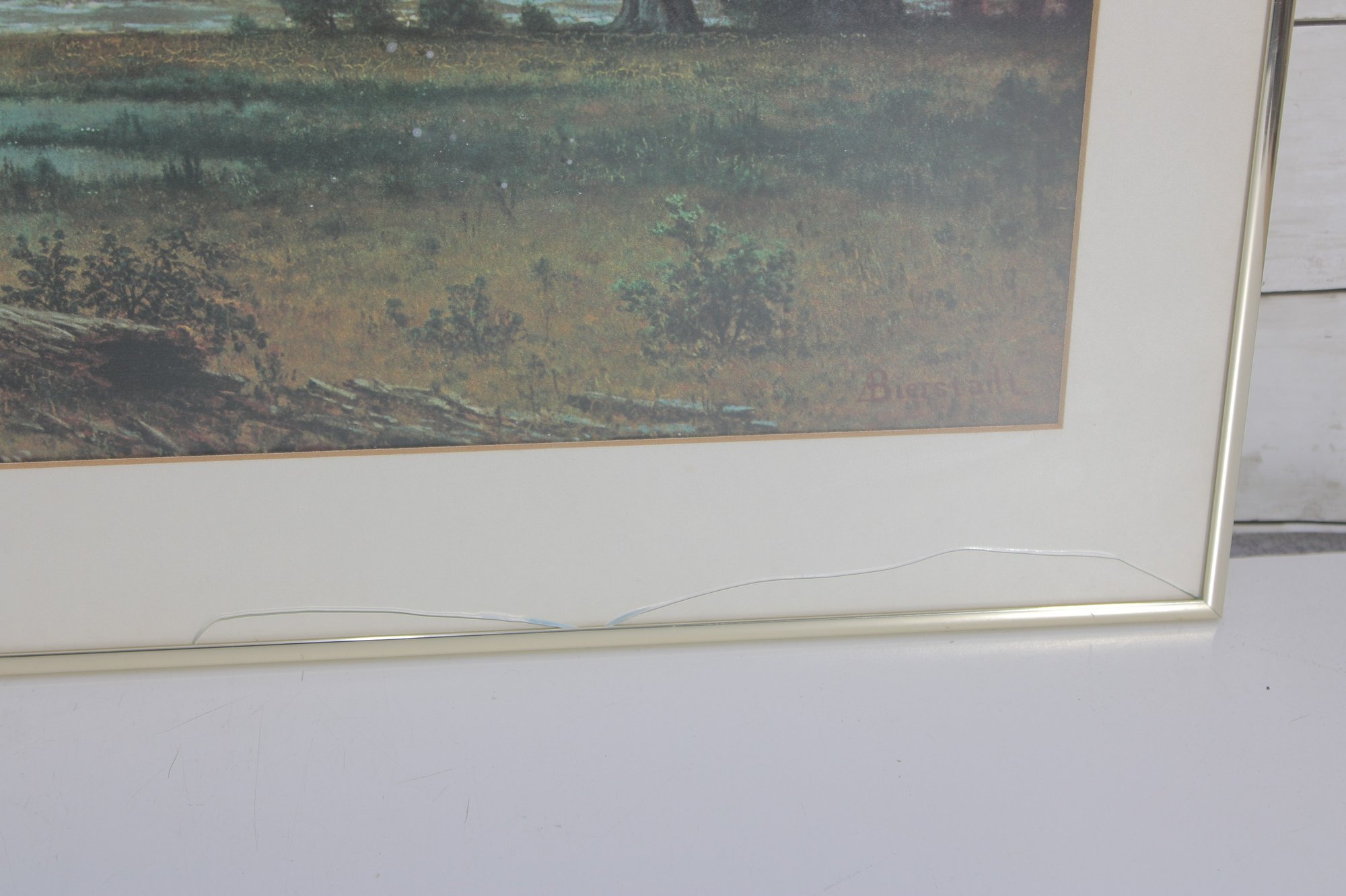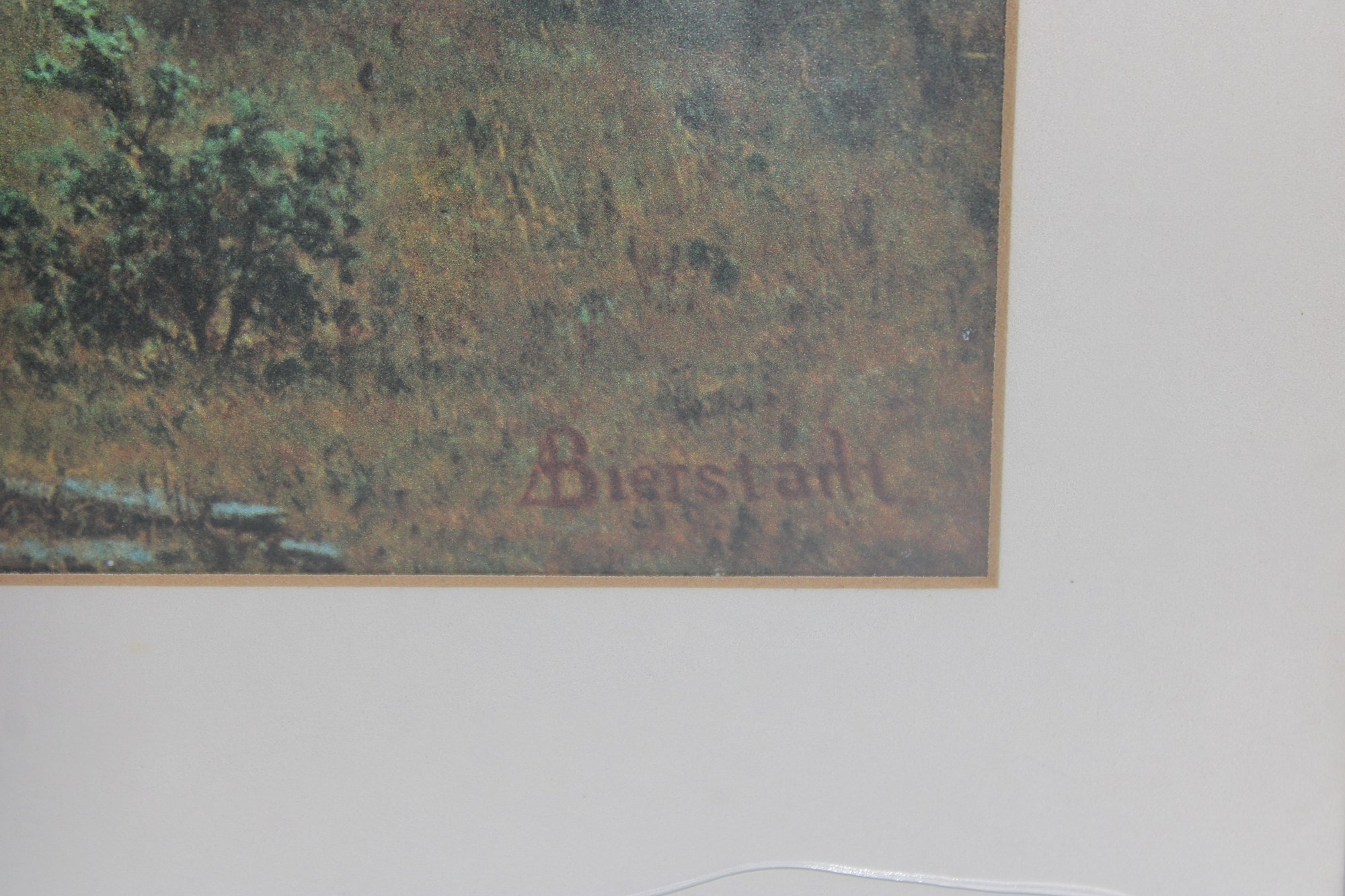 The print features soft atmospheric colors and impressive depth, highlighting distant mountains, towering trees, and expansive valley scenery. The artwork is signed in the plate “A. Bierstadt” in the lower corner.