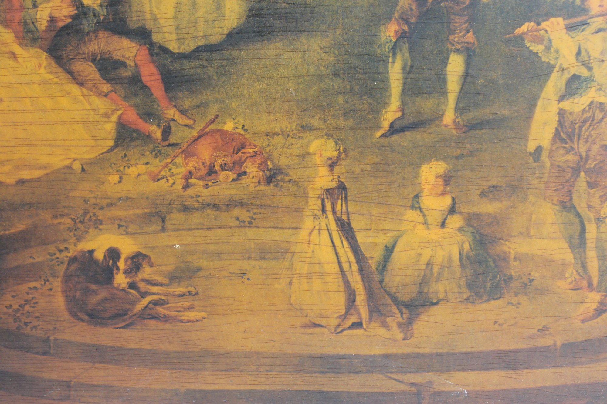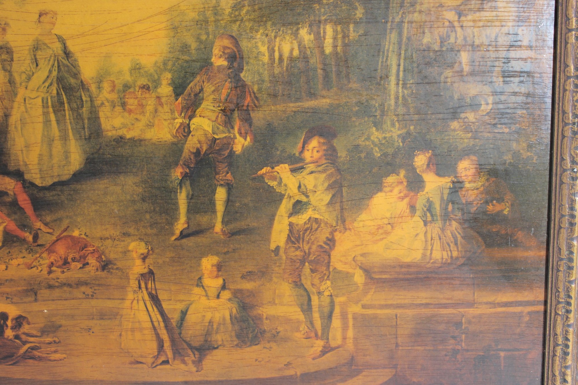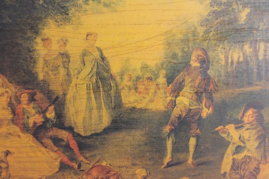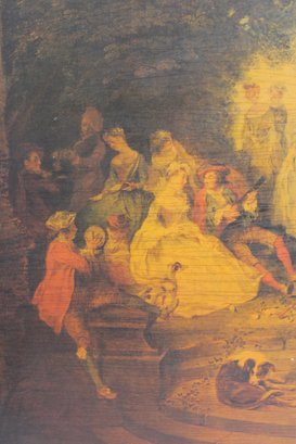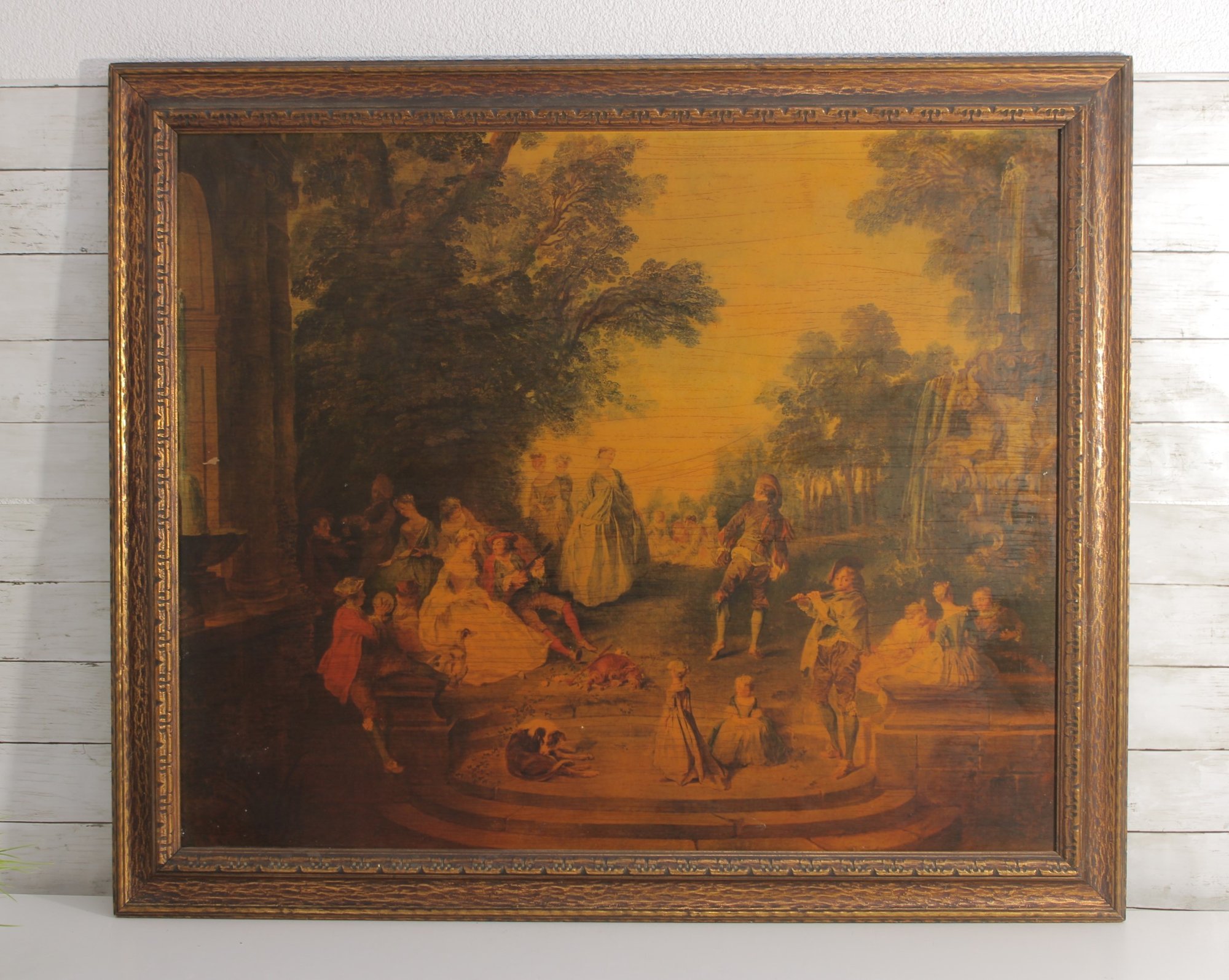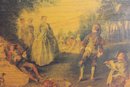 Impressive large framed print depicting a classical 18th-century style scene with figures in period dress gathered in an outdoor setting. The composition features elegantly dressed men, women, and children engaged in leisure activities, rendered in warm, rich tones.
