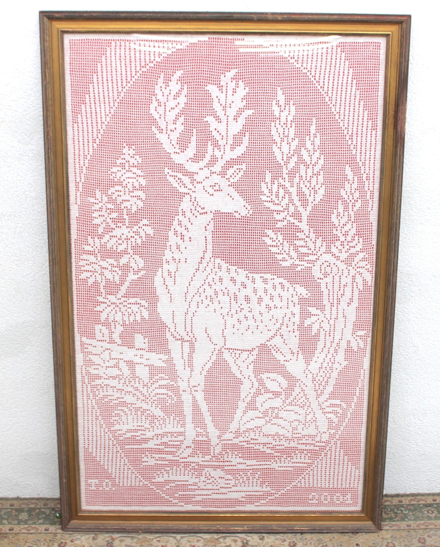Striking large-scale framed folk art textile featuring a majestic stag surrounded by trees and woodland scenery.