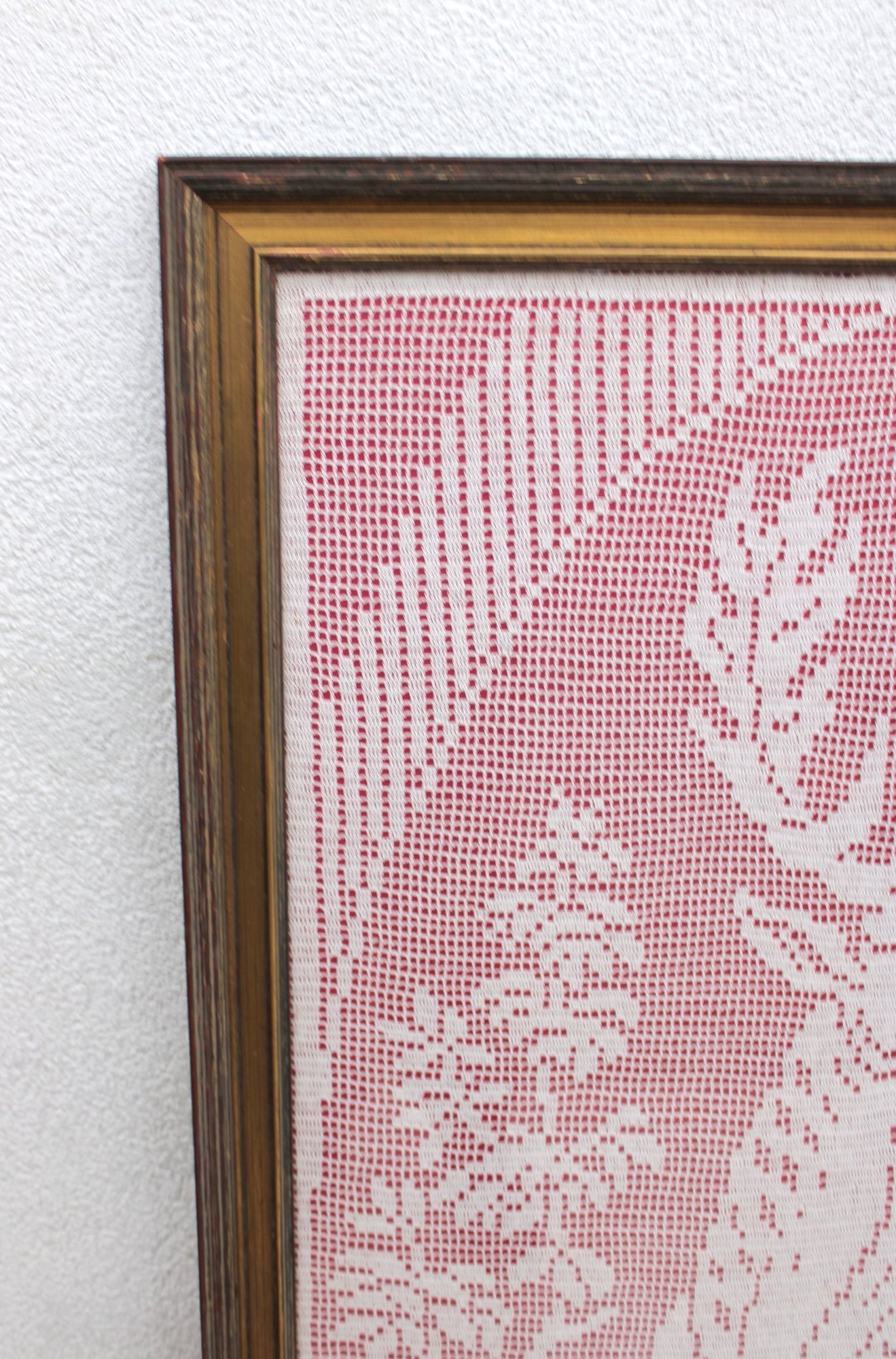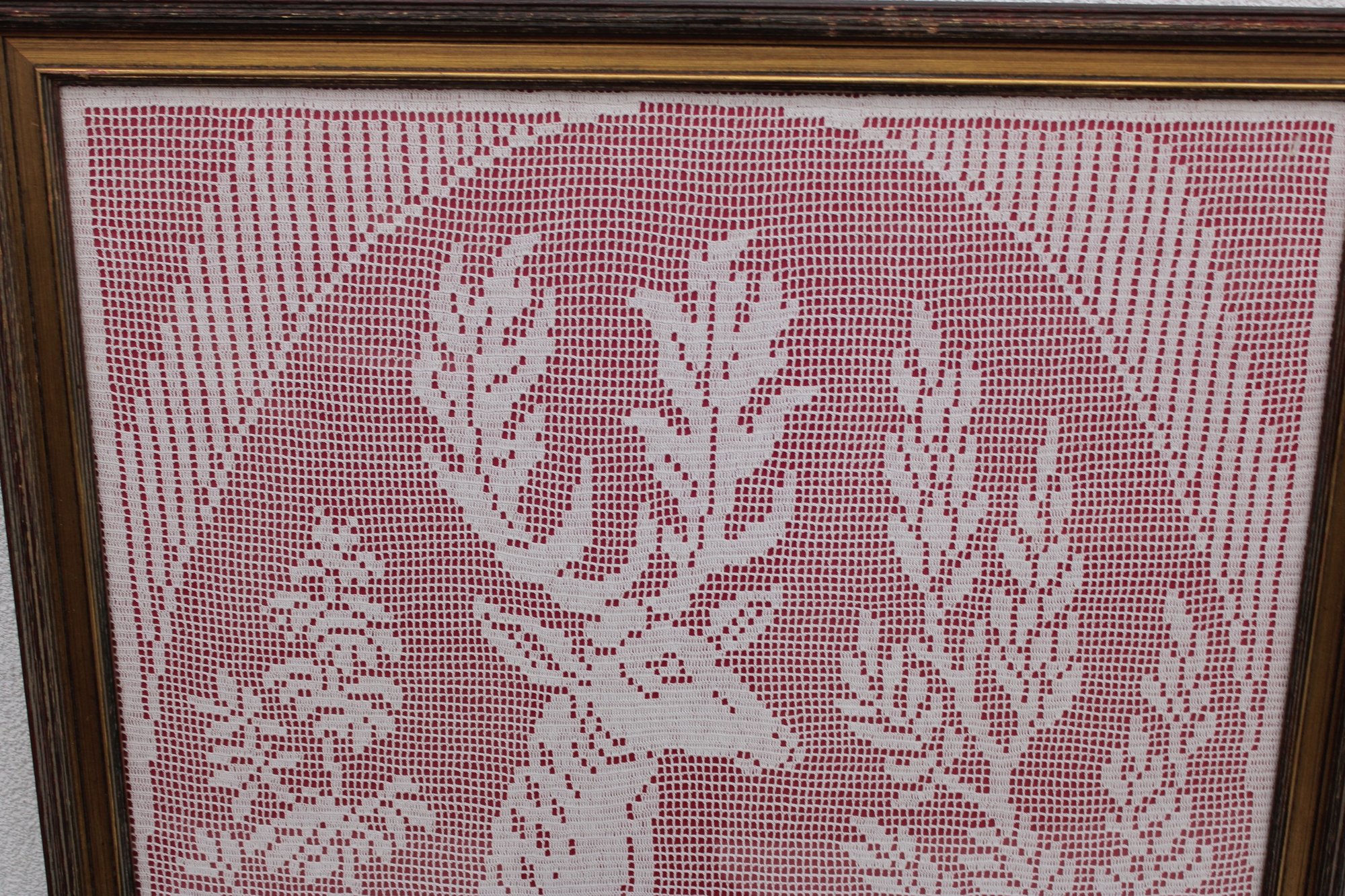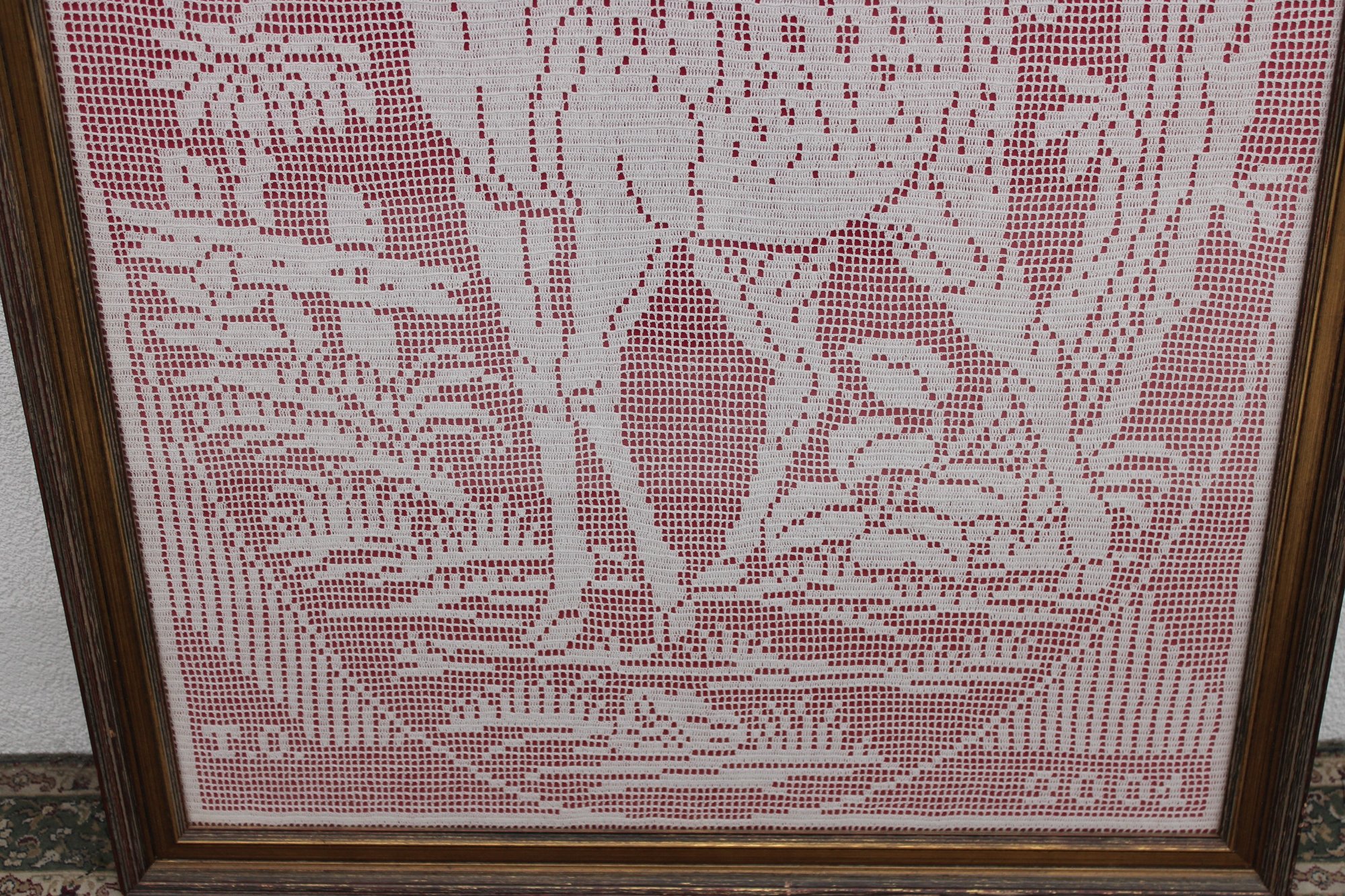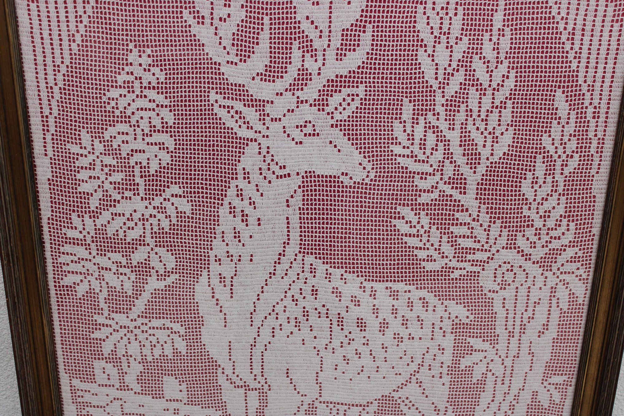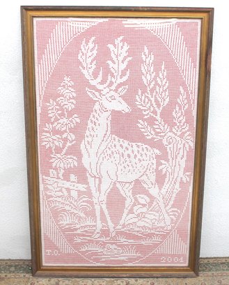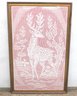 This impressive piece measures approximately 53" high x 33.5" wide and showcases a pink and white woven or needlework-style design. The central image depicts a detailed deer with prominent antlers, framed within an oval woodland motif. The intricate dot-pattern background and stylized trees give the piece a charming Scandinavian or European folk art aesthetic.