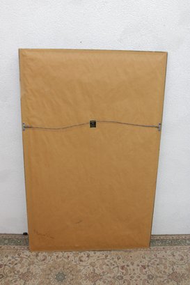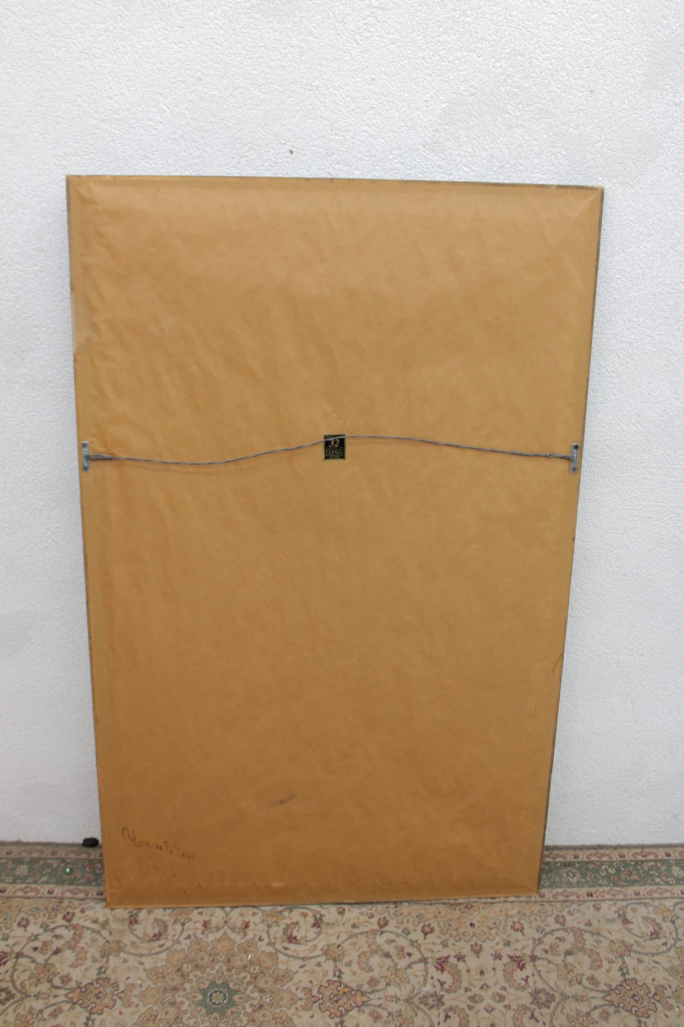 The textile is housed in a simple wood frame that complements the warm tones of the artwork. Its substantial size makes it a bold statement piece for a living room, lodge-style setting, cabin décor, nursery, or rustic-inspired interior.