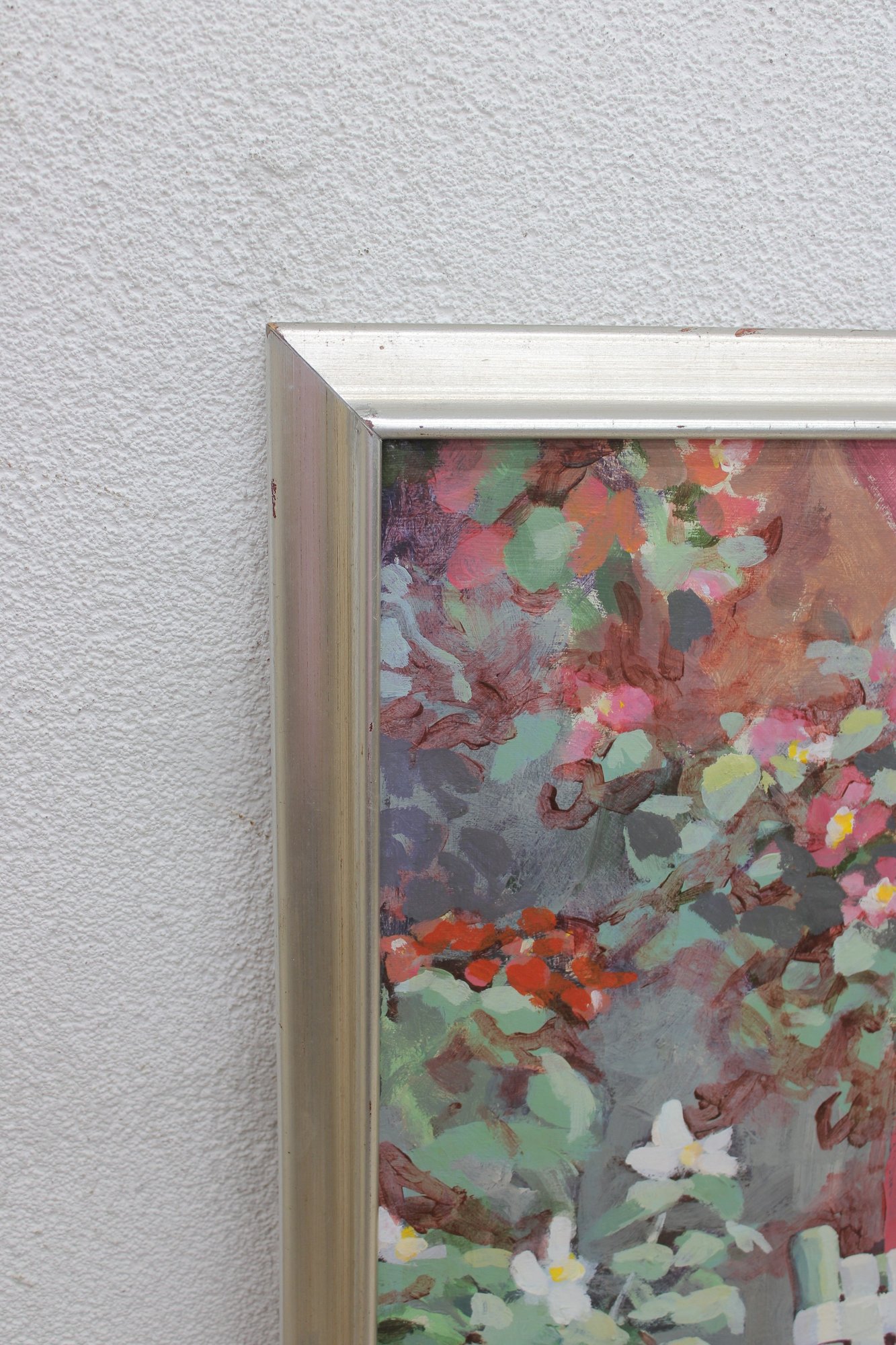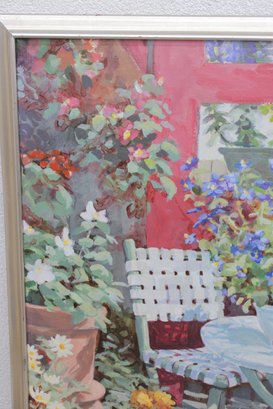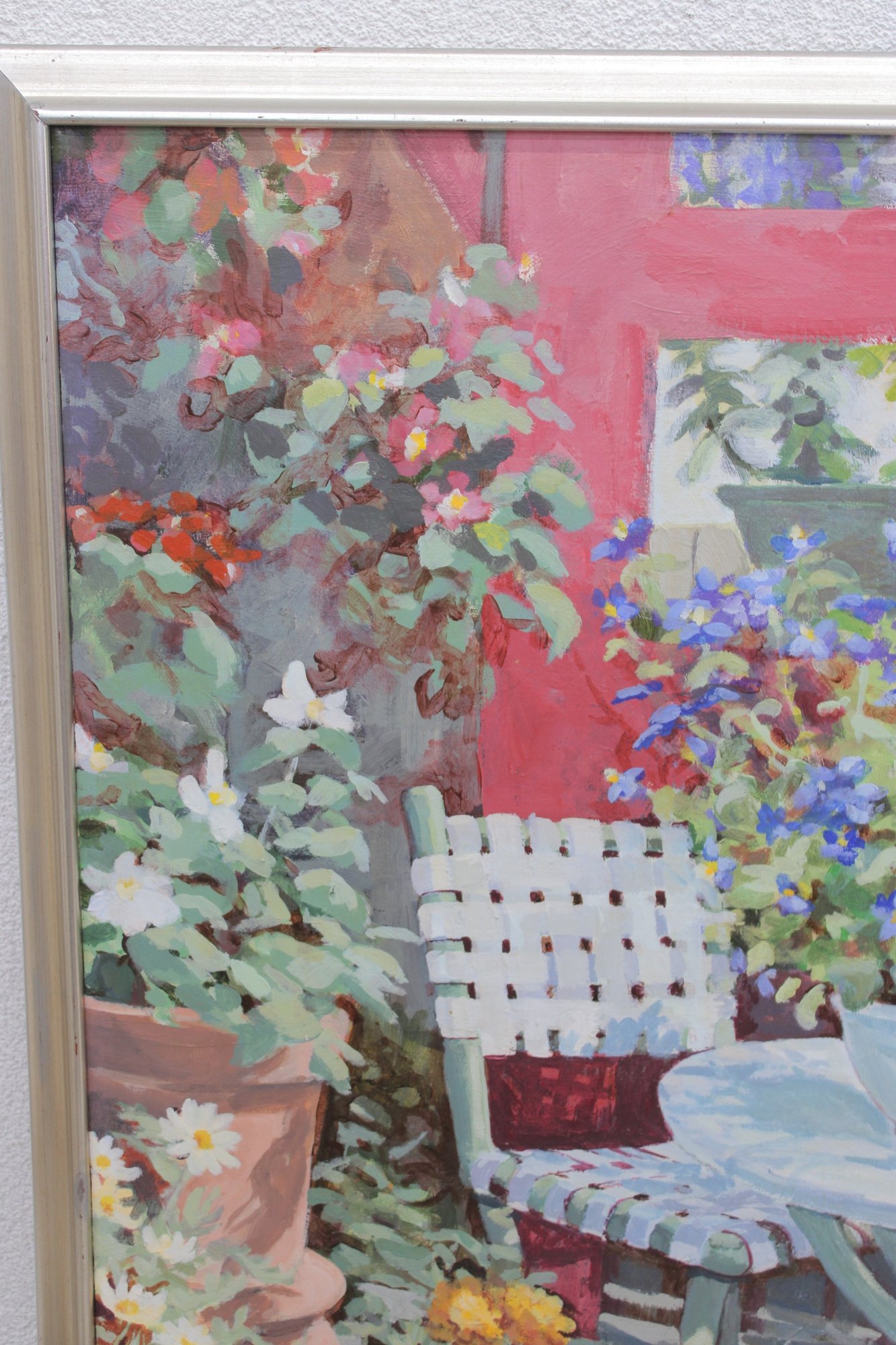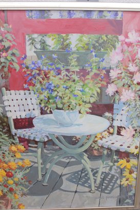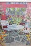 Beautiful large-scale framed print depicting a vibrant garden patio scene filled with lush flowers and greenery. The composition features a charming outdoor setting with a white table and chairs surrounded by blooming plants in rich, colorful tones of red, yellow, blue, and green. The lively brushwork and impressionistic style create a warm, inviting atmosphere.