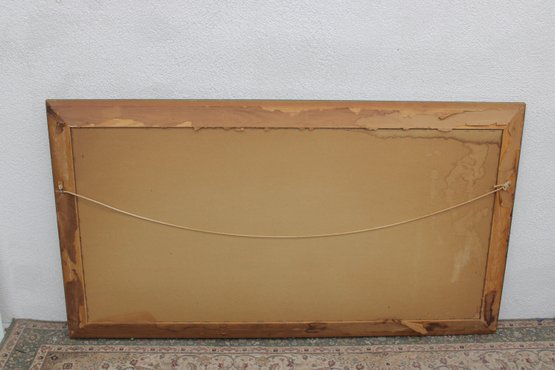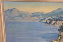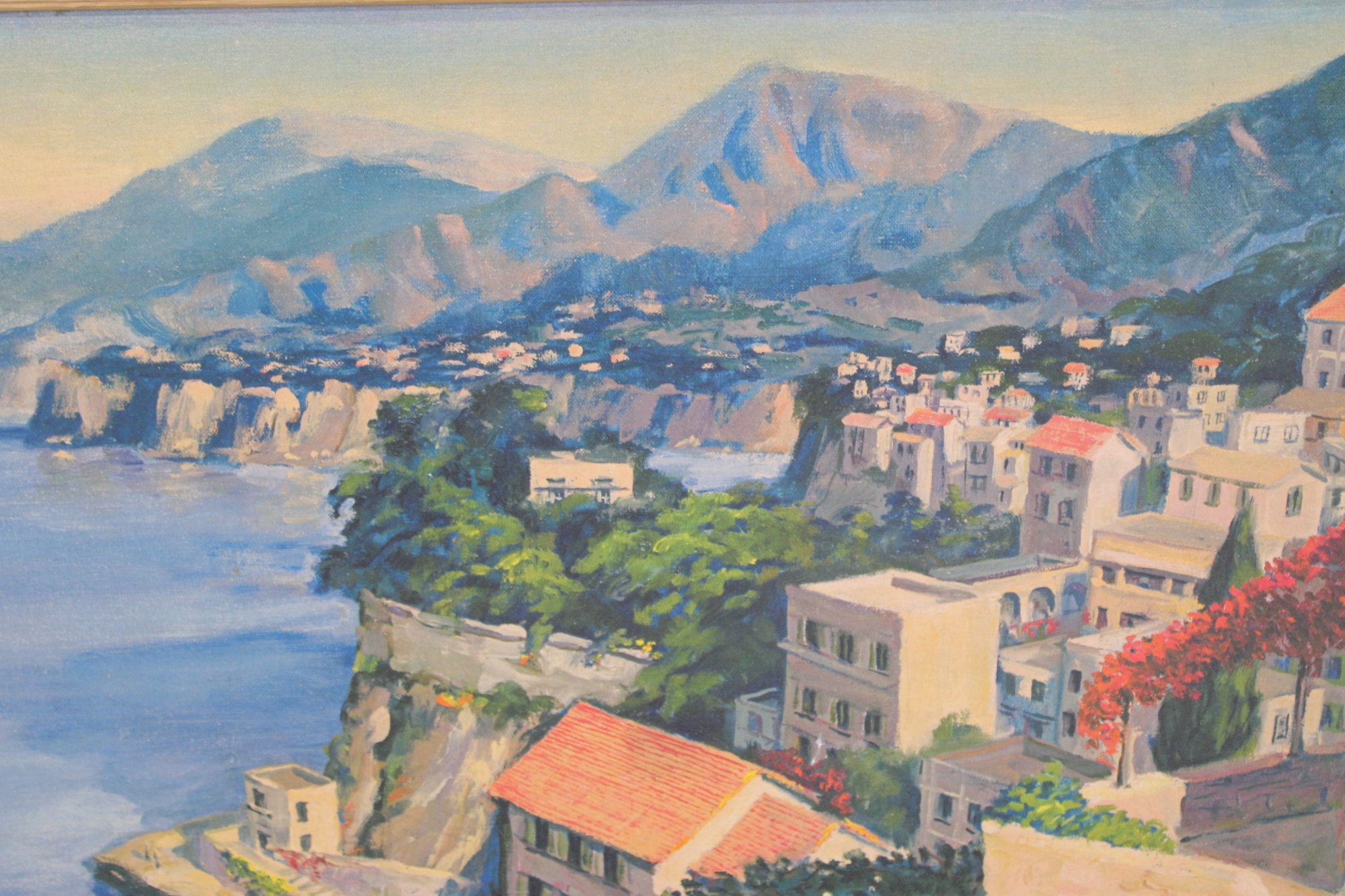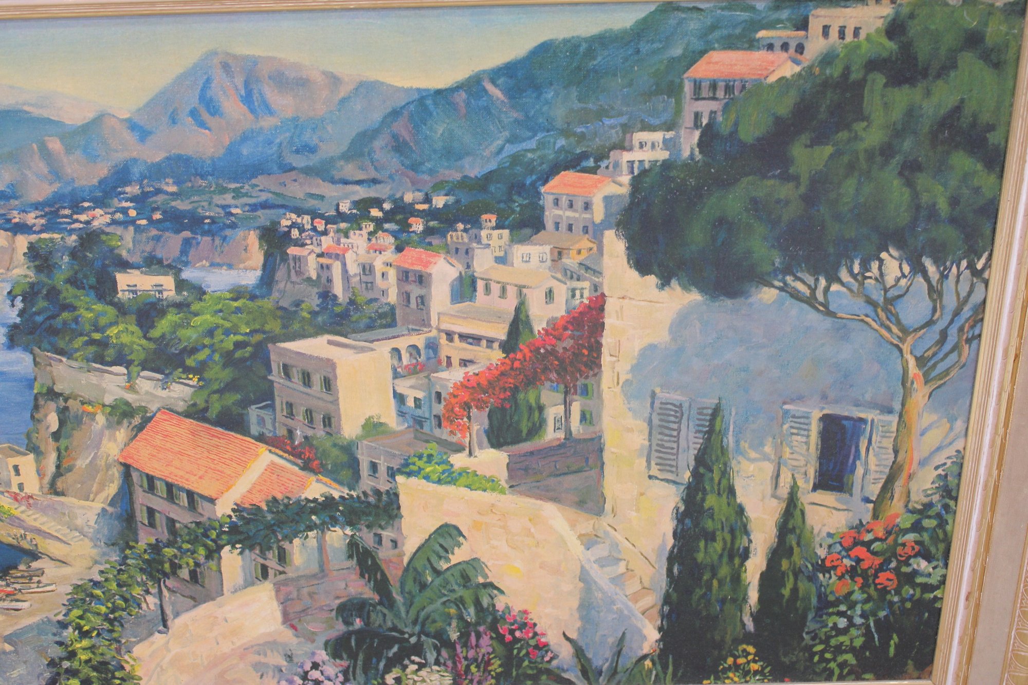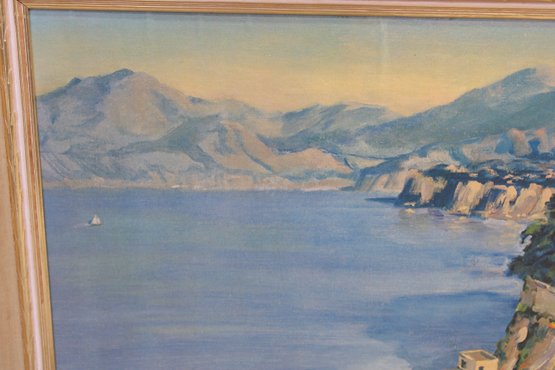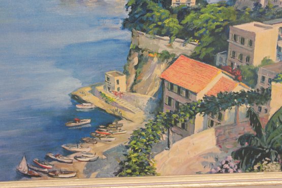 Beautiful large-scale framed Mediterranean coastal landscape print , measuring approximately 30" high x 54" wide.