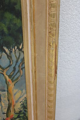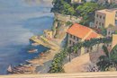 The composition evokes the charm of the Italian or French Riviera, with warm sunlit tones and rich blues that make this an eye-catching statement piece. The painting is housed in a decorative gold-tone frame that complements the warmth of the landscape.