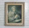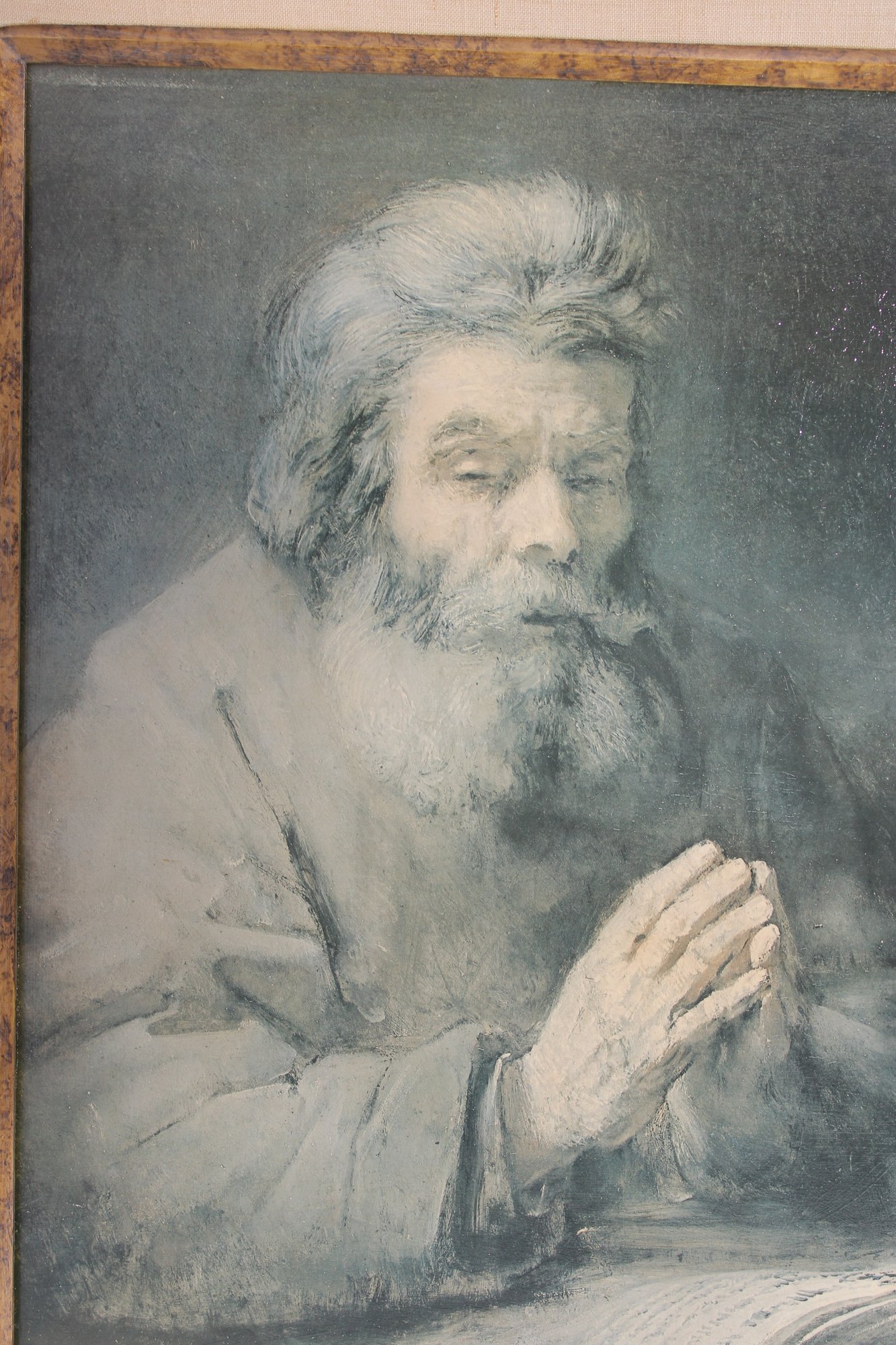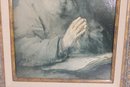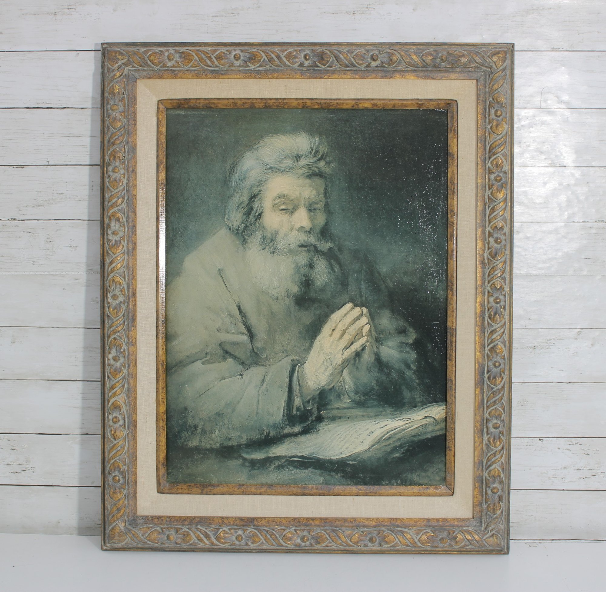This powerful framed art print depicts a solemn, bearded man in prayer, hands gently clasped over an open book. Rendered in soft, moody tones, the image conveys deep emotion and quiet reverence, making it a striking and contemplative piece for any space. The expressive detail in the face and hands draws the viewer in, evoking a sense of reflection and spiritual calm.