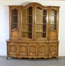 The lower portion of the unit offers spacious storage with four cabinet doors that open to reveal additional shelving and drawers, perfect for storing dining essentials or household items. The intricate detailing, soft curved lines, and cabriole legs are classic hallmarks of the French Provincial aesthetic. The warm wood tones and smooth finish bring a sophisticated yet inviting feel to any space.