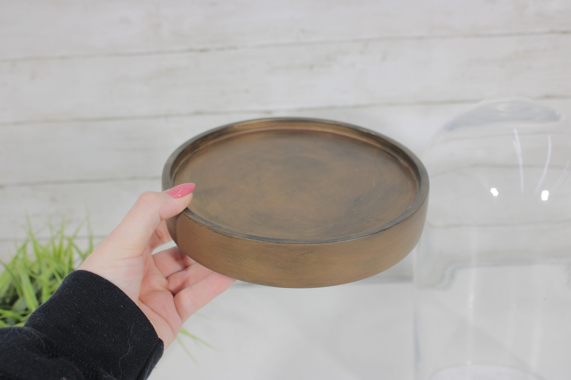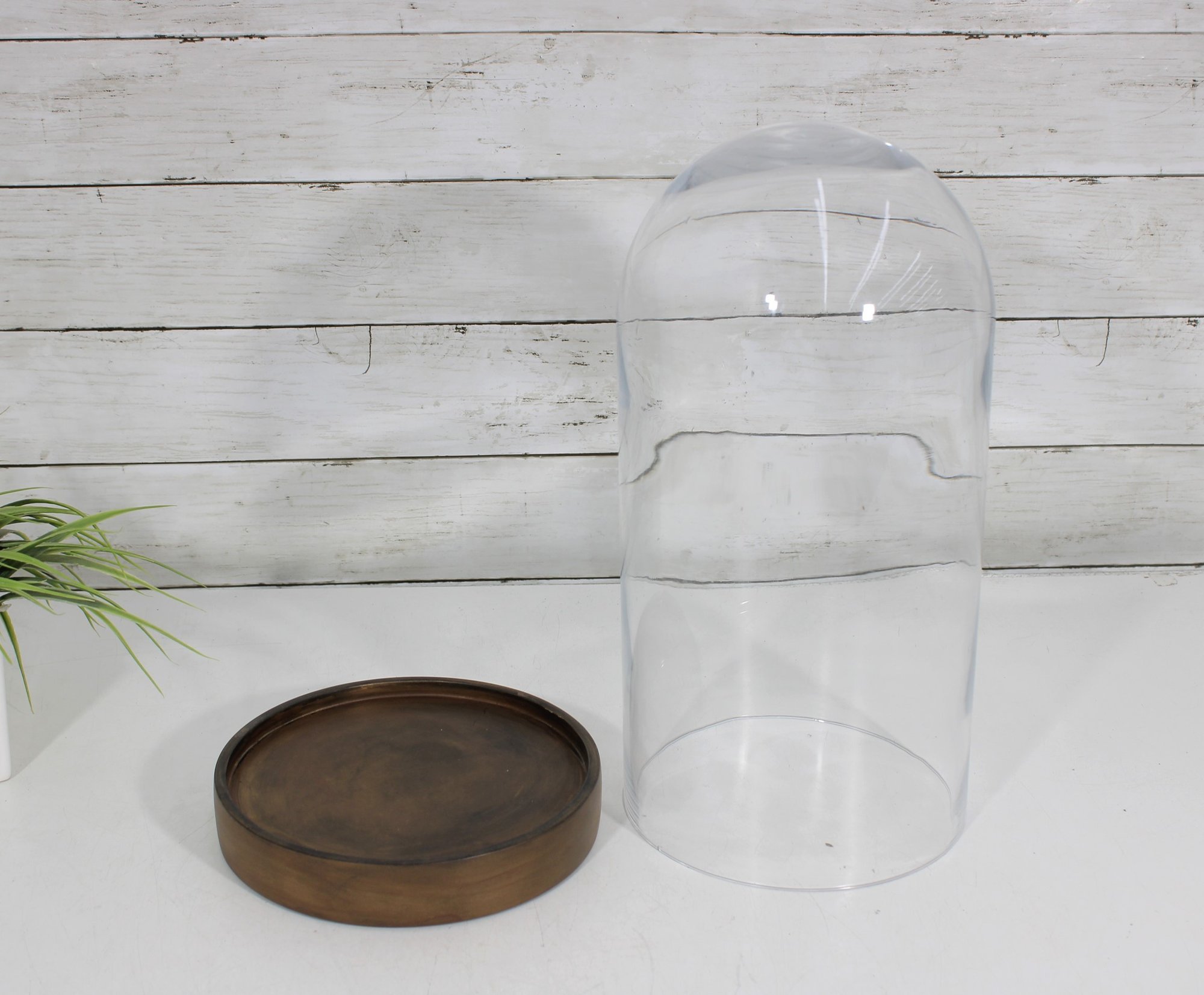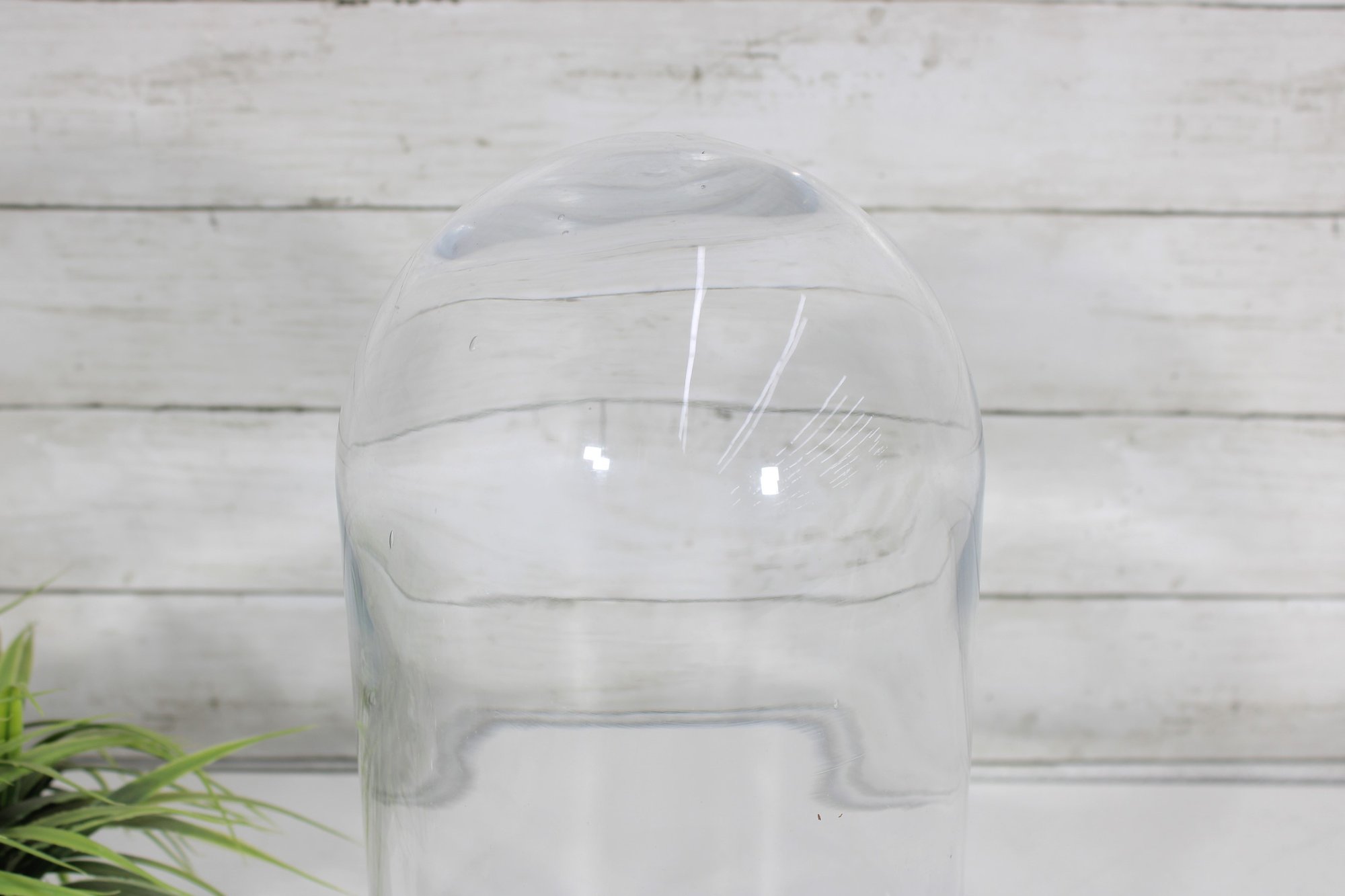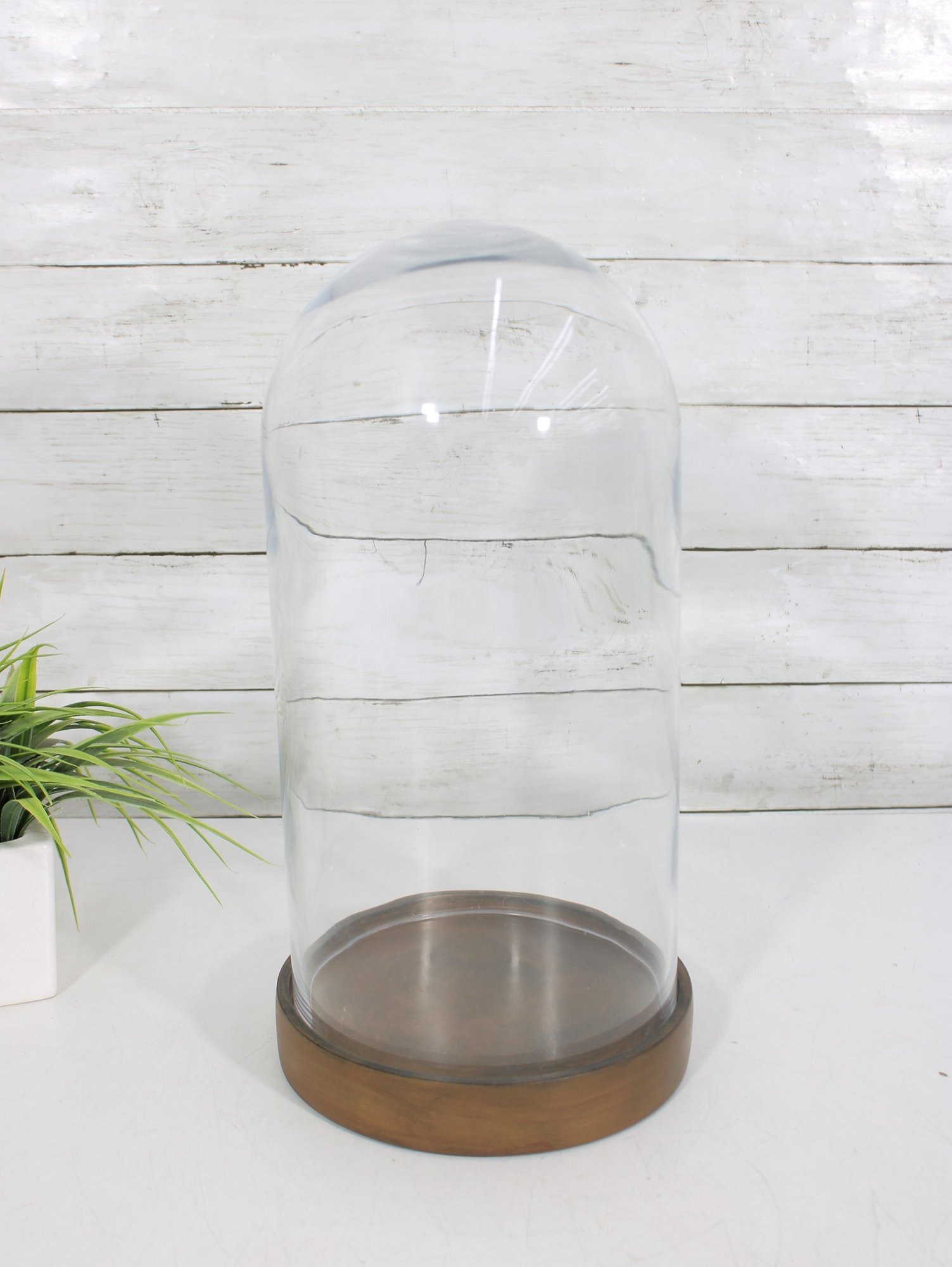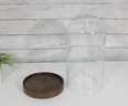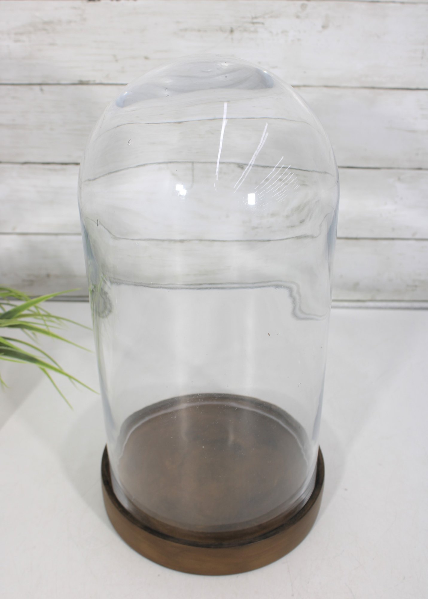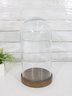 a large glass cloche display dome with wooden base, perfect for showcasing collectibles, decorative objects, plants, or curiosities. The clear glass dome allows for full visibility while protecting displayed items from dust.