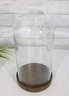 The cloche measures approximately 15 inches tall and 7.5 inches in diameter and sits on a round wooden base with a warm natural finish. The glass dome lifts off easily for arranging or changing display items.