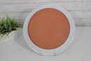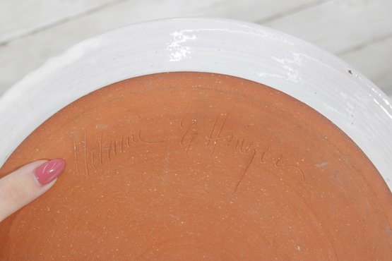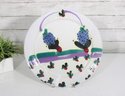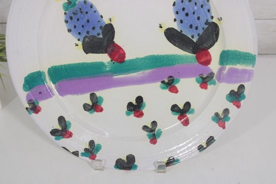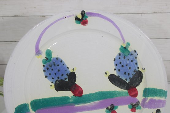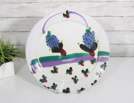 Measuring approximately 14 inches in diameter, this eye-catching platter is crafted from terracotta with a glazed front and natural clay underside. The artwork is rendered in soft yet vibrant tones of purple, green, black, and red, giving it a cheerful and rustic appeal.