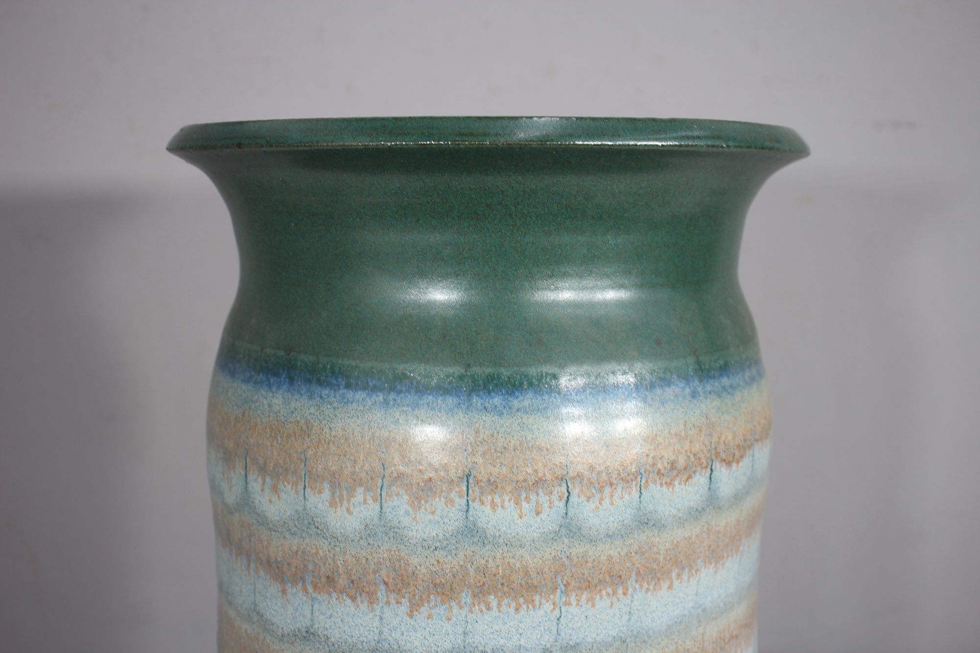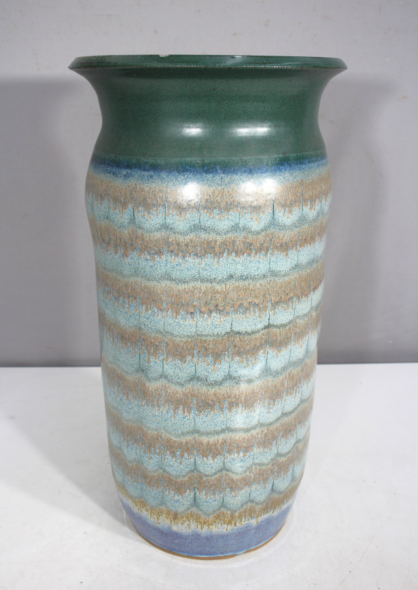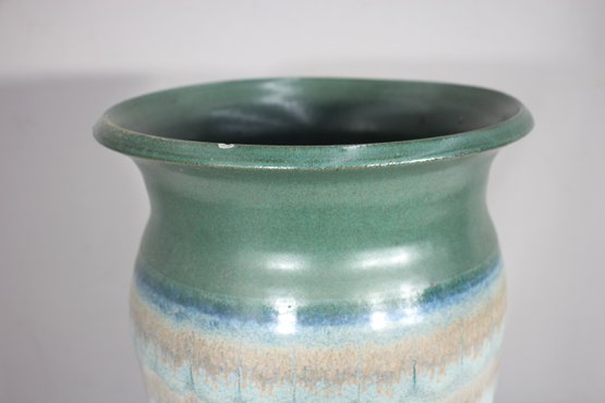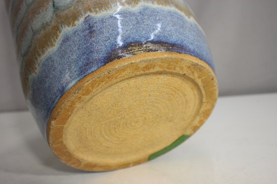 This beautiful handcrafted ceramic umbrella stand / Vase features an elegant combination of earthy greens, soft blues, and warm beige tones, creating a mesmerizing layered glaze effect. The 20-inch tall cylindrical form is both functional and decorative, making it an ideal piece for entryways or covered patios.
