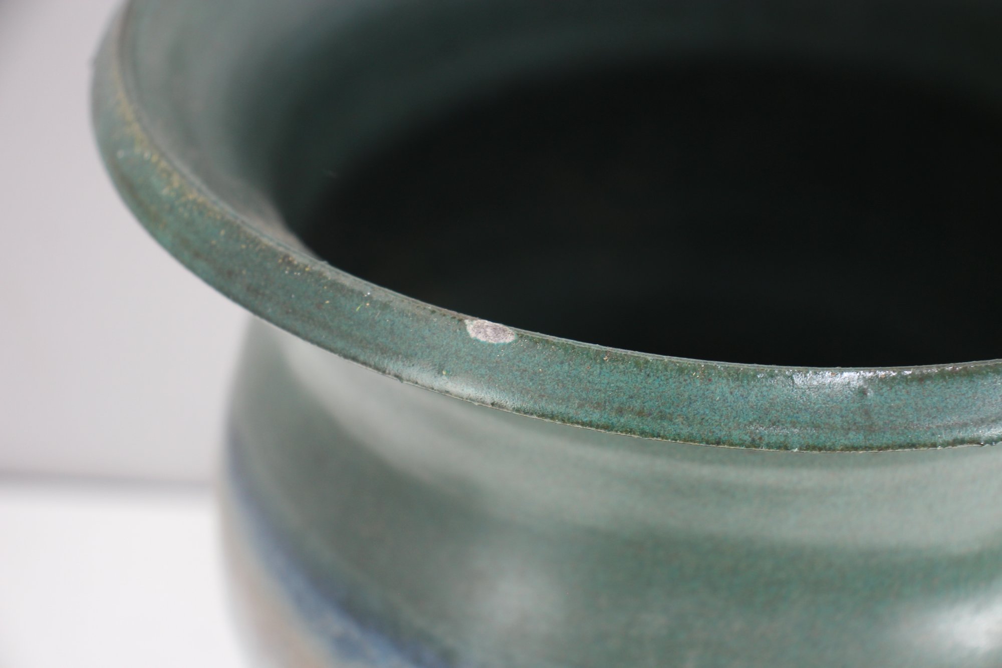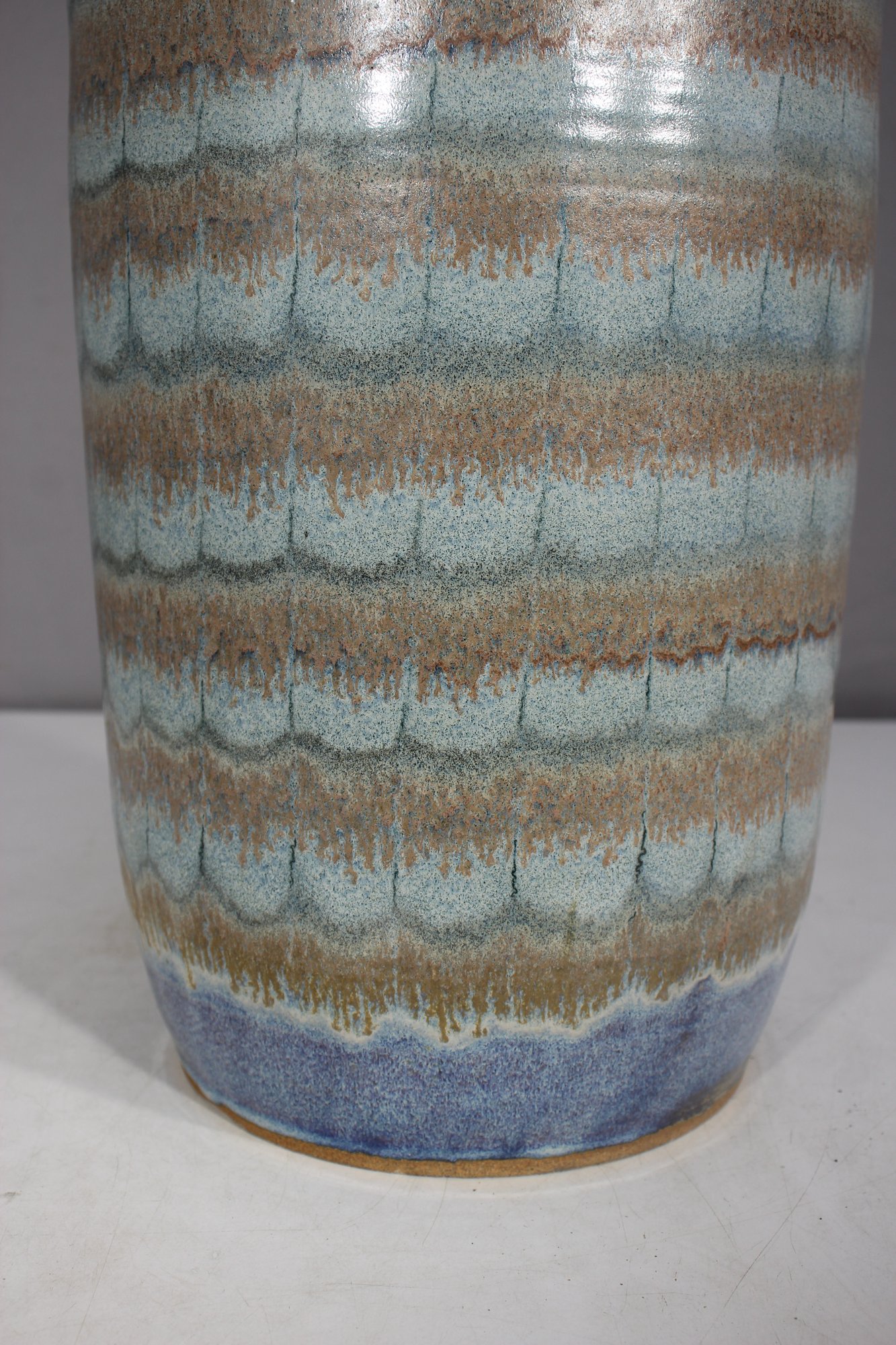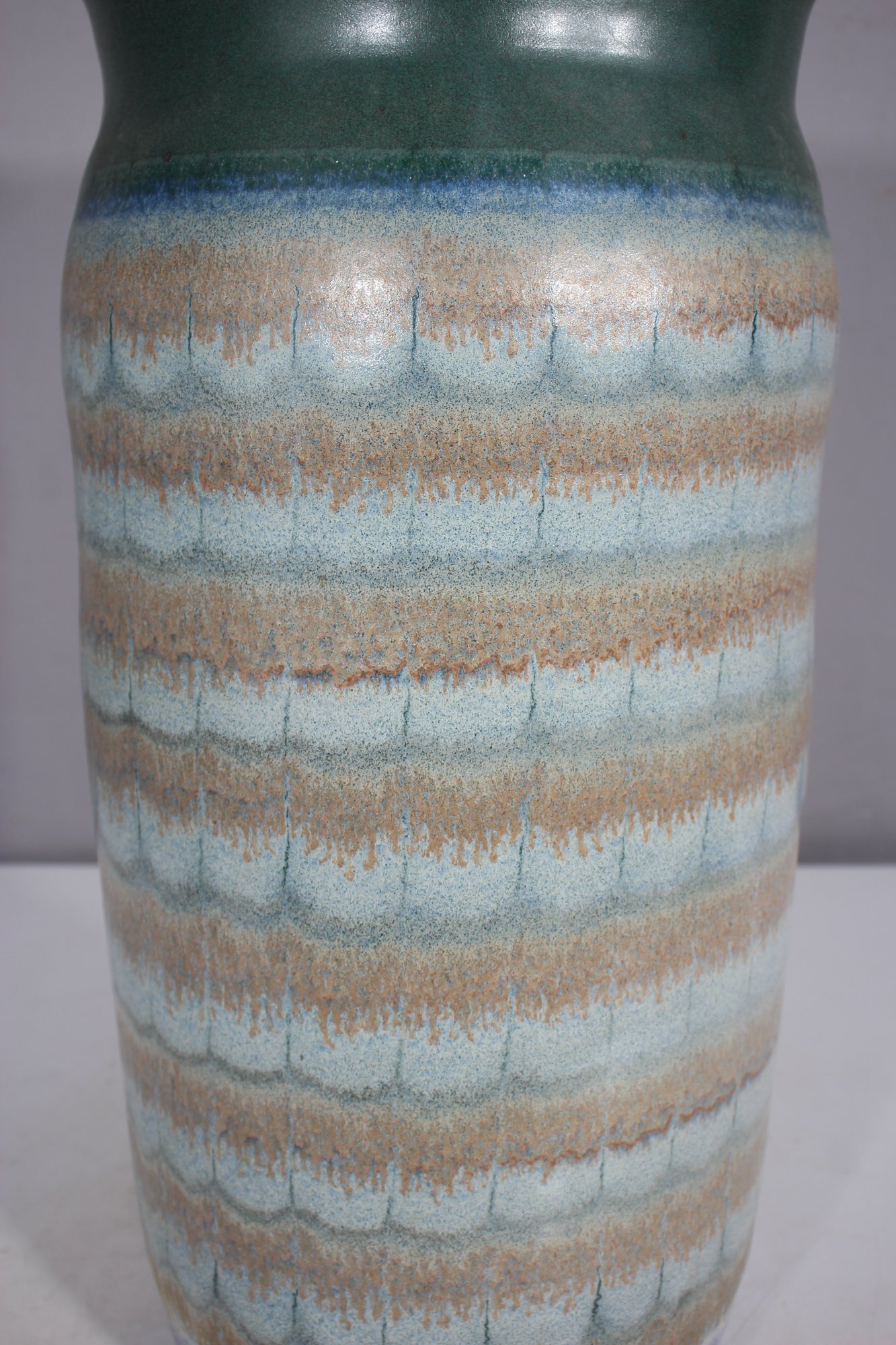 This beautiful handcrafted ceramic umbrella stand / Vase features an elegant combination of earthy greens, soft blues, and warm beige tones, creating a mesmerizing layered glaze effect. The 20-inch tall cylindrical form is both functional and decorative, making it an ideal piece for entryways or covered patios.