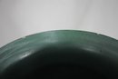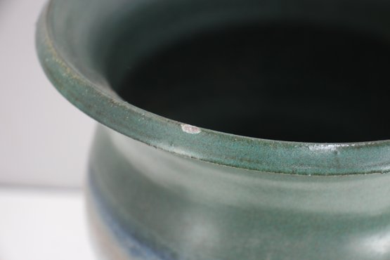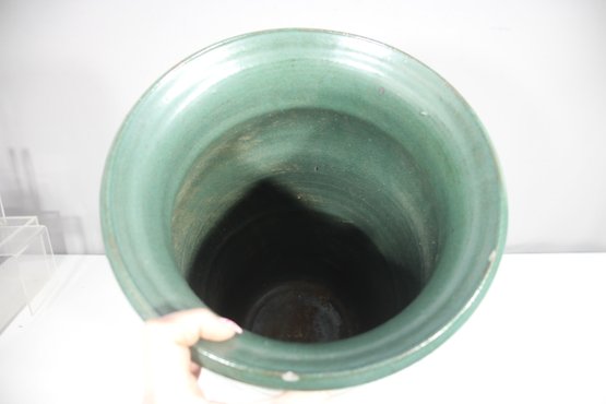 The flared green rim complements the textured, wave-like pattern on the body, showcasing expert craftsmanship. With its sturdy ceramic construction and 10.5-inch round opening, this versatile piece can be used as an umbrella holder, decorative vase, or statement accent for a variety of interior styles, from rustic to mid-century modern.