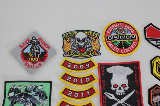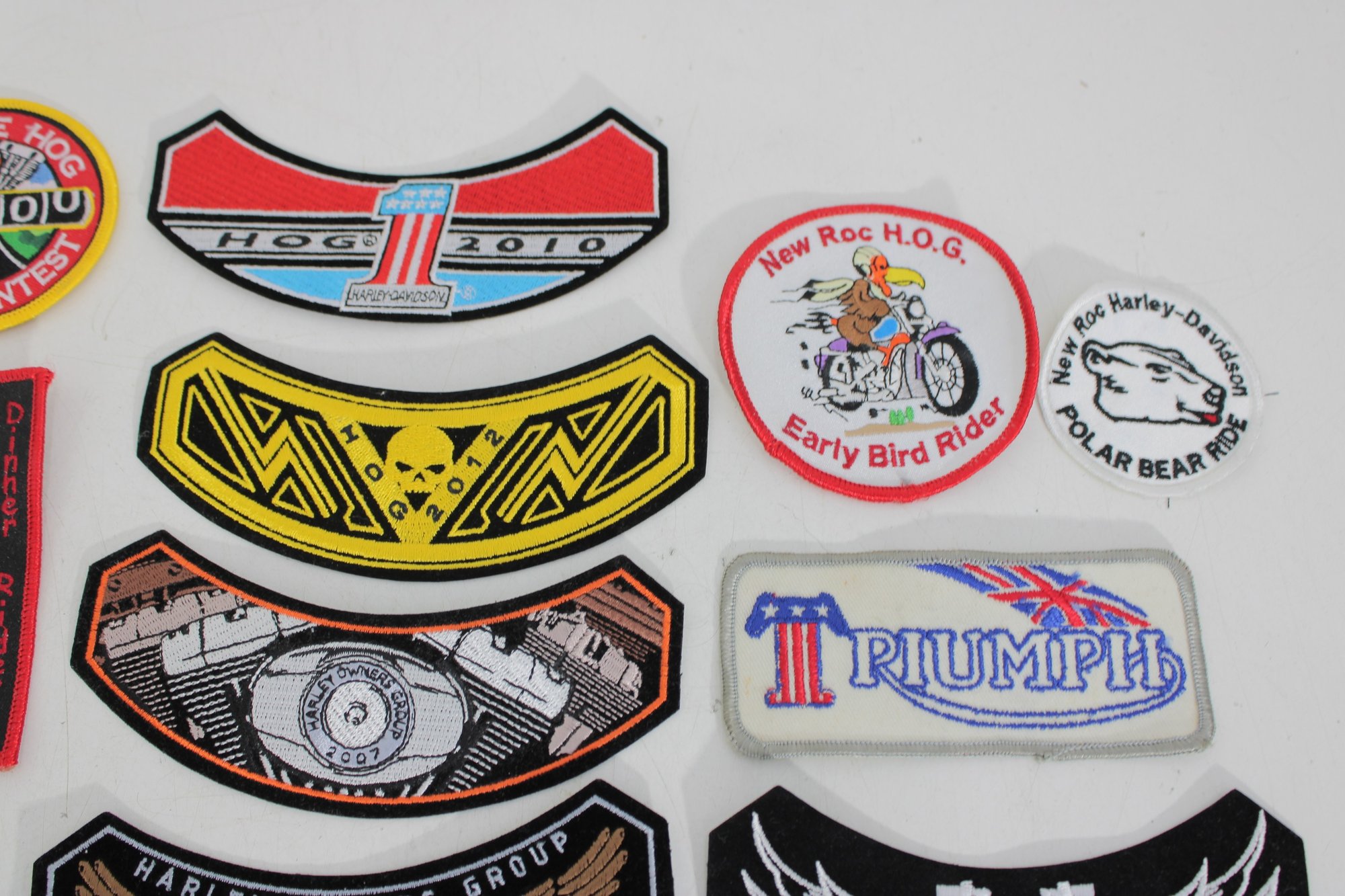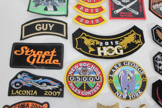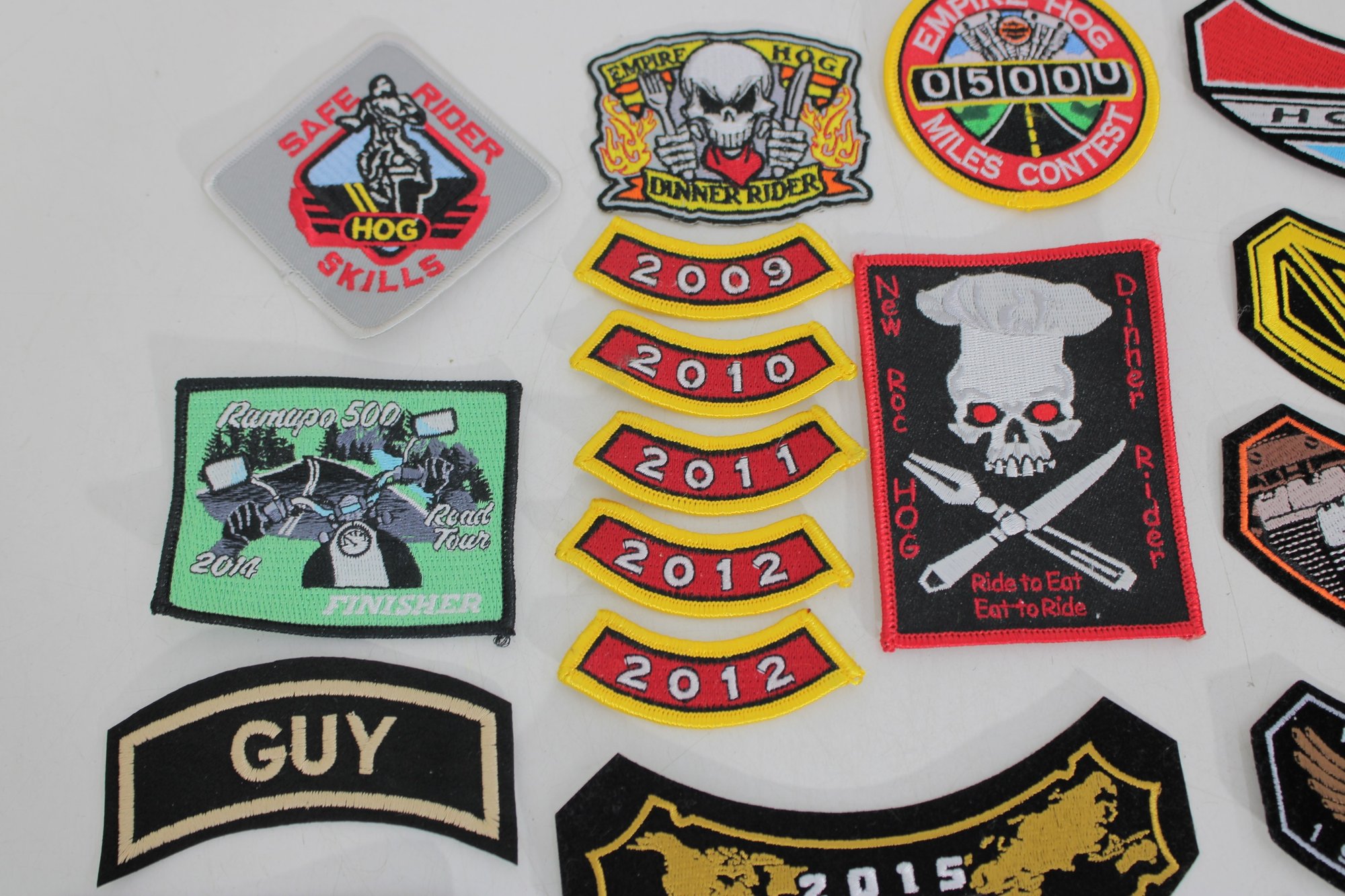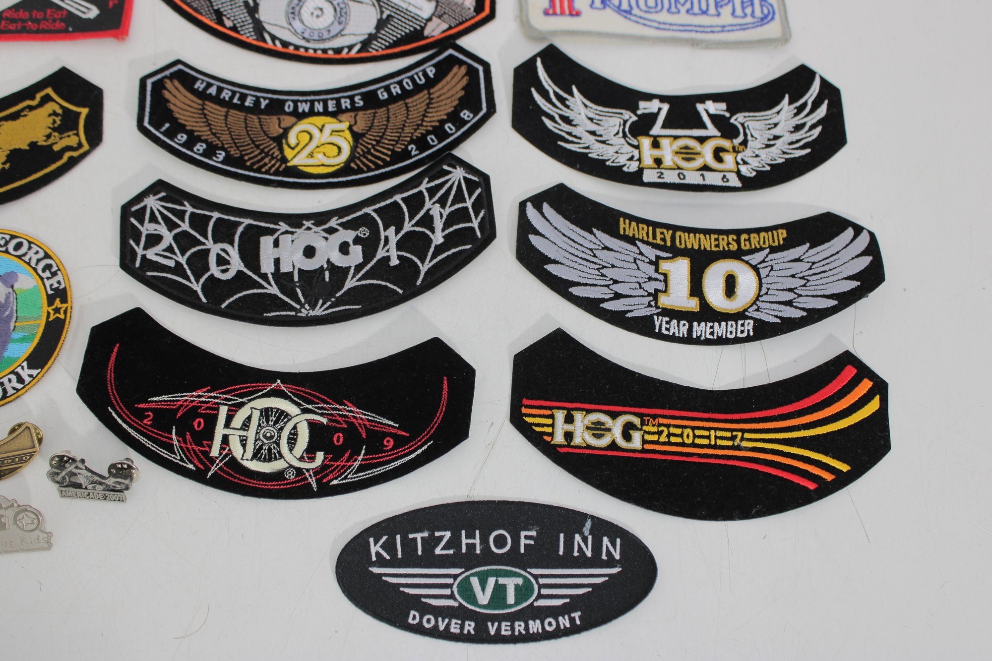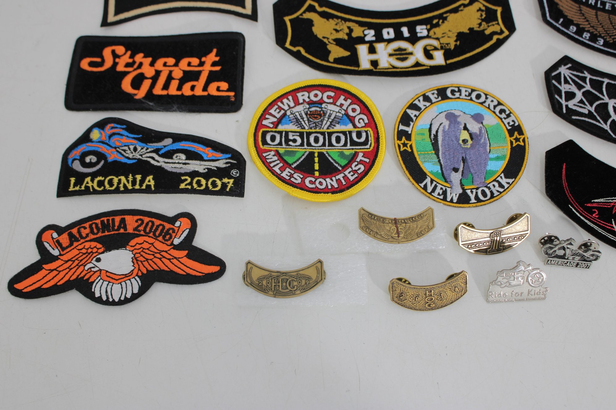Large mixed lot of Harley-Davidson and H.O.G. (Harley Owners Group) biker patches and small pins featuring rally, anniversary, and event designs.
