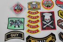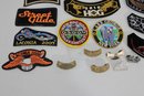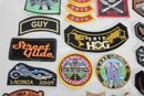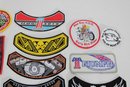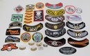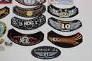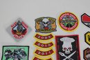 This collection includes a variety of embroidered and printed patches with bold graphics, skull motifs, winged logos, anniversary bars, and location-specific pieces.