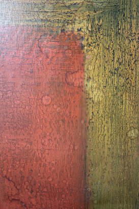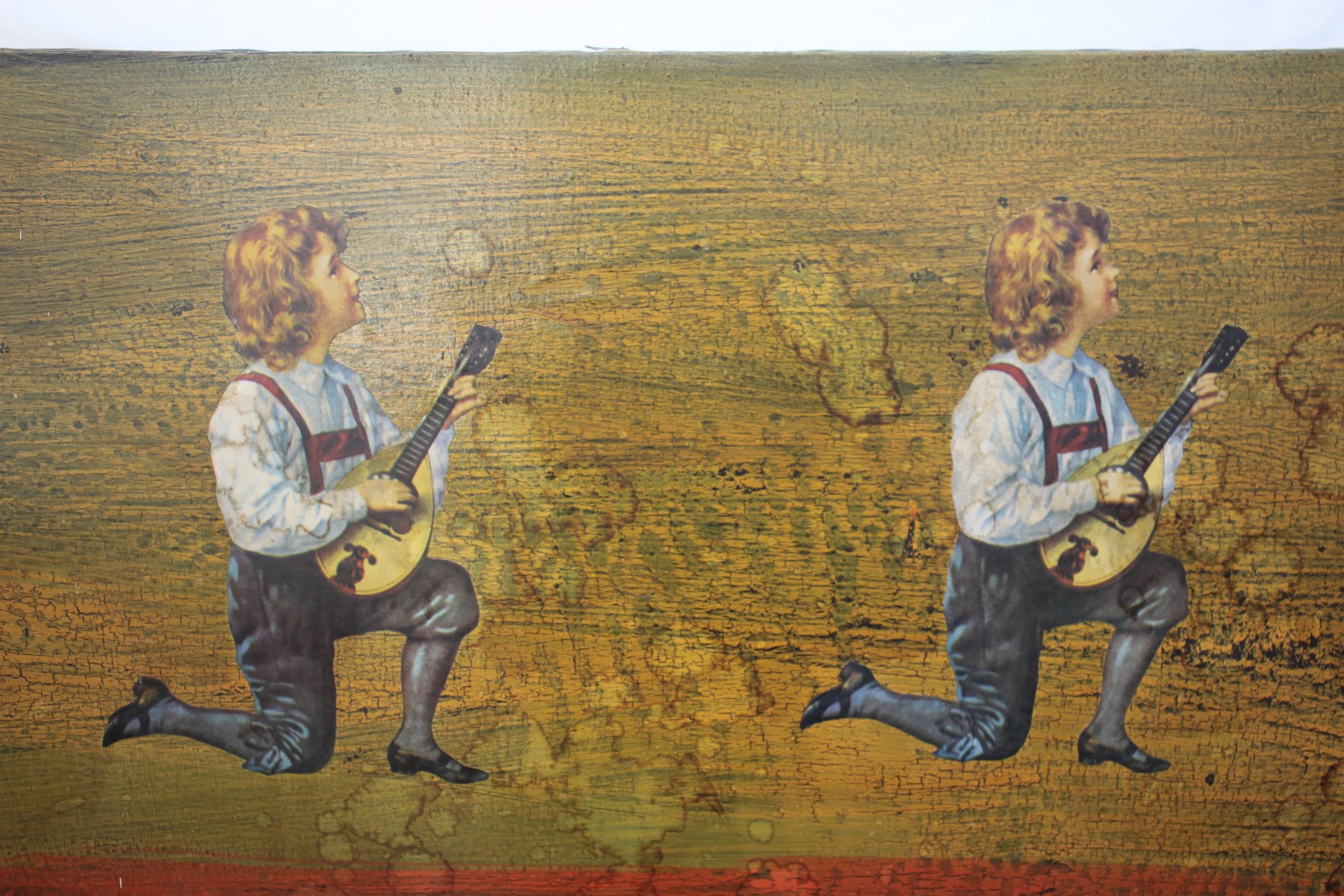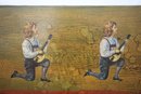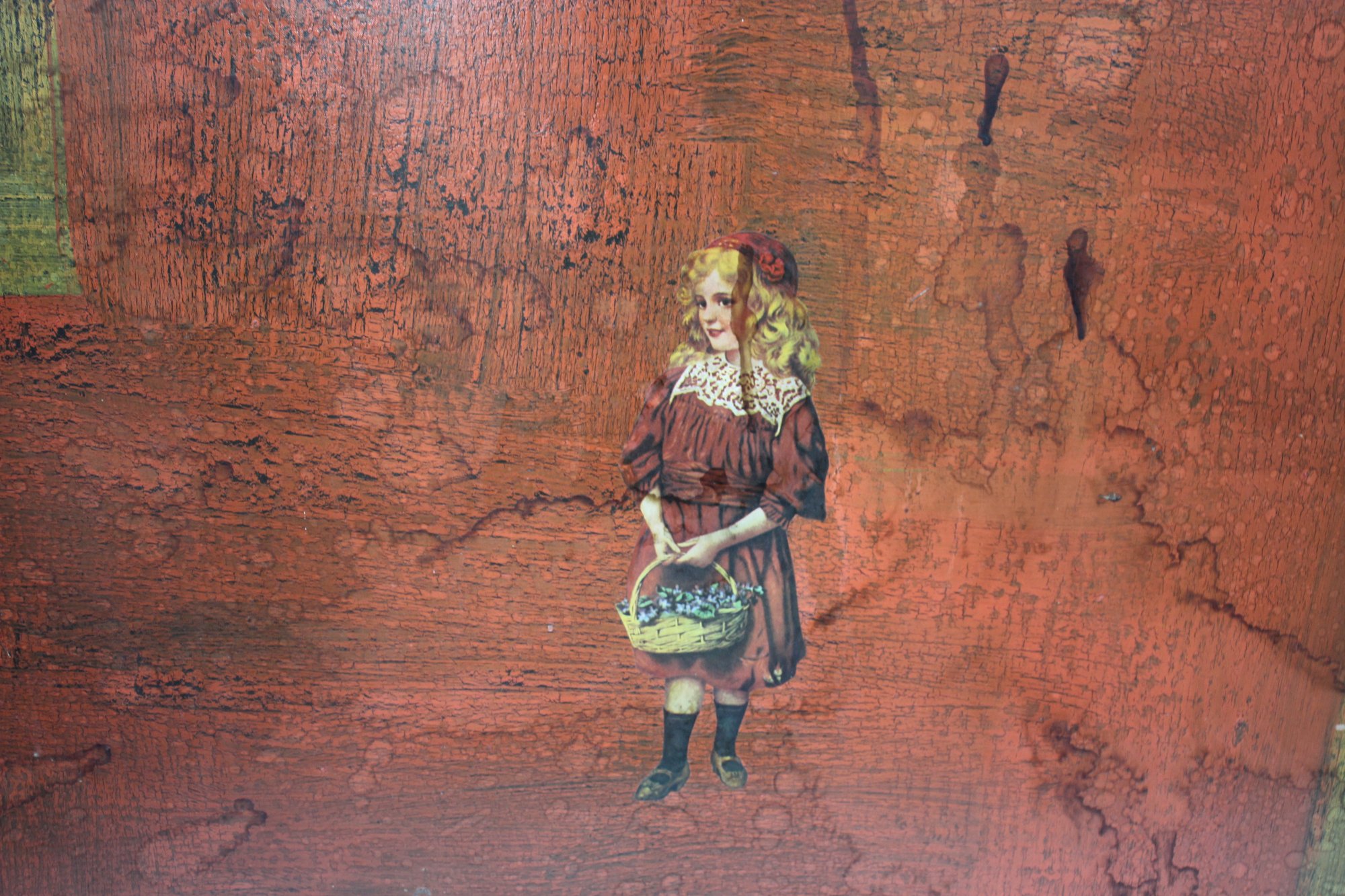 A striking and unique large-scale mixed media artwork featuring vintage cut-out figures collaged onto a heavily textured abstract background. This eye-catching piece presents a dreamlike composition with two kneeling musicians playing string instruments at the top, while a young girl in a red dress holding a basket stands below against a richly layered red and gold-toned background. The work blends elements of surrealism, nostalgia, and folk art.