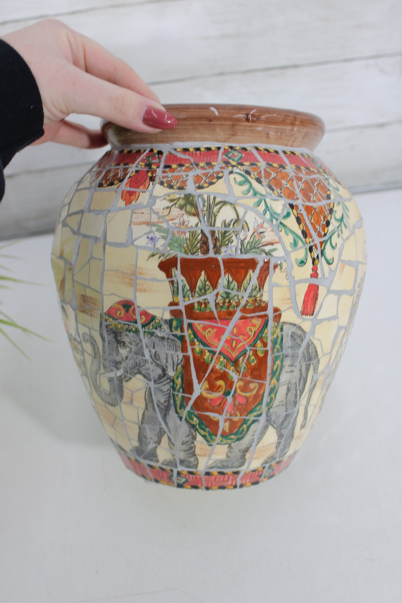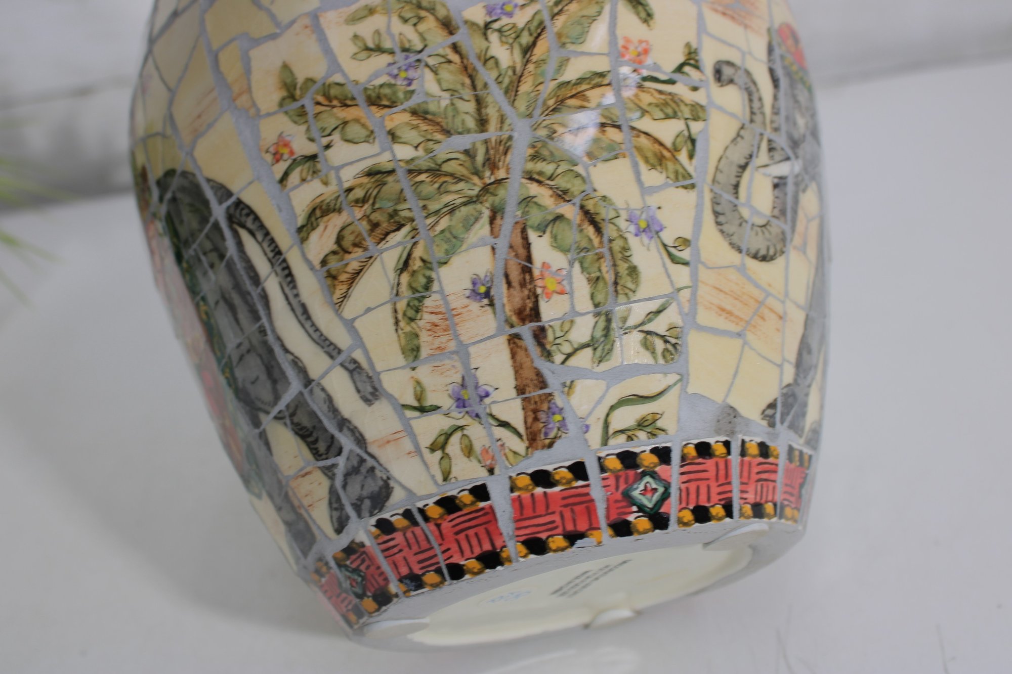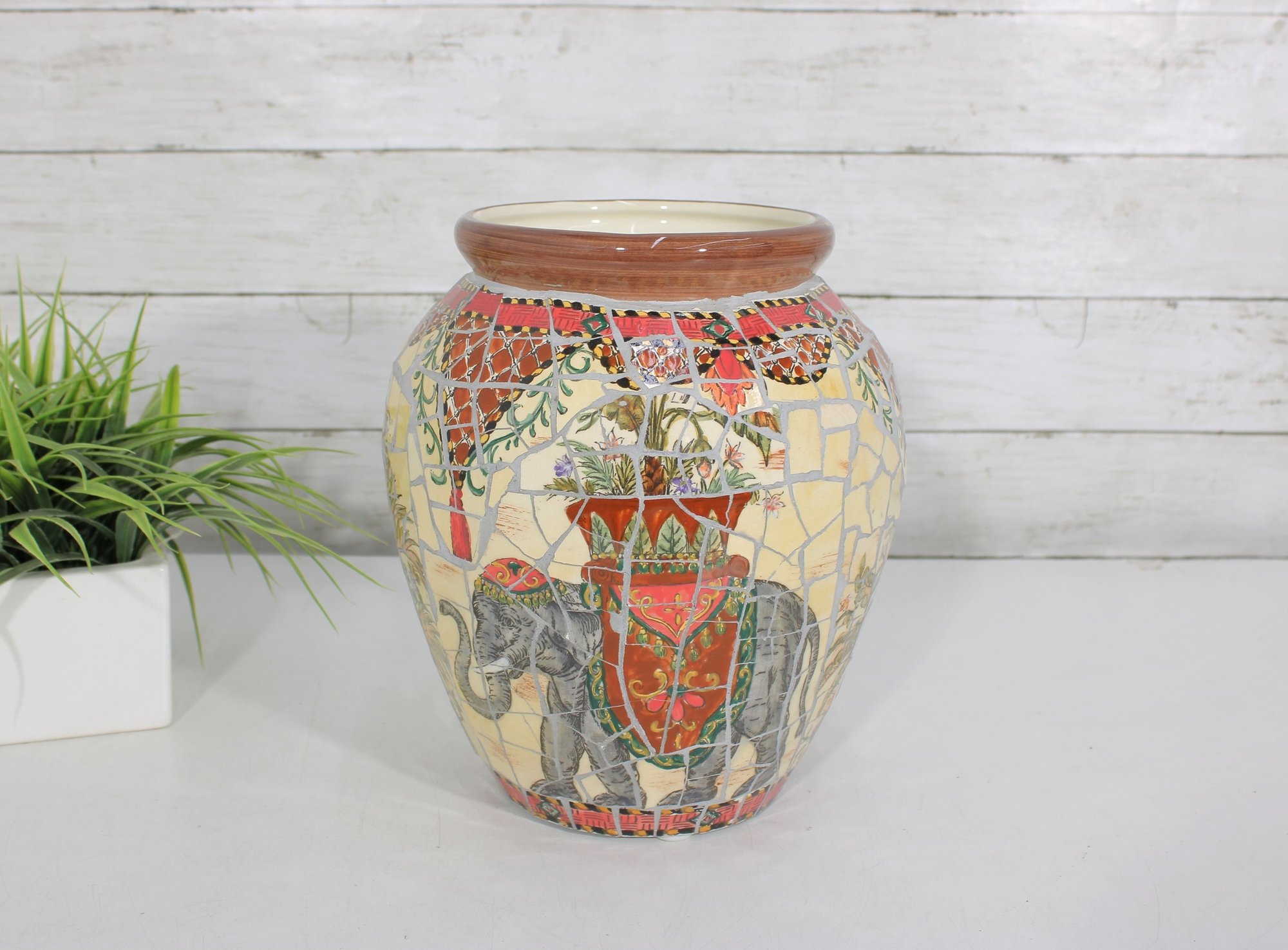 Striking large decorative vase featuring a colorful mosaic-style design with detailed elephant and tribal-inspired imagery. This substantial piece stands approximately 10 inches tall and showcases rich earth tones of red, cream, gold, gray, and black arranged in an intricate tiled pattern around the entire vessel.