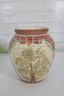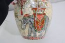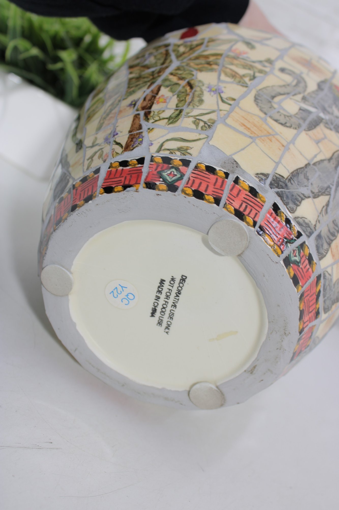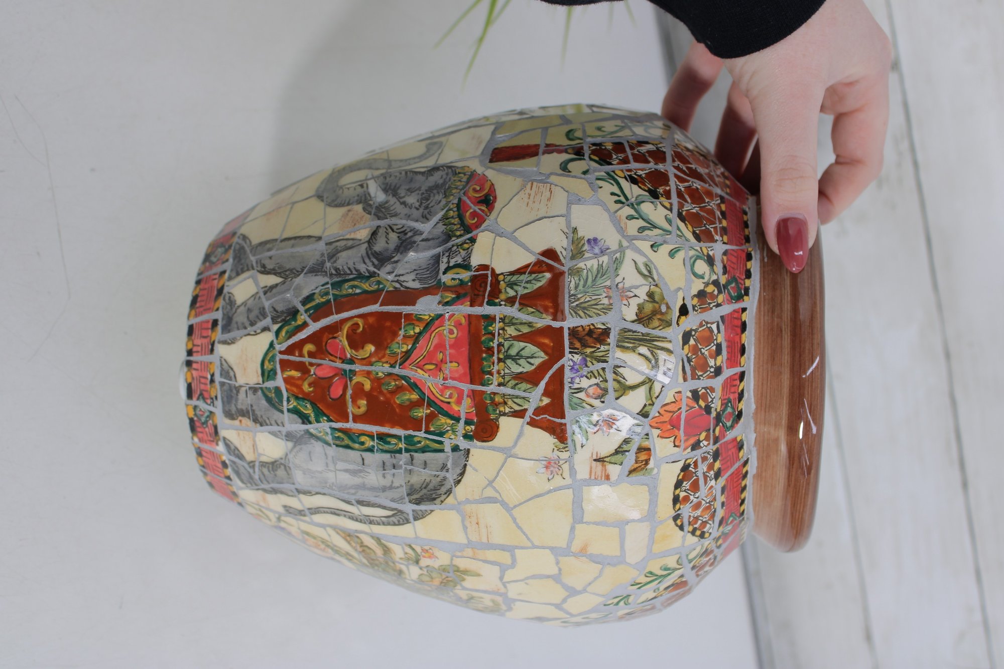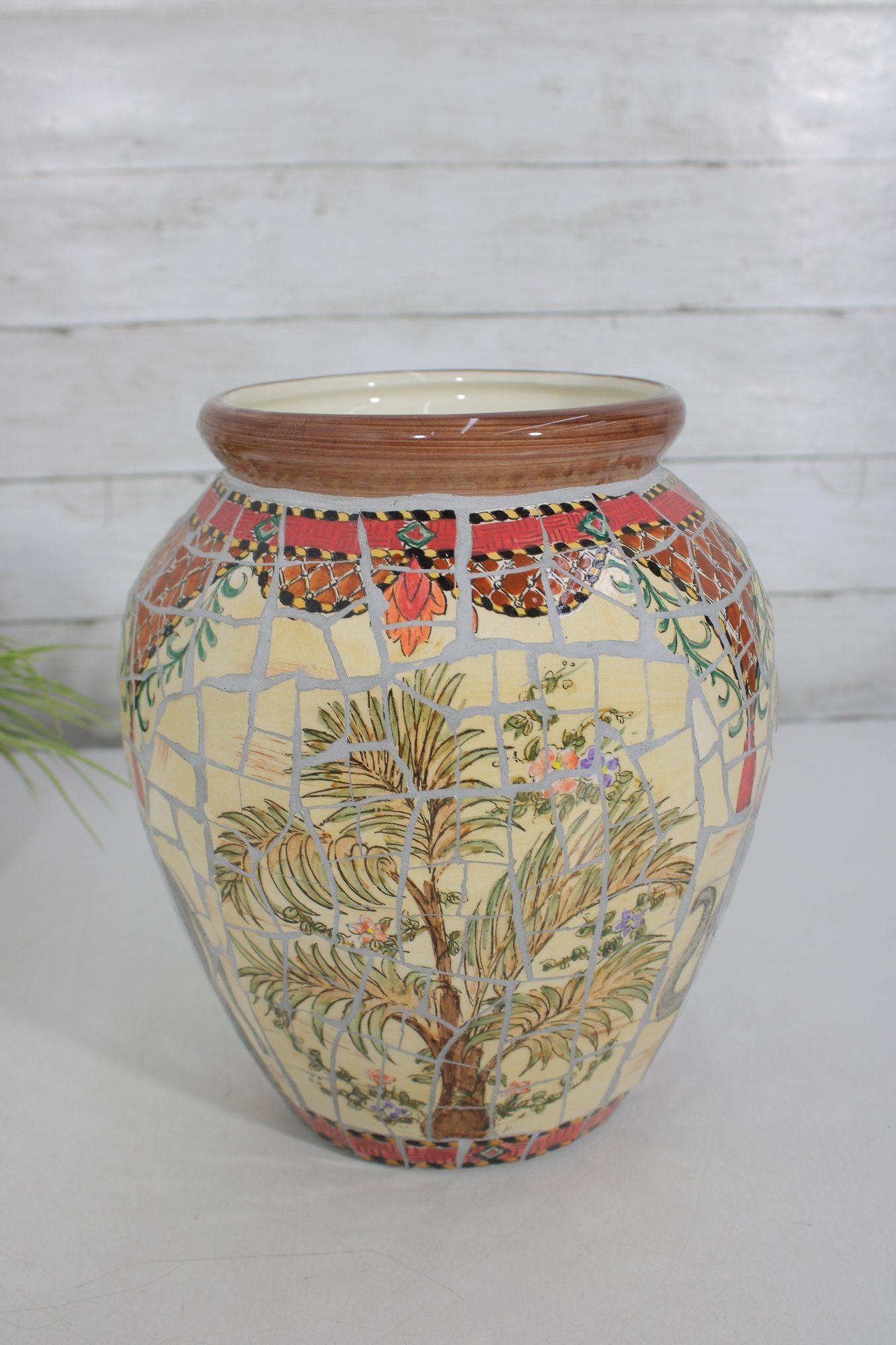 Striking large decorative vase featuring a colorful mosaic-style design with detailed elephant and tribal-inspired imagery. This substantial piece stands approximately 10 inches tall and showcases rich earth tones of red, cream, gold, gray, and black arranged in an intricate tiled pattern around the entire vessel.