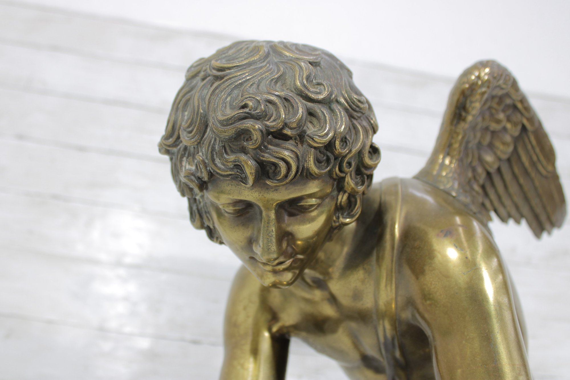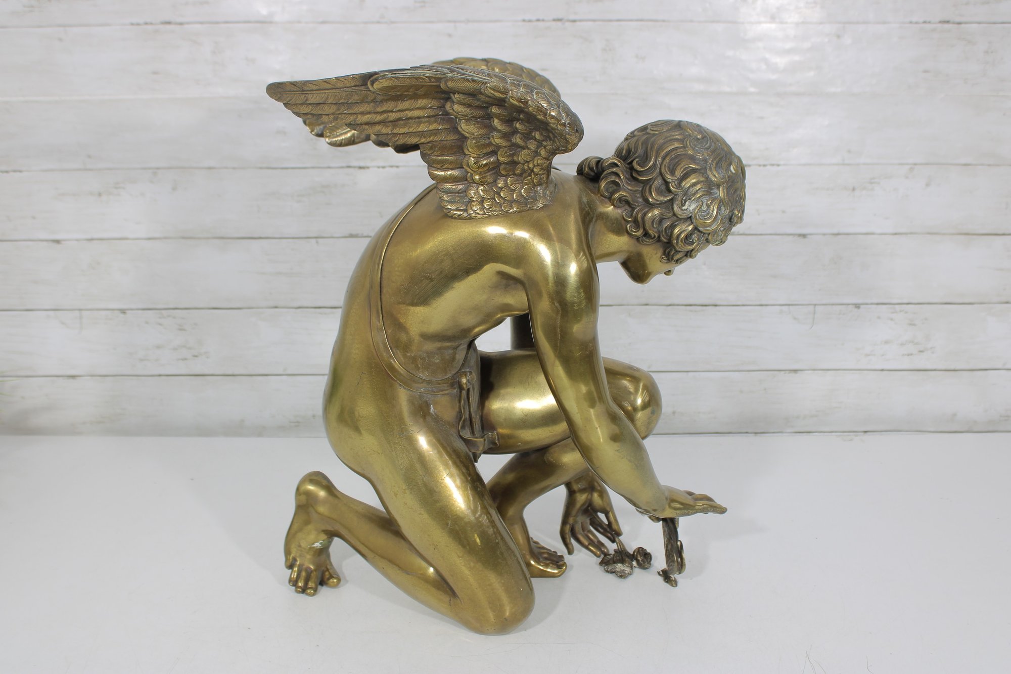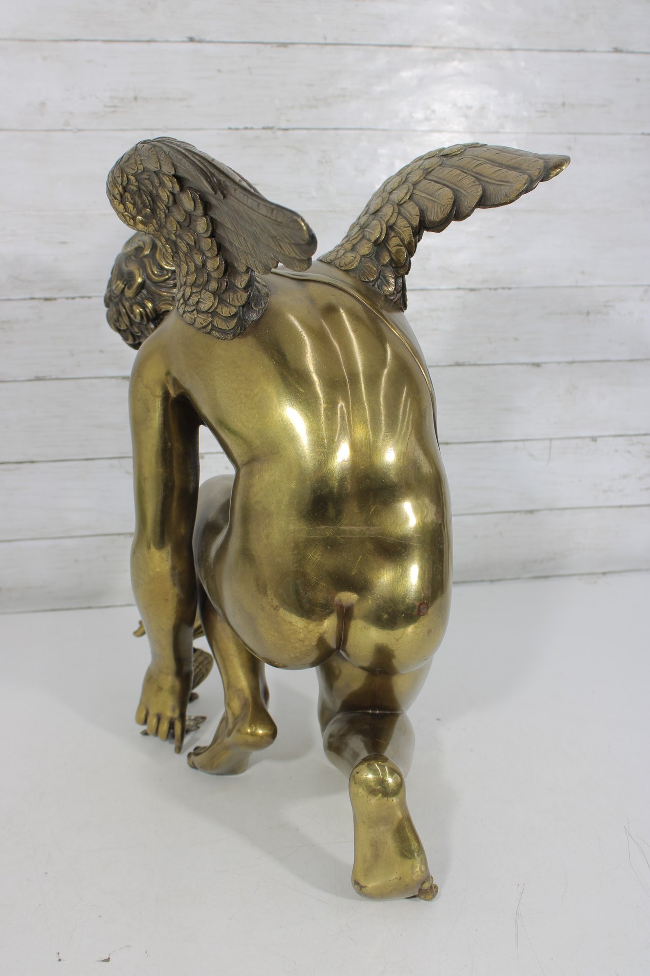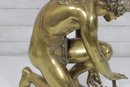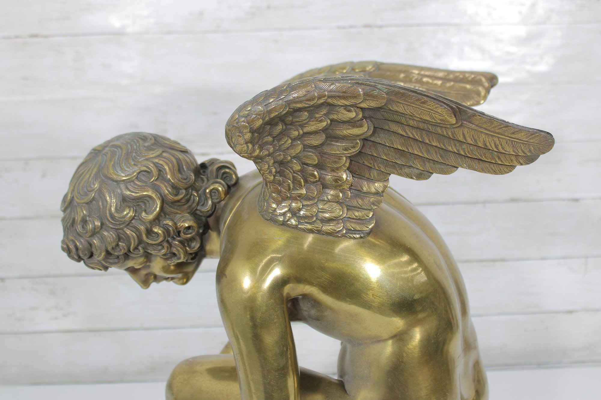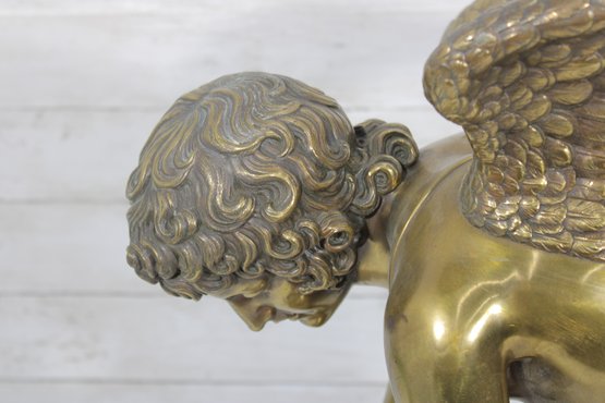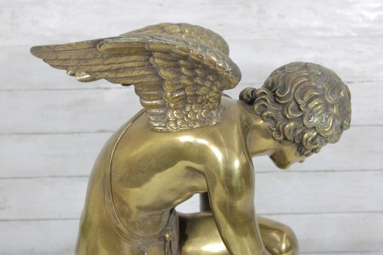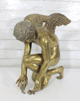 large brass sculpture depicting a kneeling winged mythological figure rendered in a classical Renaissance-inspired style. The nude fairy/cherub form is beautifully modeled with flowing curls, detailed feathered wings, and expressive anatomy, evoking the romantic spirit of old master sculpture traditions often associated with Michelangelo-inspired design.