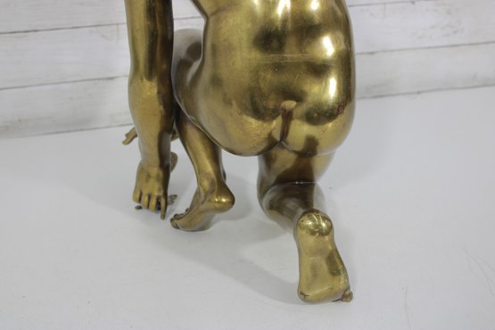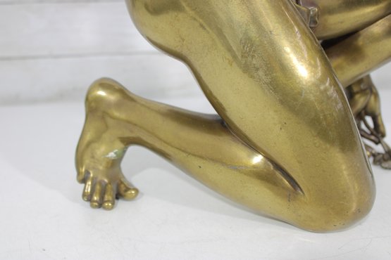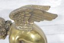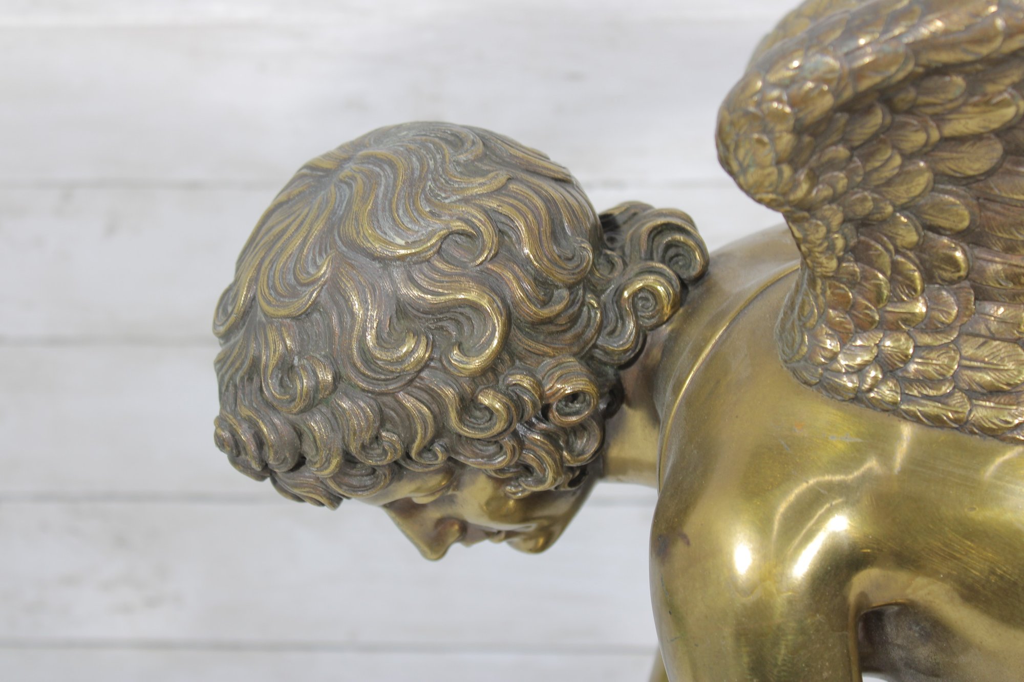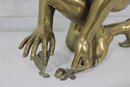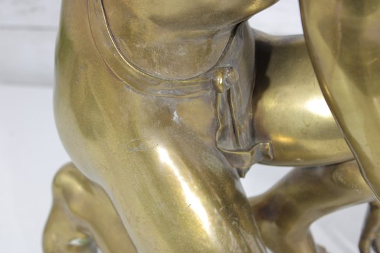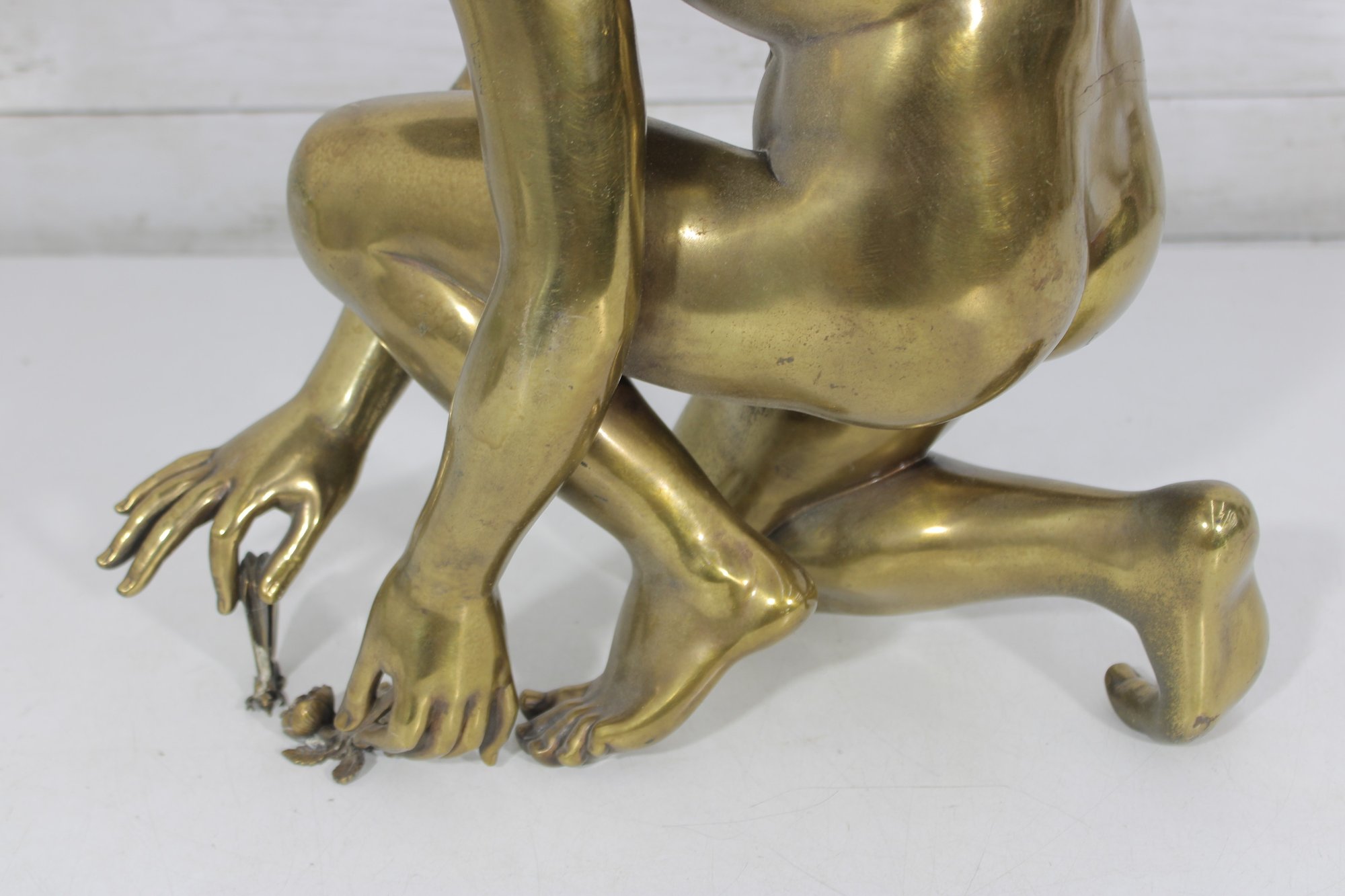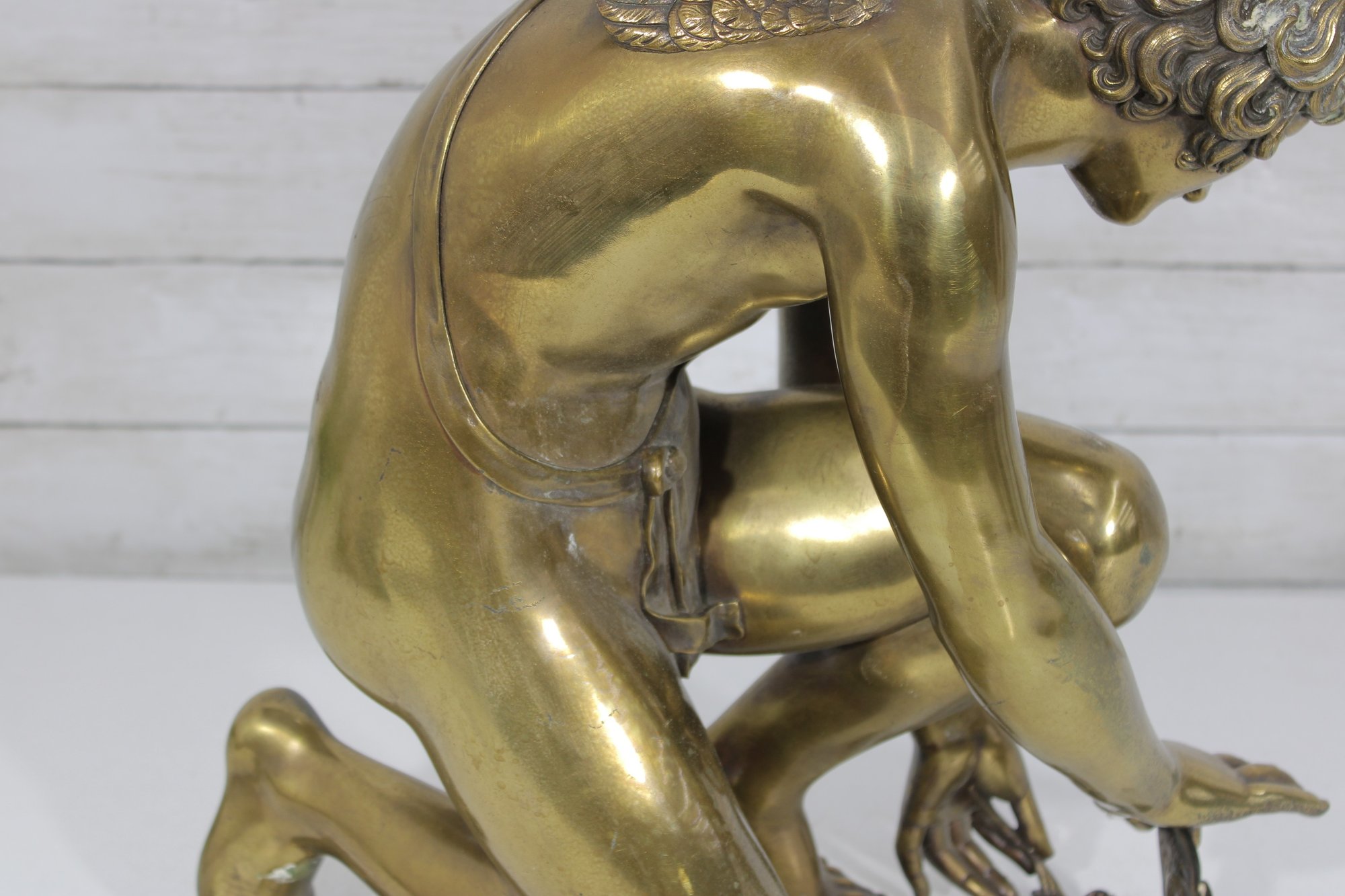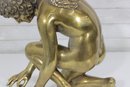 large brass sculpture depicting a kneeling winged mythological figure rendered in a classical Renaissance-inspired style. The nude fairy/cherub form is beautifully modeled with flowing curls, detailed feathered wings, and expressive anatomy, evoking the romantic spirit of old master sculpture traditions often associated with Michelangelo-inspired design.