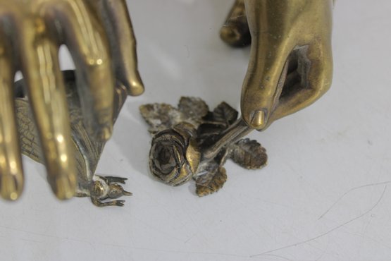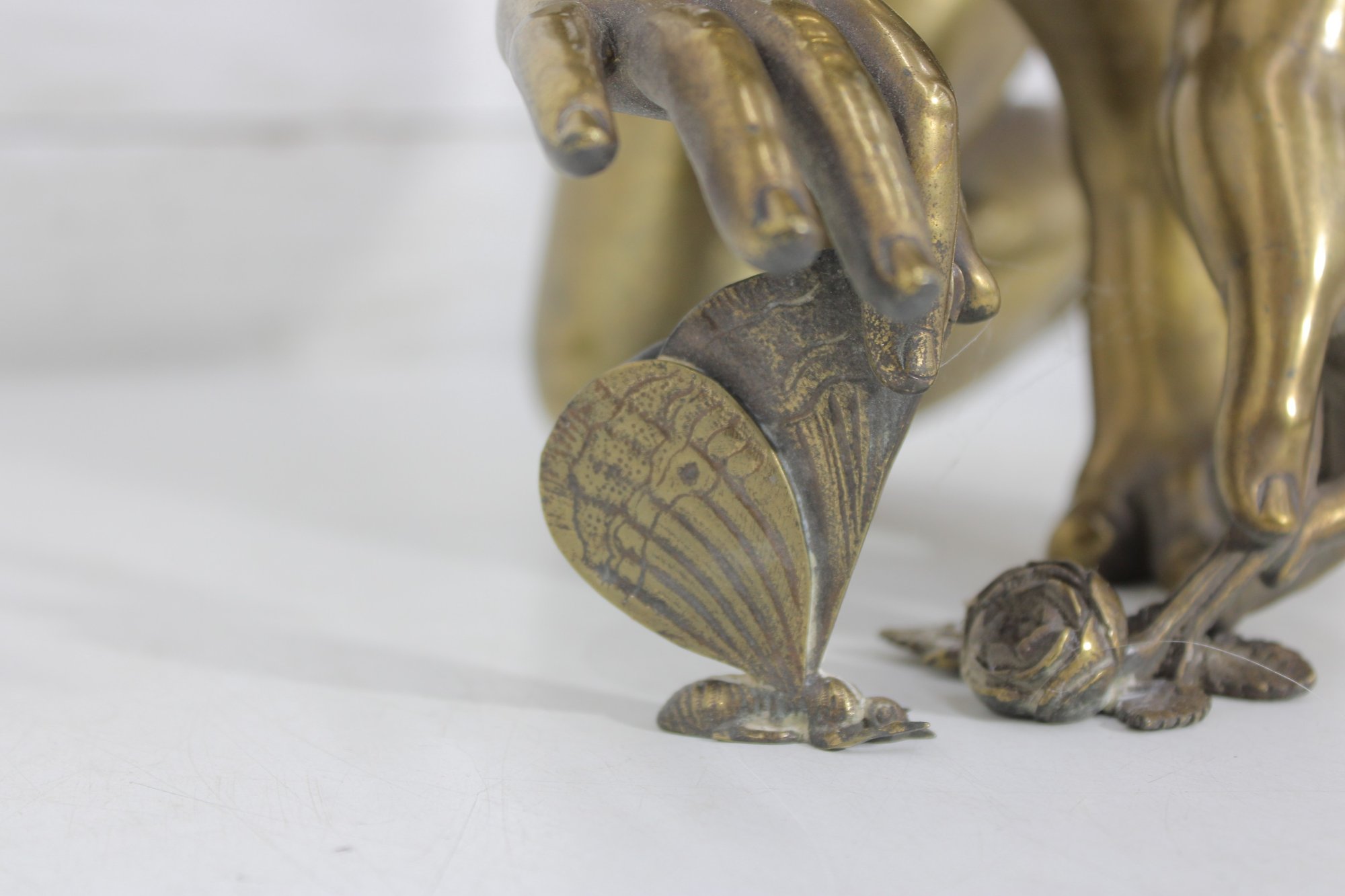 The figure is shown delicately interacting with small natural elements at the base, including floral and butterfly motifs, adding a poetic and whimsical touch to the composition. Its warm aged brass finish and sculptural presence make it an impressive decorative statement suitable for traditional, neoclassical, or eclectic interiors.