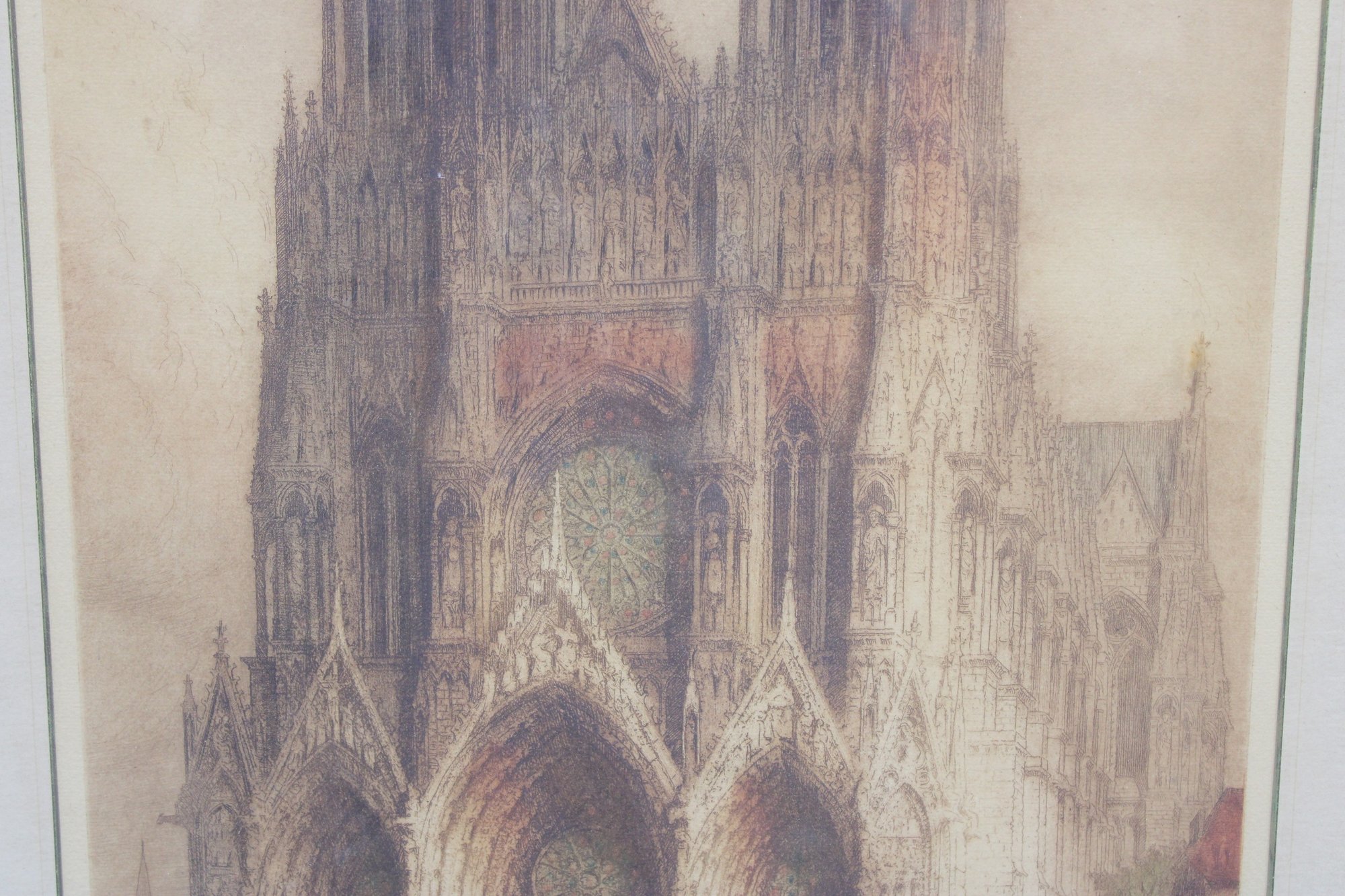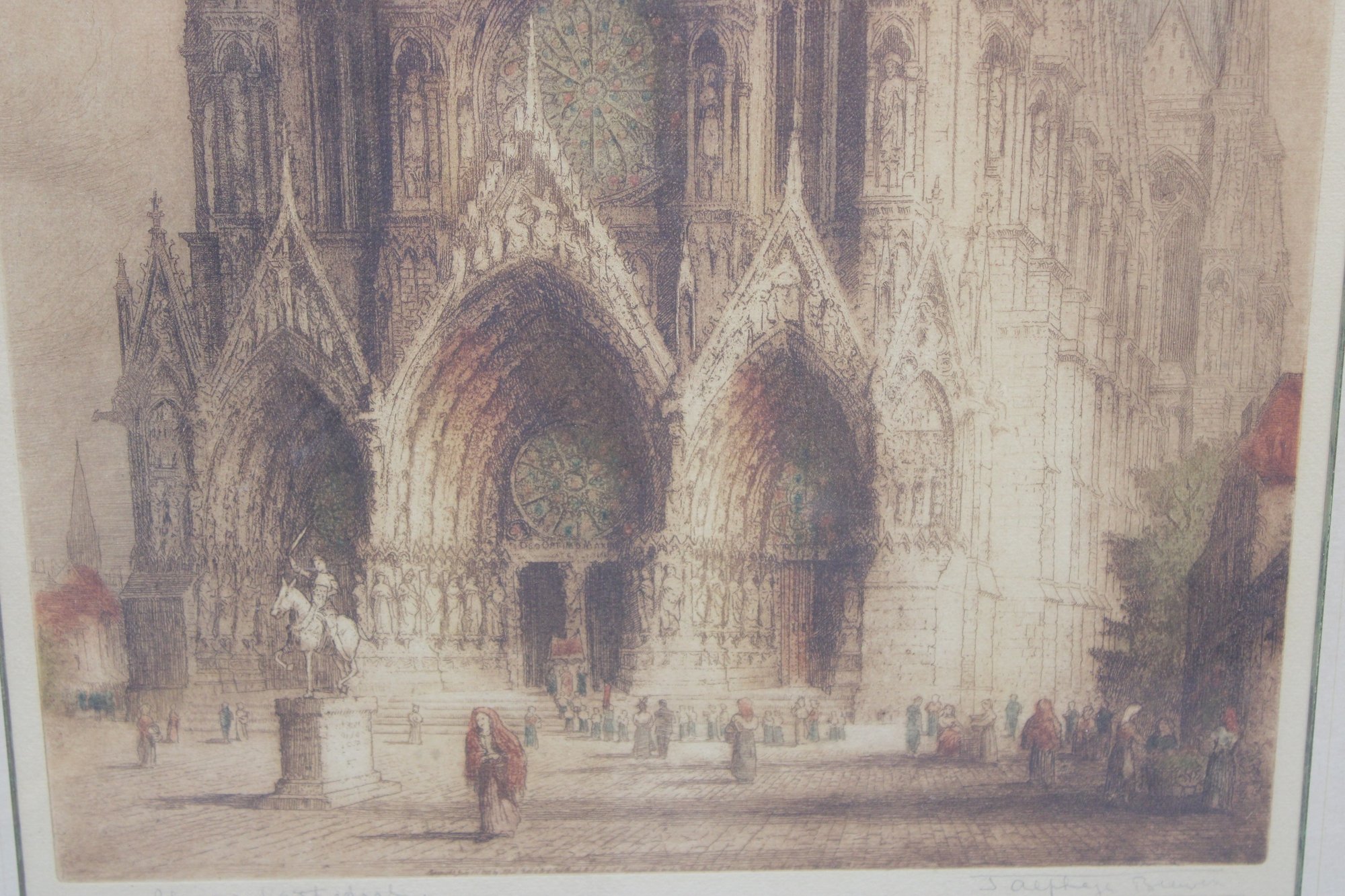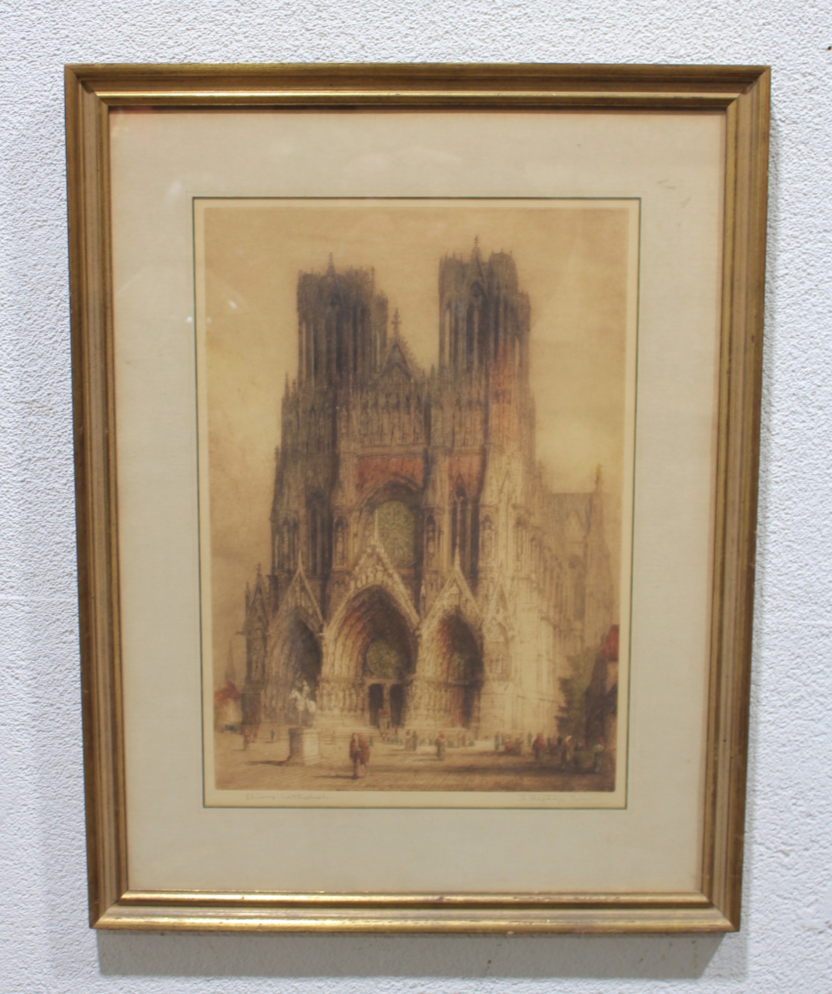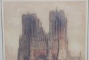 an impressive large-format architectural print depicting the grand façade and forecourt of Reims Cathedral, one of the masterpieces of French Gothic architecture. The scene captures the cathedral’s soaring twin towers, ornate portals, and lively figures in the square, rendered in warm, atmospheric tones that emphasize depth and architectural detail.