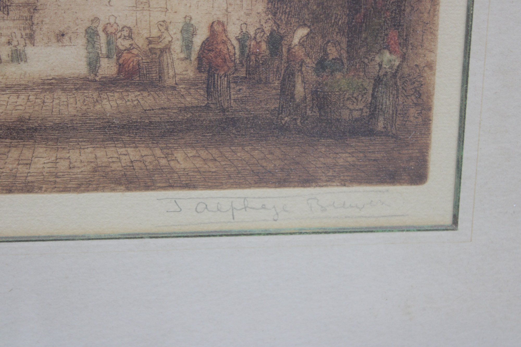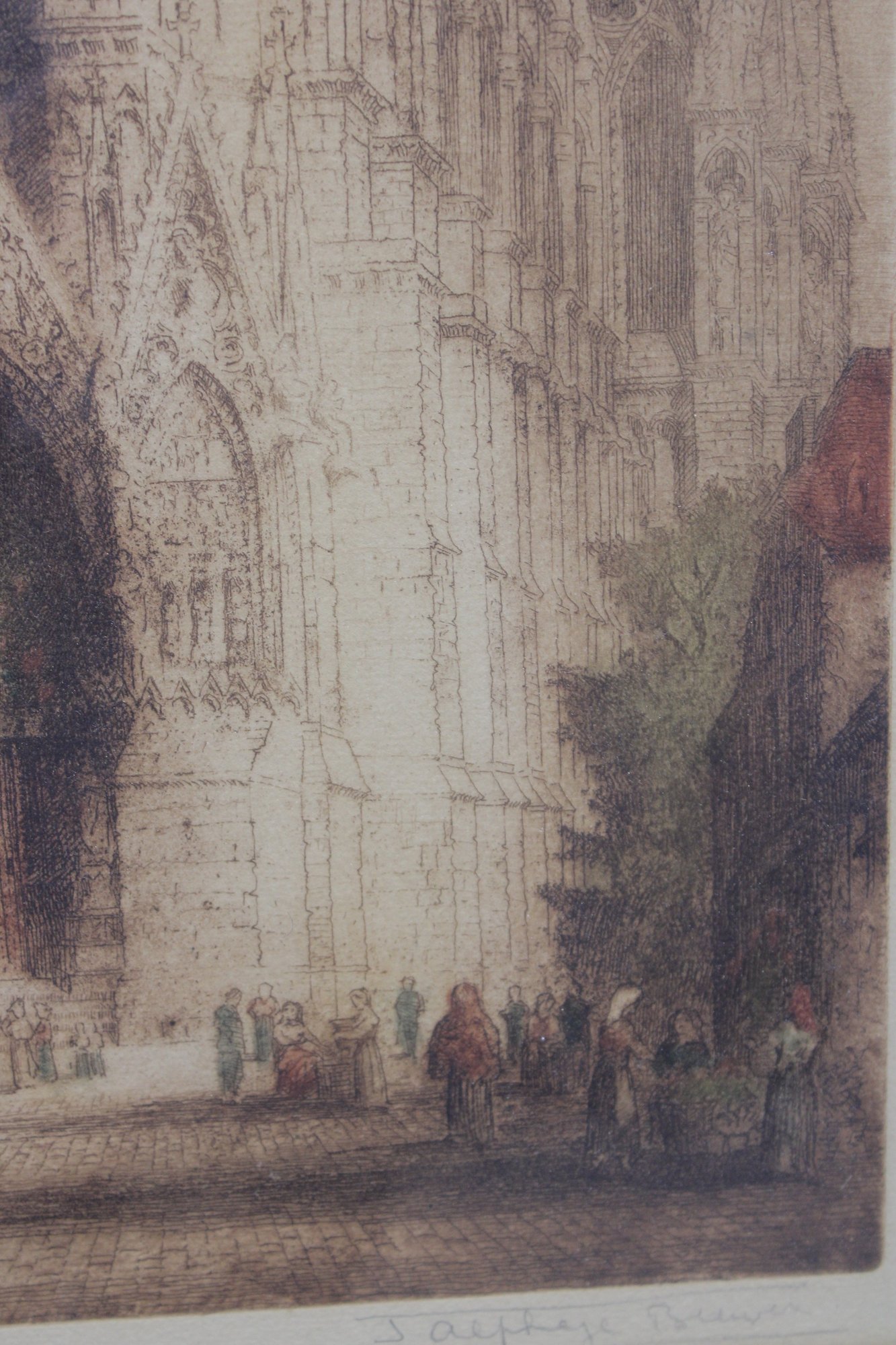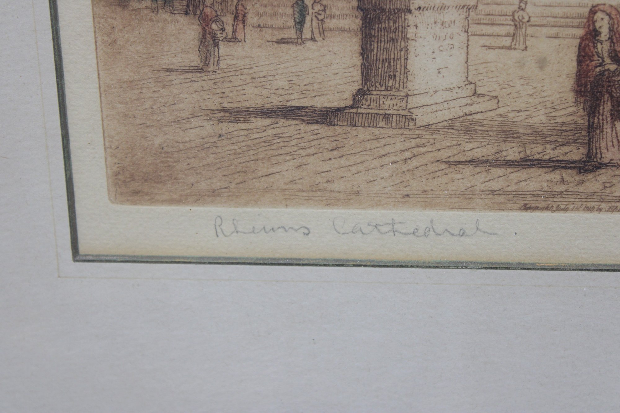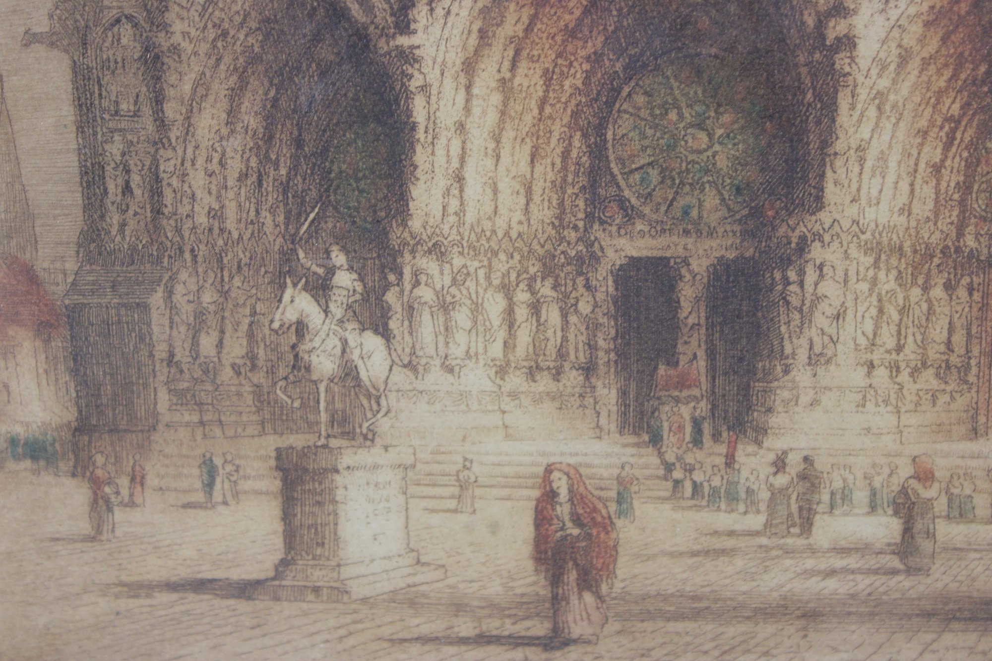 an impressive large-format architectural print depicting the grand façade and forecourt of Reims Cathedral, one of the masterpieces of French Gothic architecture. The scene captures the cathedral’s soaring twin towers, ornate portals, and lively figures in the square, rendered in warm, atmospheric tones that emphasize depth and architectural detail.