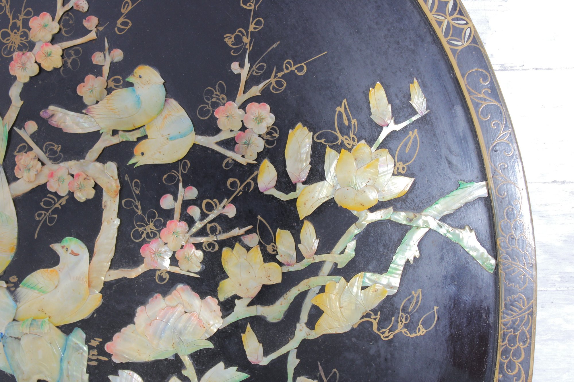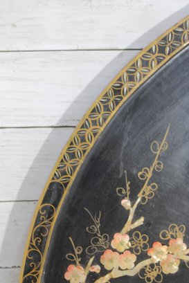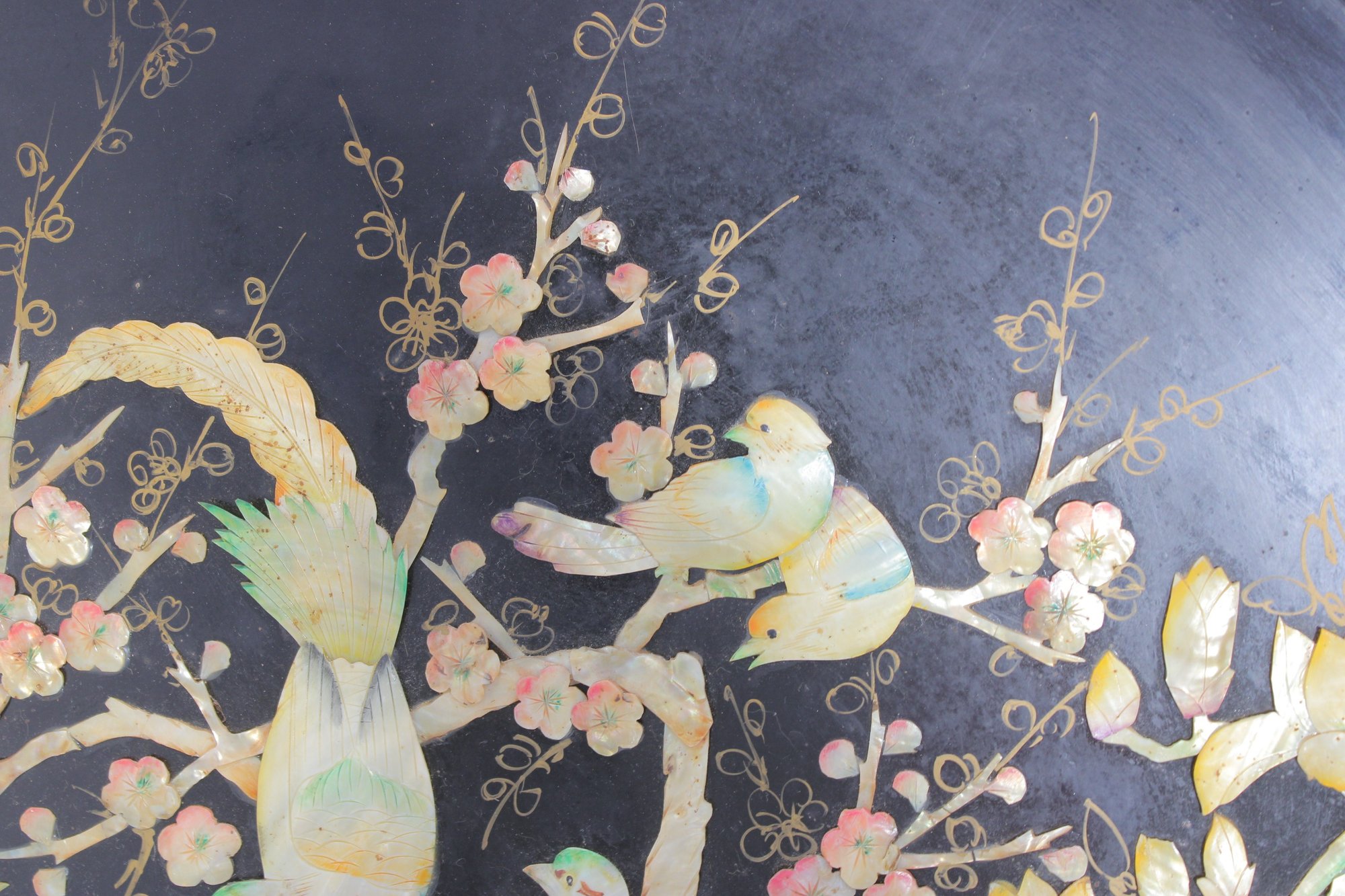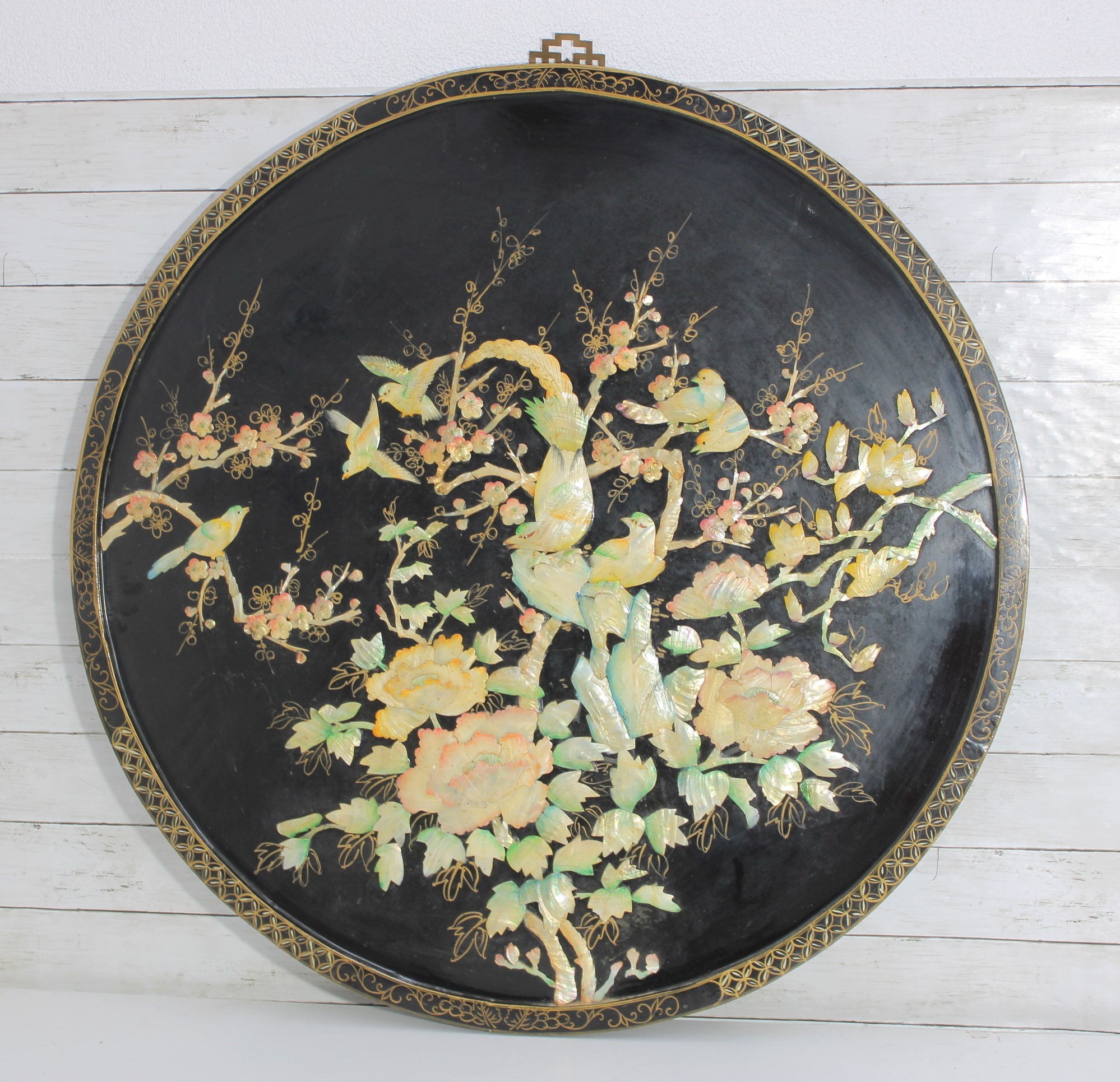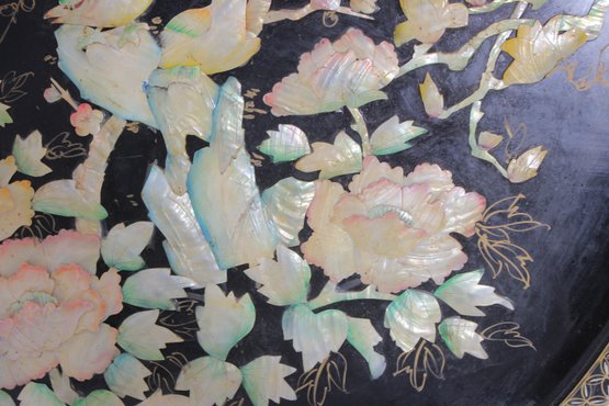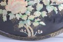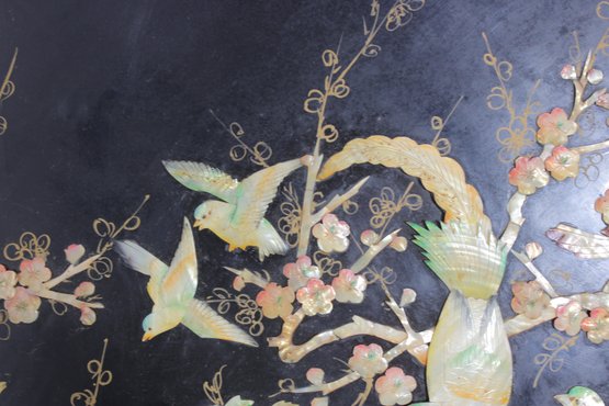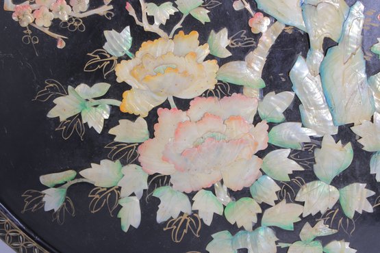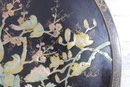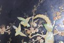 Stunning large round Asian-inspired decorative wall panel featuring intricate mother-of-pearl style inlay depicting birds perched among flowering branches. The shimmering iridescent details contrast beautifully against the deep black lacquered background, creating an elegant and eye-catching statement piece.