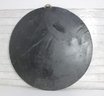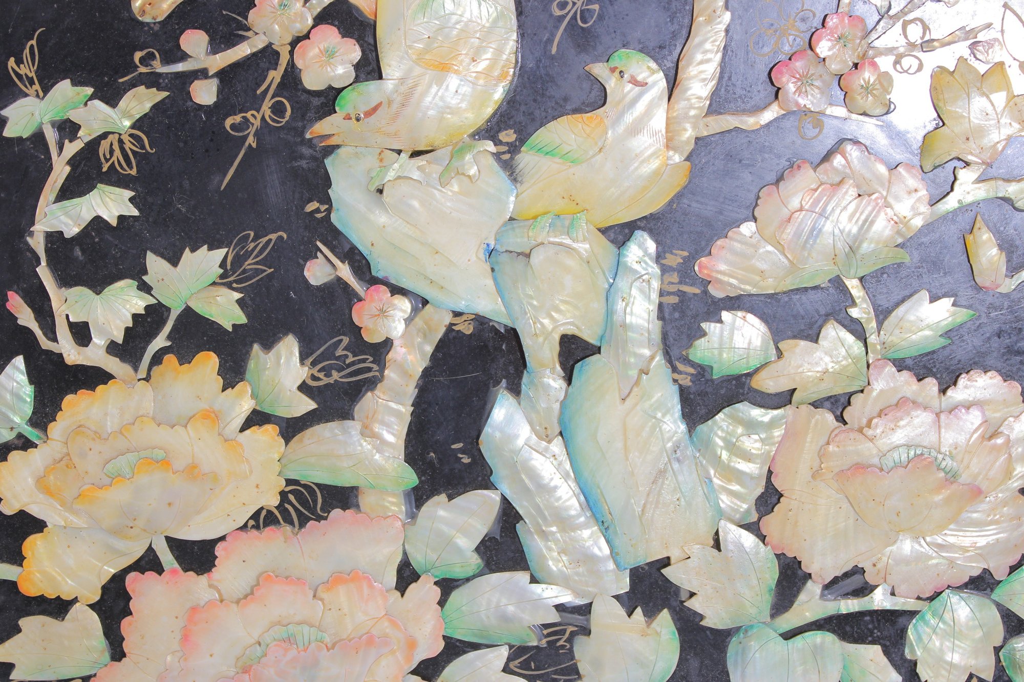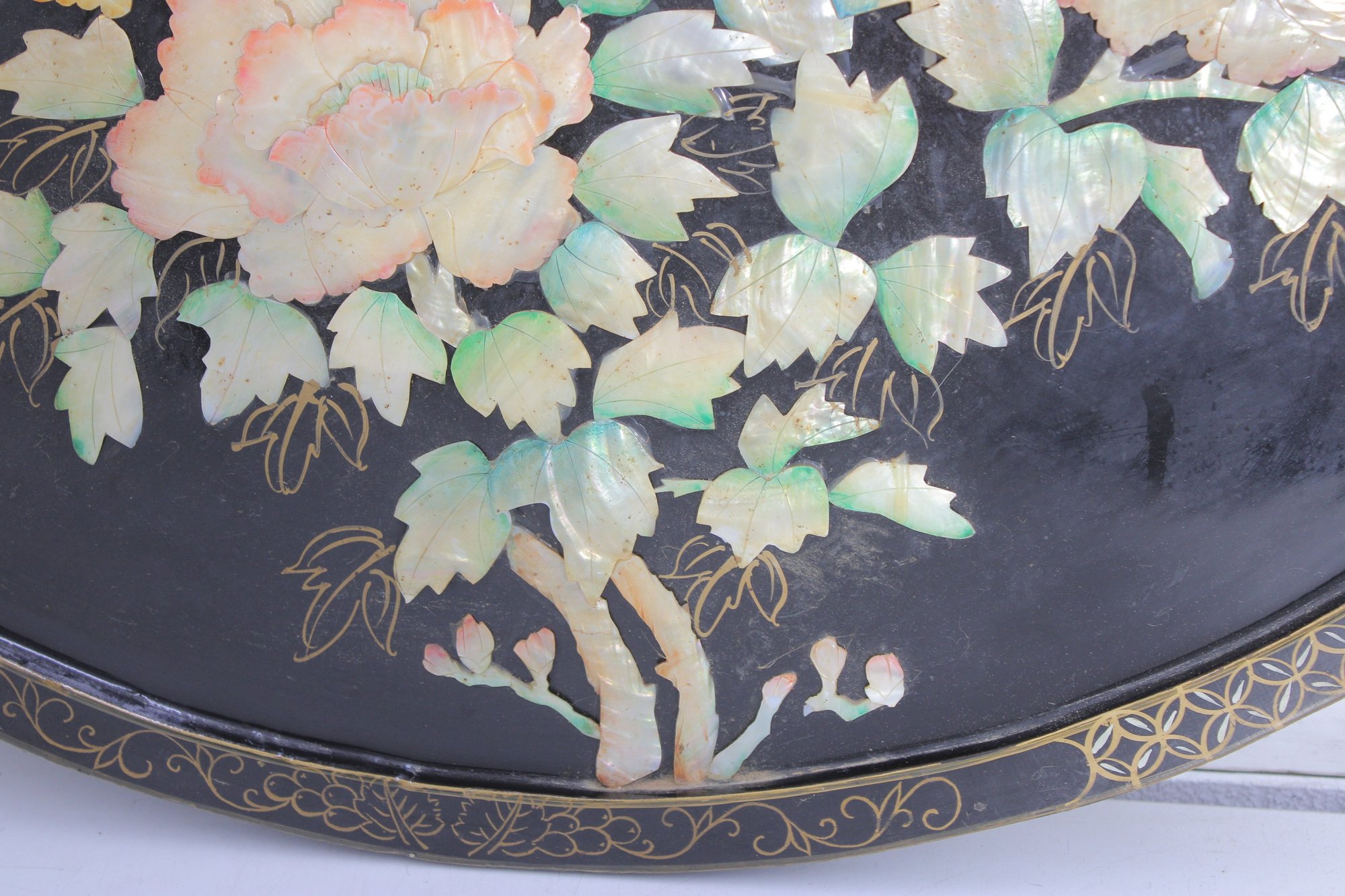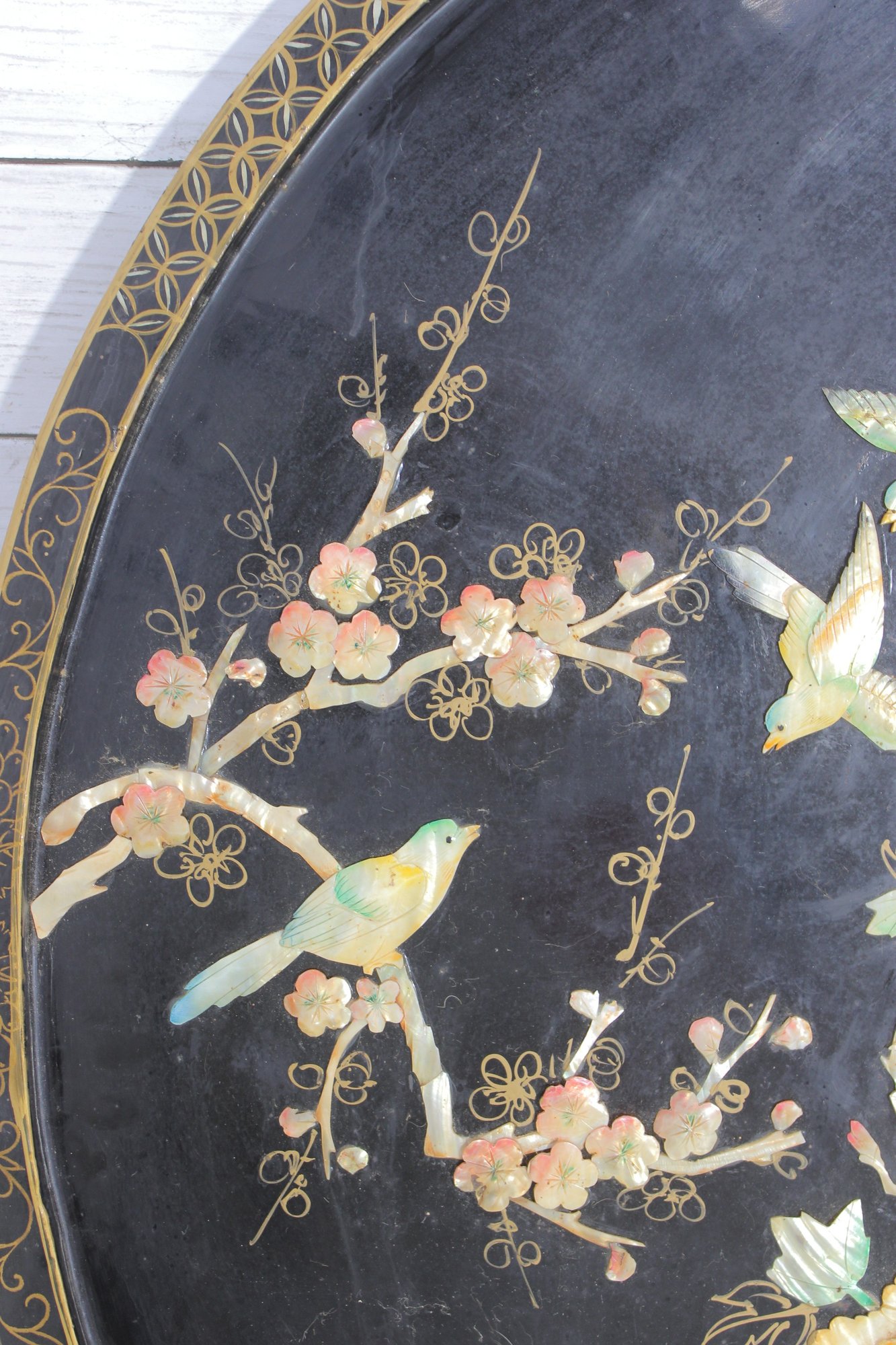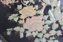 Stunning large round Asian-inspired decorative wall panel featuring intricate mother-of-pearl style inlay depicting birds perched among flowering branches. The shimmering iridescent details contrast beautifully against the deep black lacquered background, creating an elegant and eye-catching statement piece.