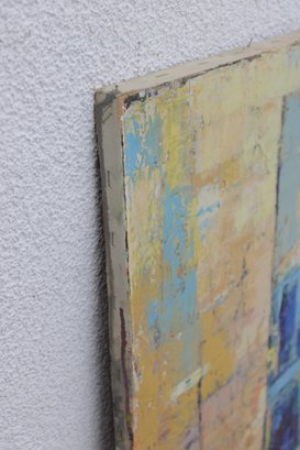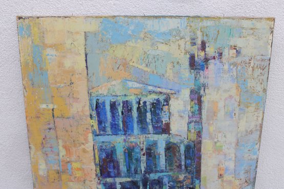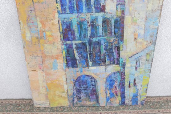 a large and visually striking original painting featuring an abstract architectural cityscape. The composition centers around a multi-story building with arched openings and layered structures, rendered in a vibrant palette of blues, yellows, and soft earth tones.
