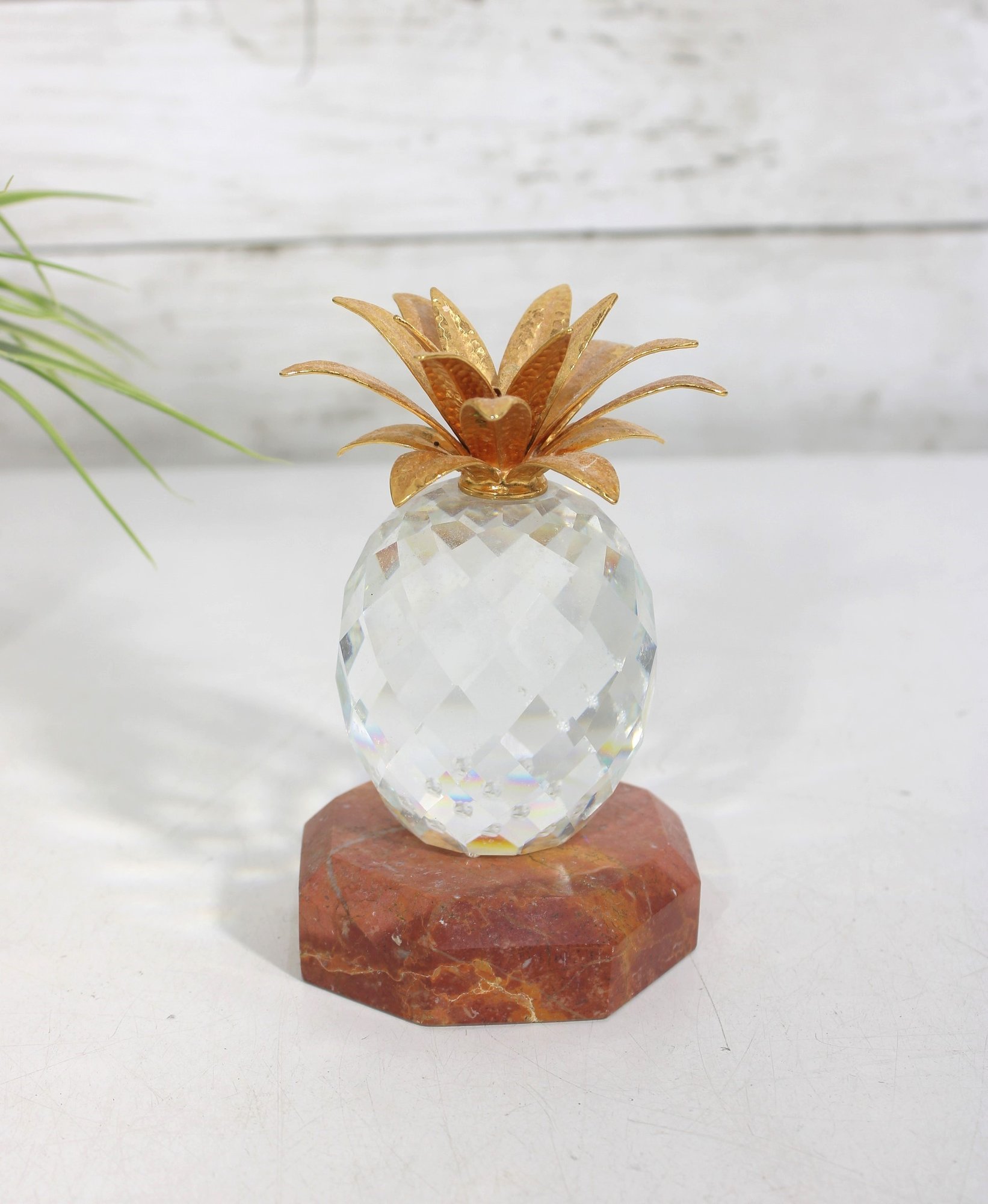 The pineapple sits on a polished stone base, adding weight and stability while enhancing its display appeal. Known as a symbol of hospitality and warmth, this piece is perfect for home décor, collectors, or as a thoughtful gift.