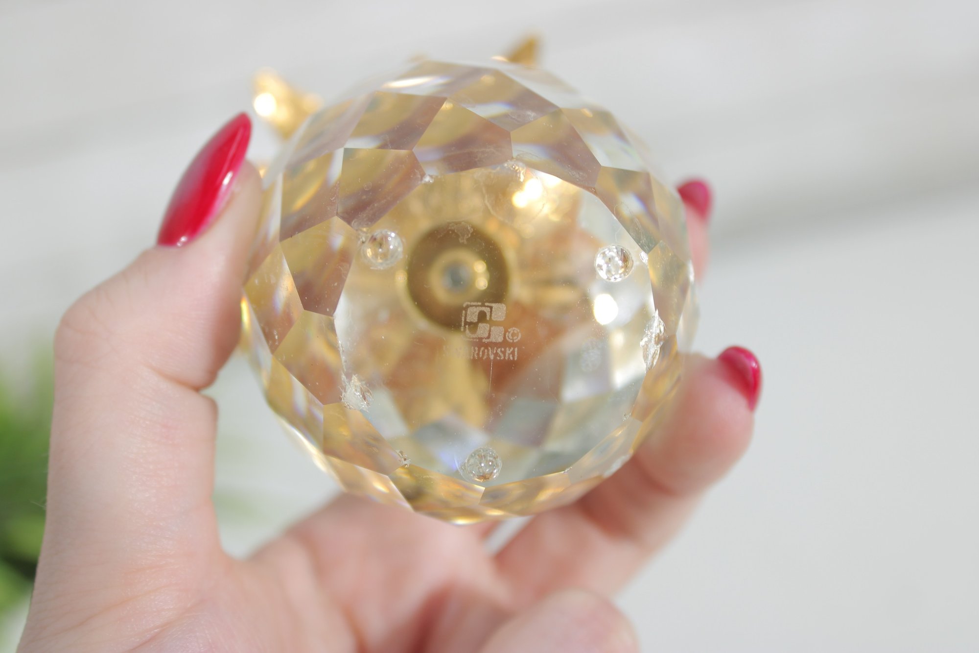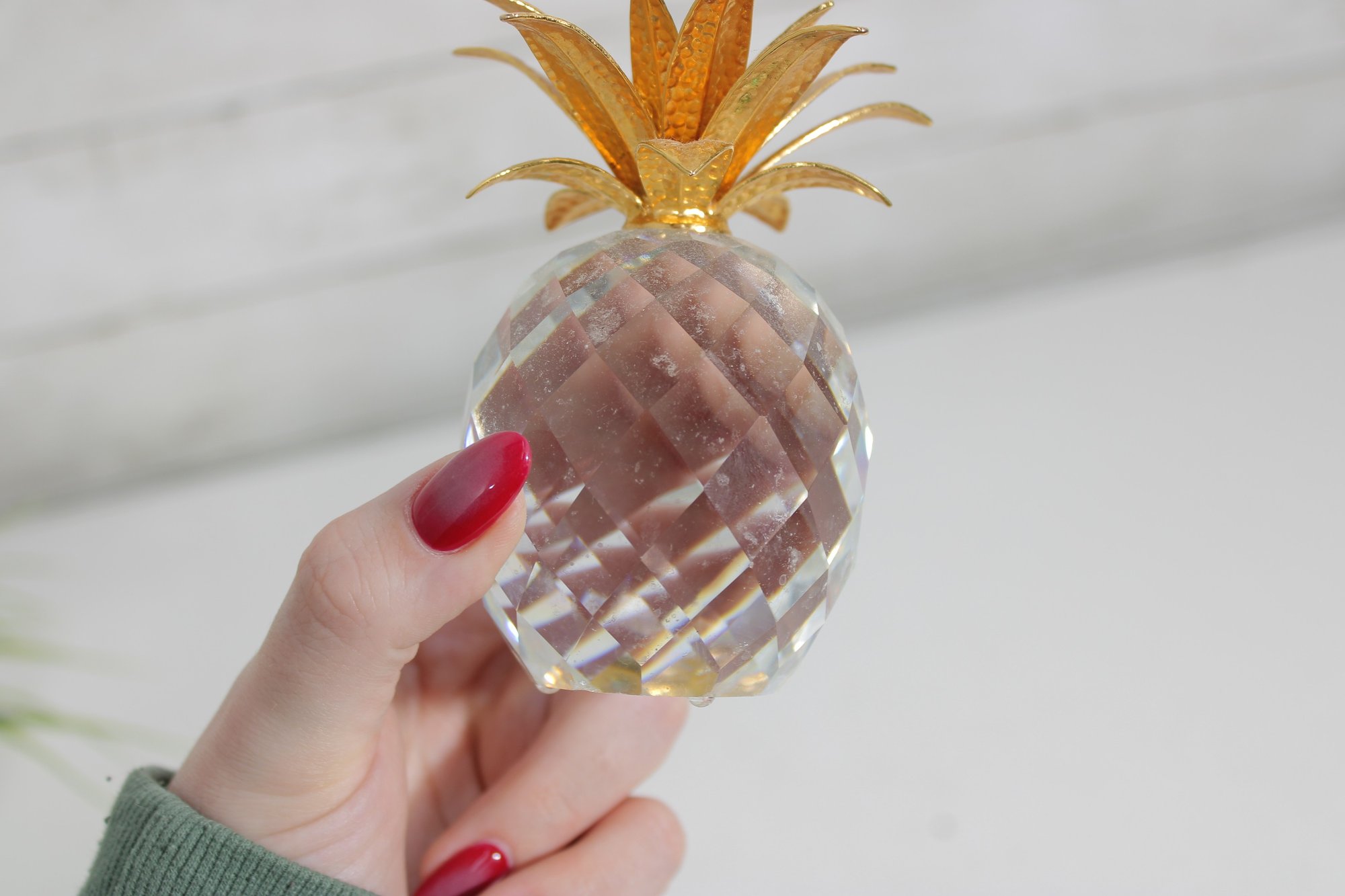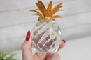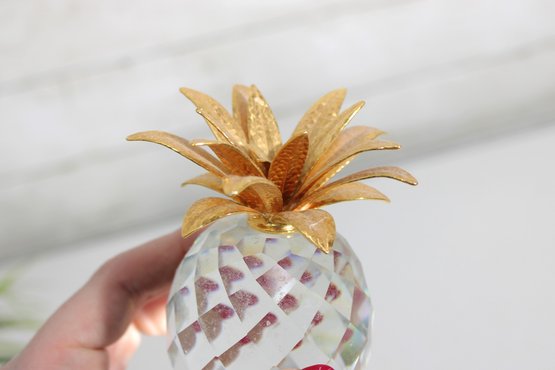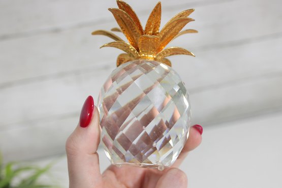 Elegant and eye-catching Swarovski crystal pineapple figurine, beautifully crafted with a faceted clear crystal body and detailed gold-tone metal leaves. This larger example stands approximately 4 inches tall and makes a striking decorative accent.