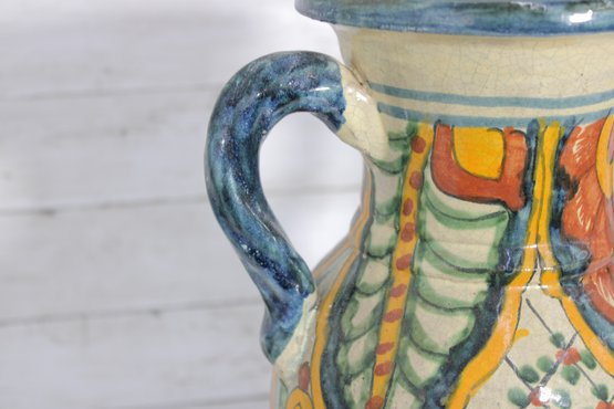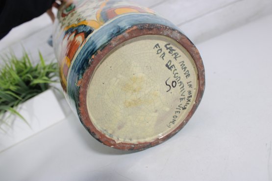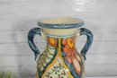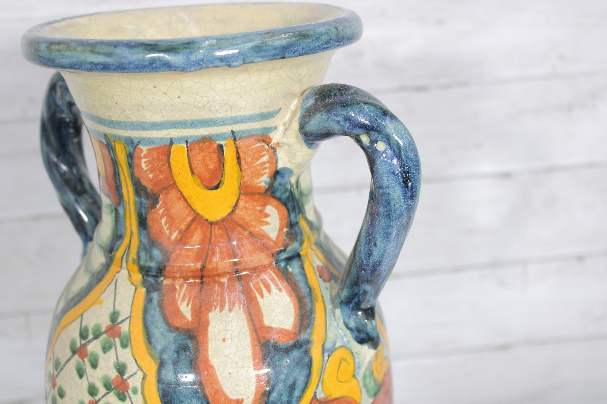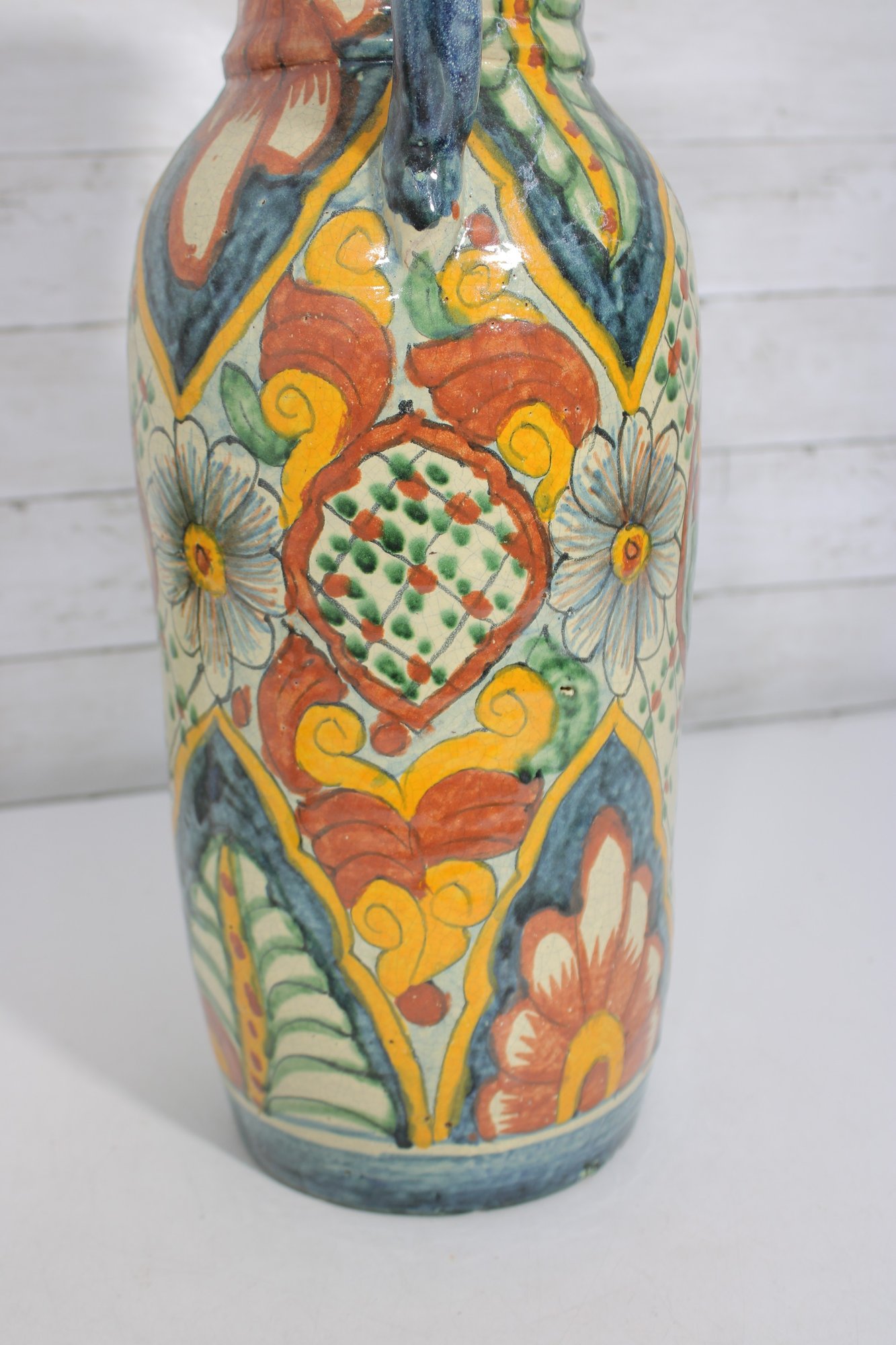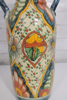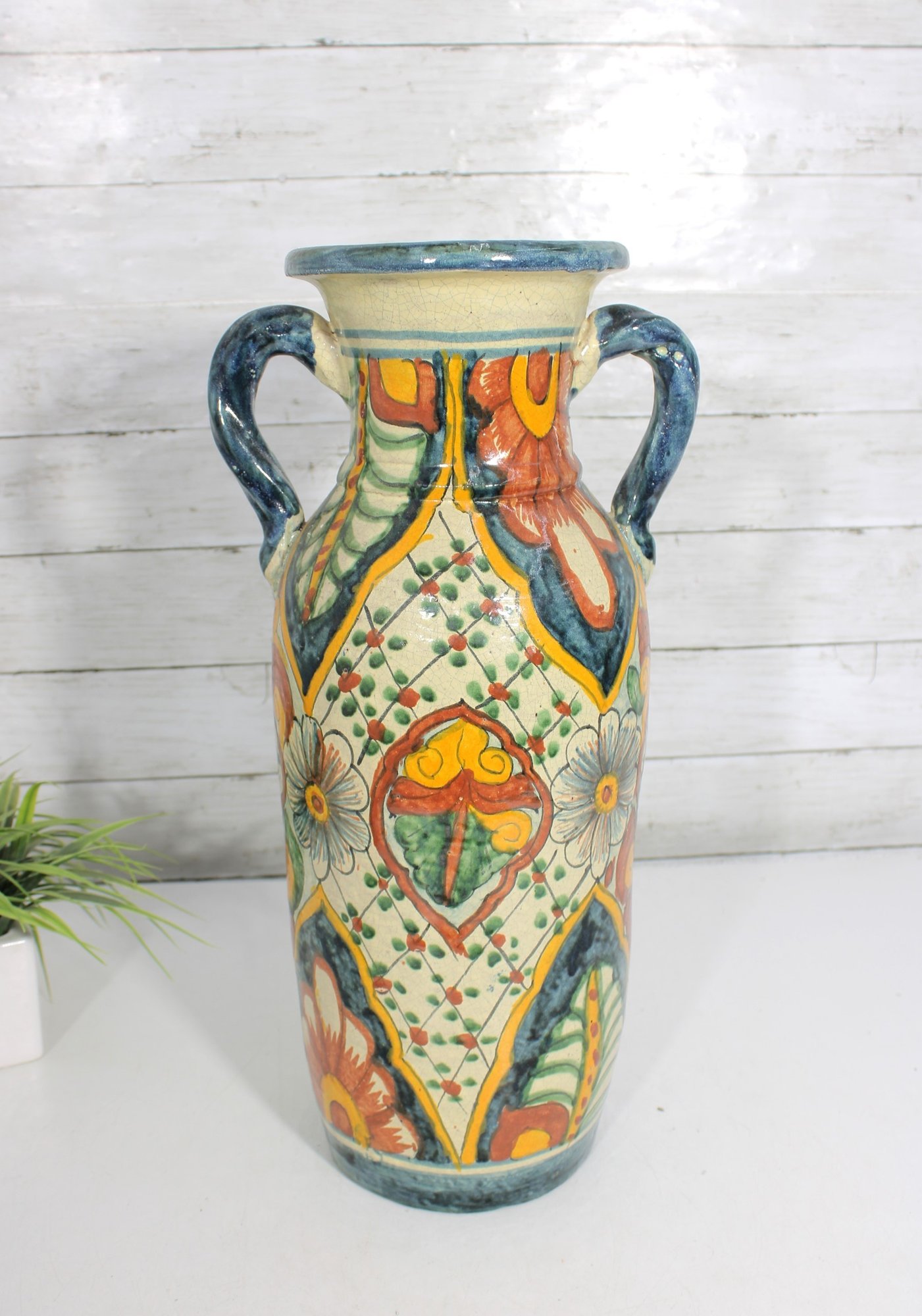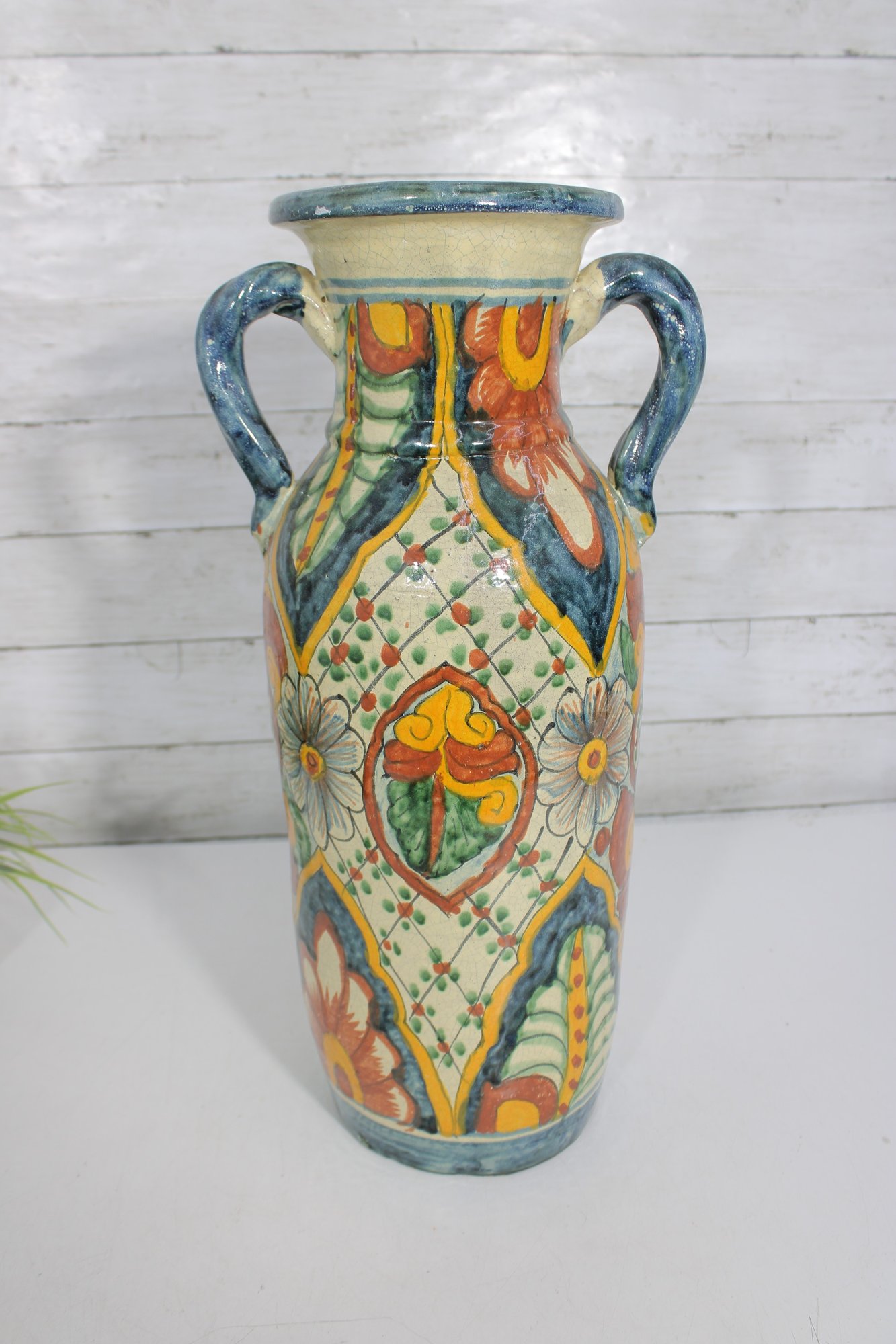 The tall, elegant form is complemented by two decorative side handles and a wide flared rim, making it perfect as a floor vase or statement accent. Traditional Talavera-inspired motifs, including florals and geometric designs, create a bold and lively aesthetic that works beautifully in Southwestern, Mediterranean, or eclectic interiors.