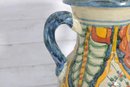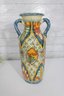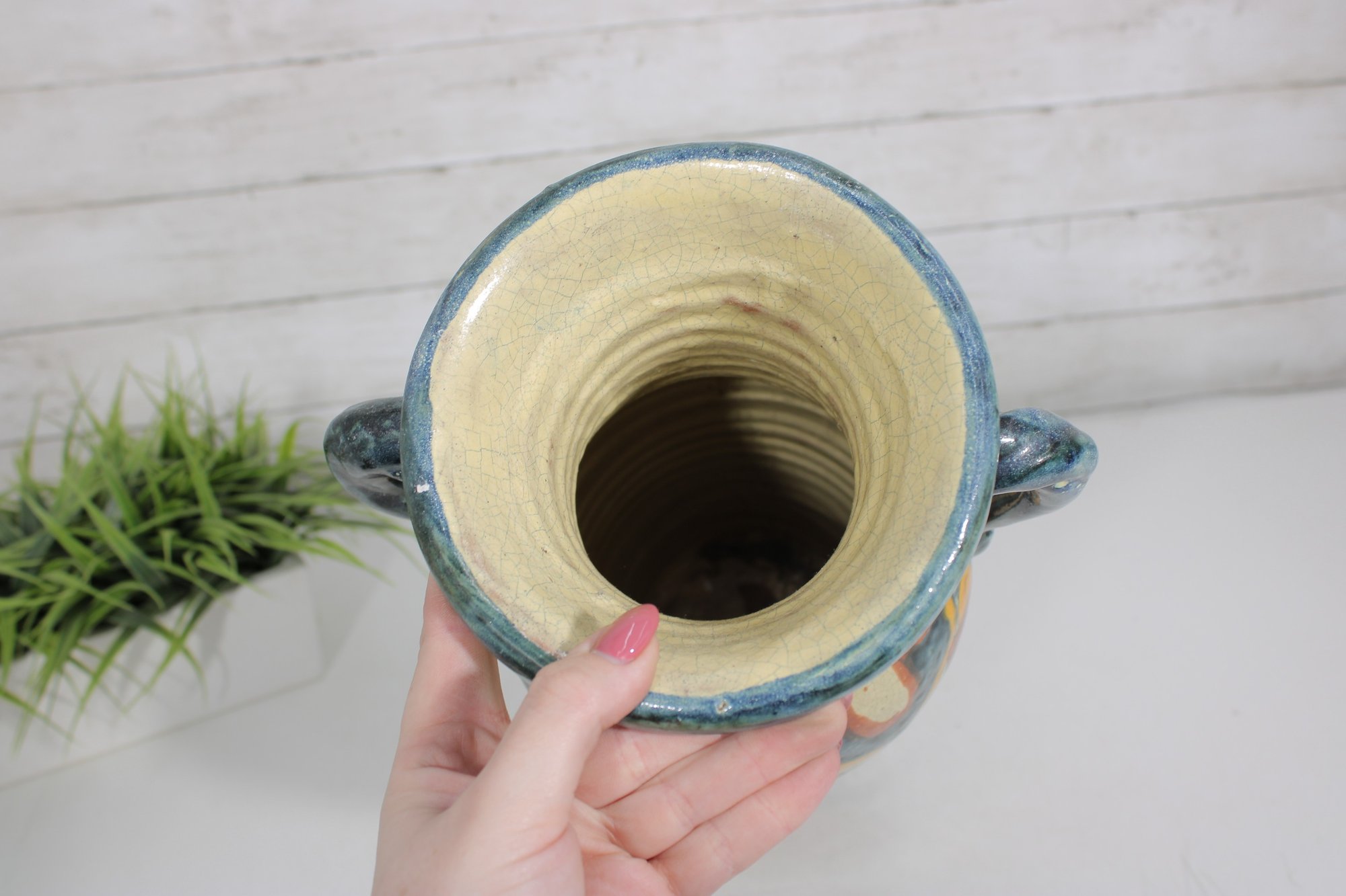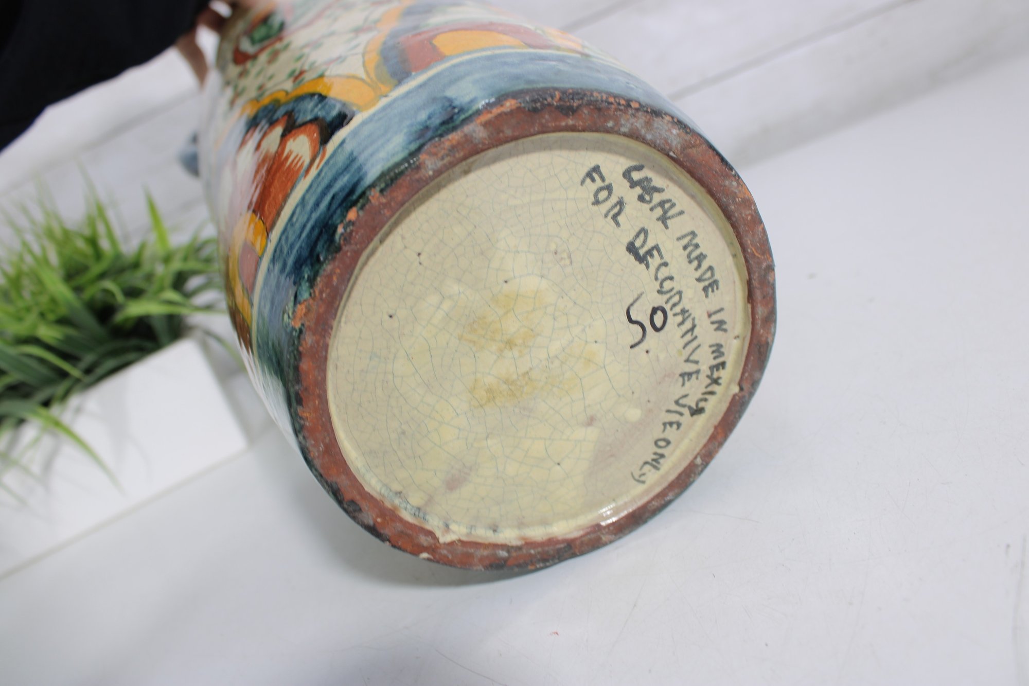 Add vibrant color and artisan charm to your space with this stunning Talavera-style double handled floor vase. Standing approximately 18.5 inches tall, this eye-catching piece features intricate hand-painted patterns in rich hues of blue, green, orange, and yellow.