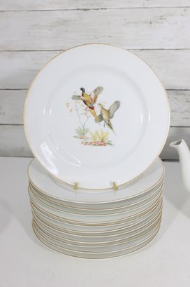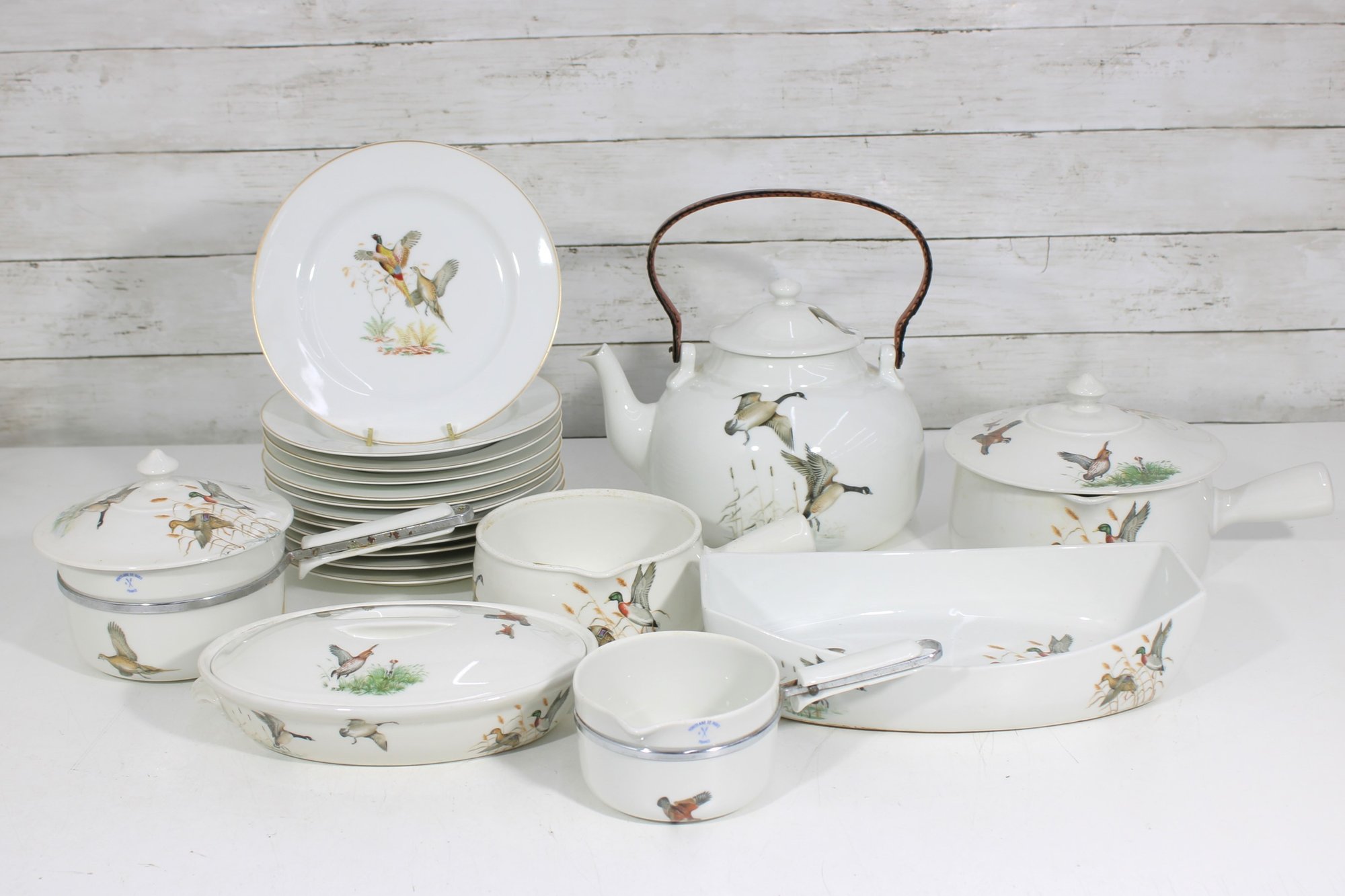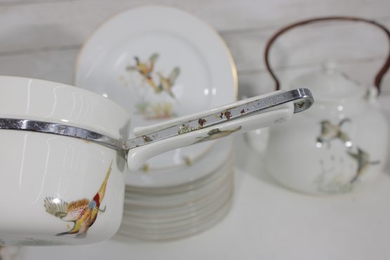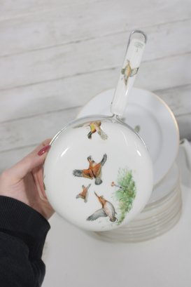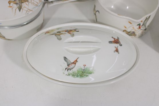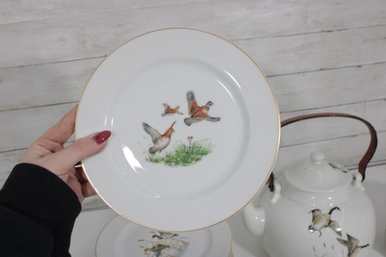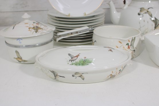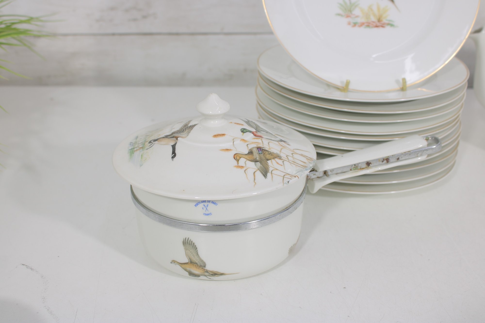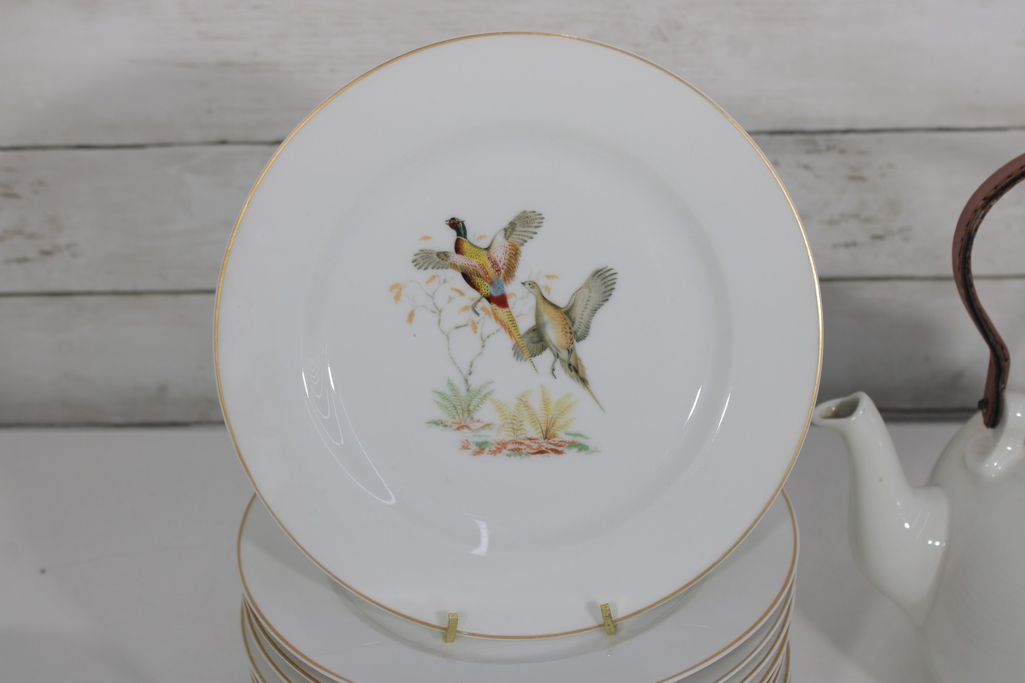 Beautiful vintage French porcelain dinnerware and serving set featuring classic pheasant and game bird hunting scenes. Each piece is decorated with finely detailed birds in natural landscapes with subtle gold gilt trim, giving the set an elegant country estate or hunting lodge style.