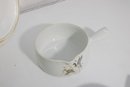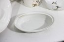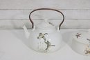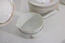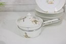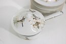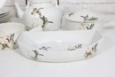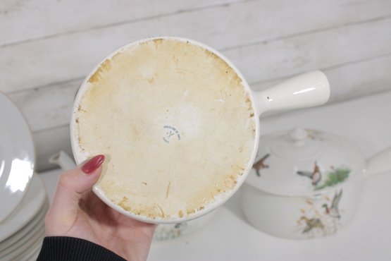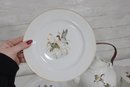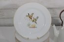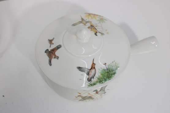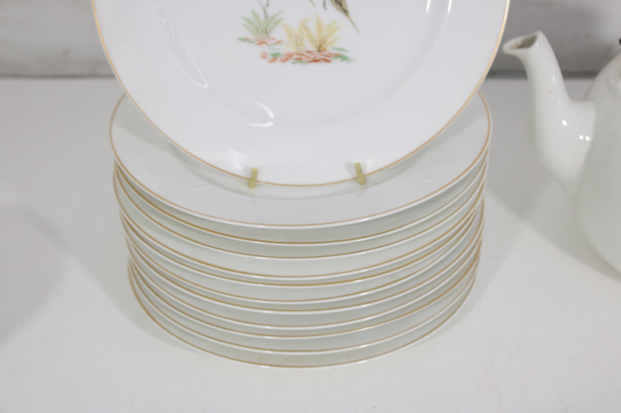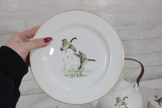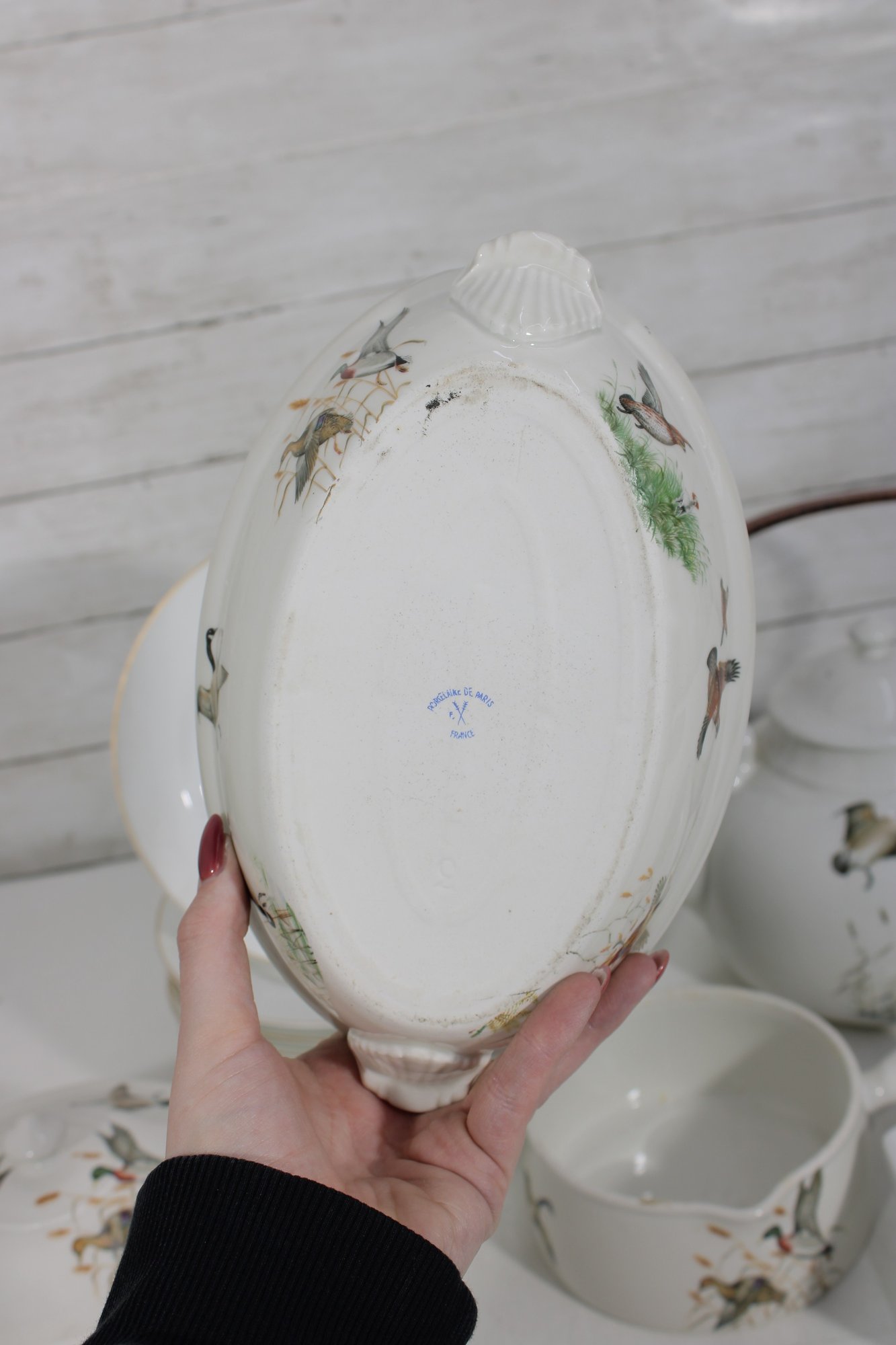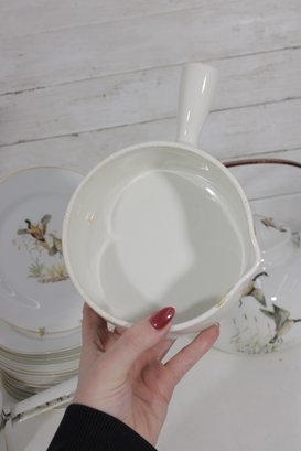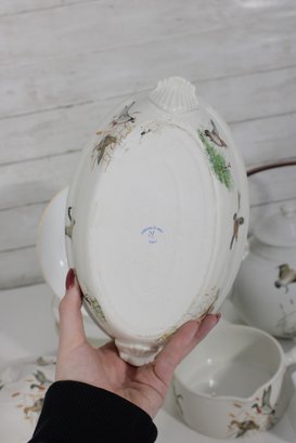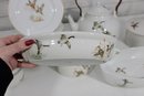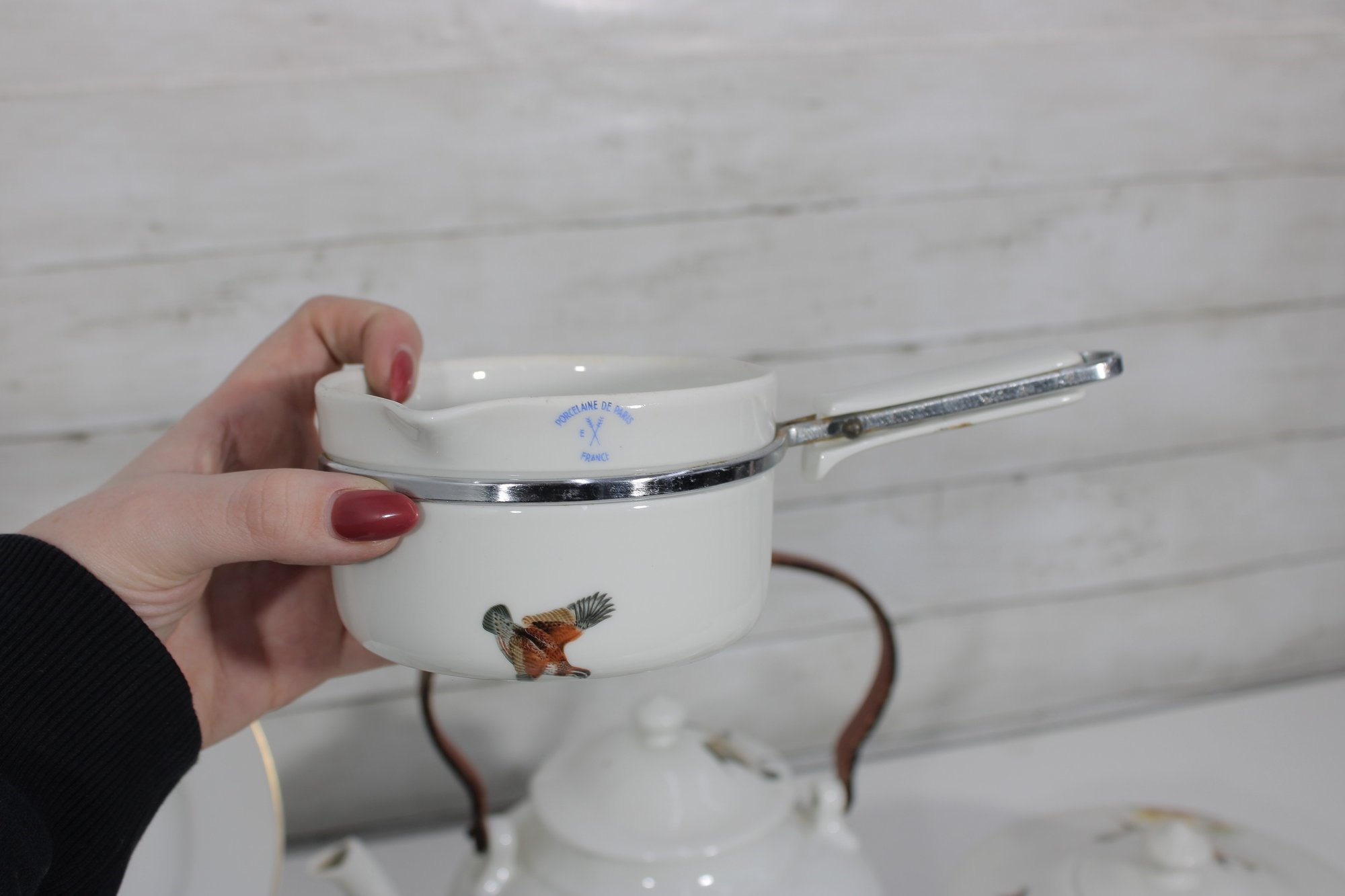 Beautiful vintage French porcelain dinnerware and serving set featuring classic pheasant and game bird hunting scenes. Each piece is decorated with finely detailed birds in natural landscapes with subtle gold gilt trim, giving the set an elegant country estate or hunting lodge style.