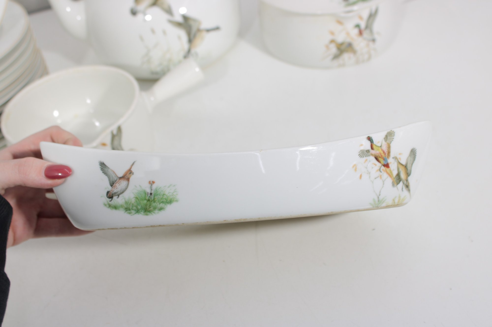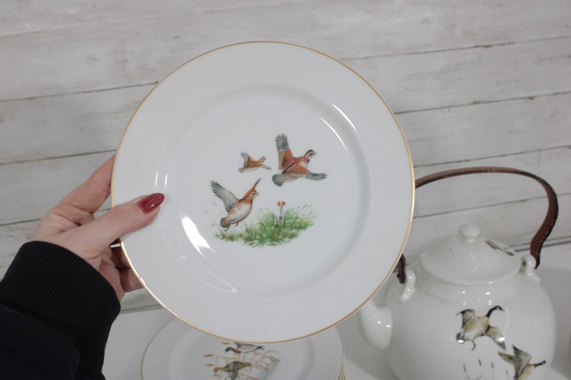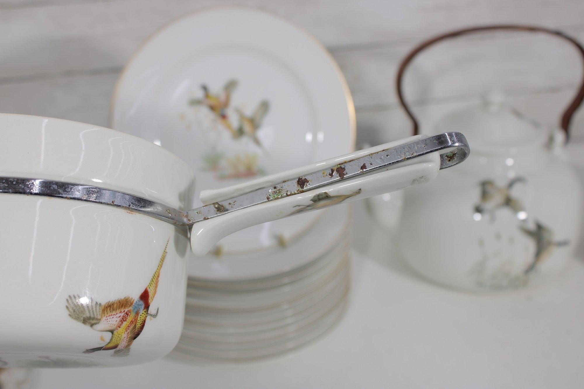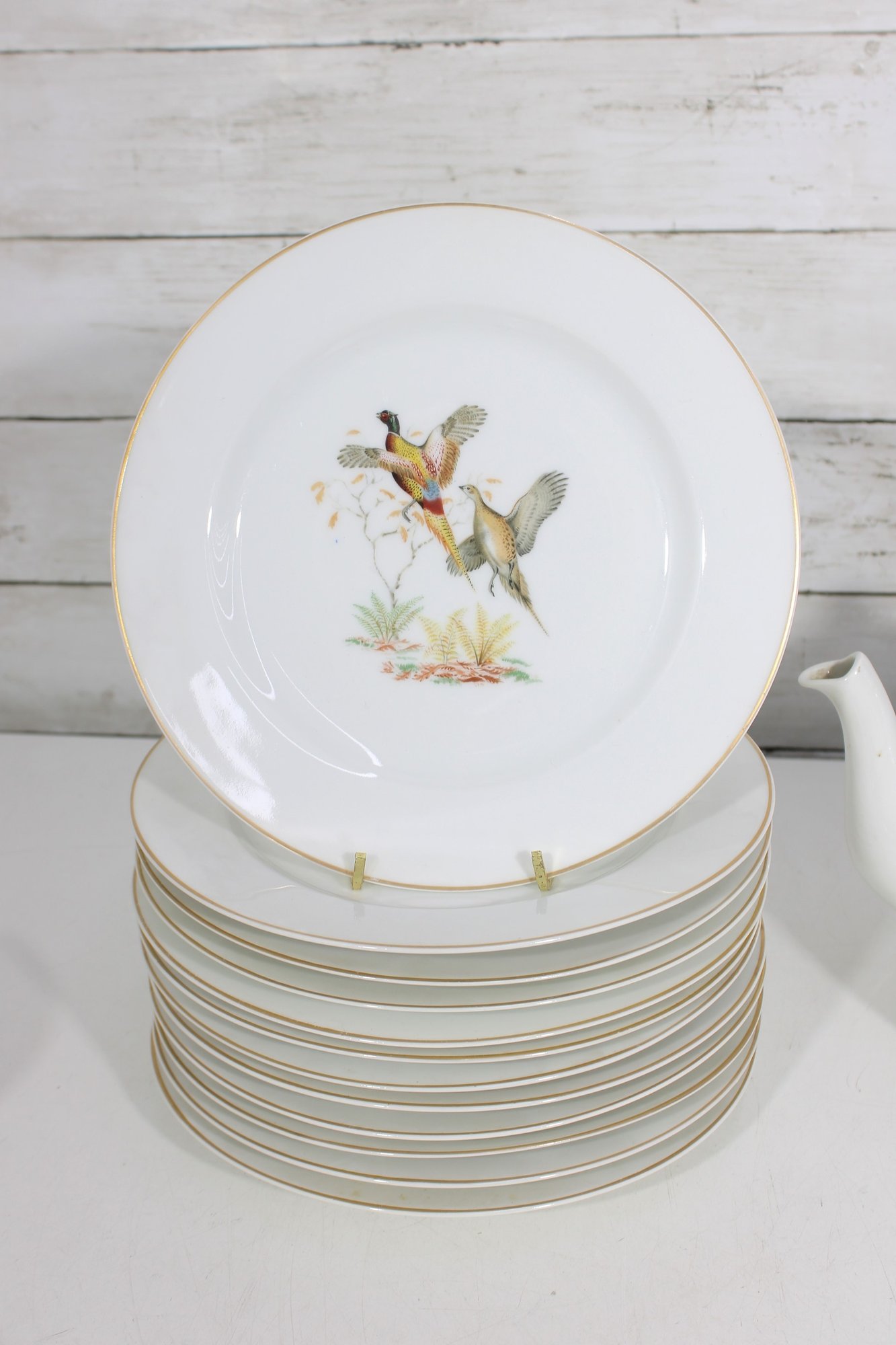 This impressive collection includes a variety of dinner plates and serving pieces, making it ideal for display, entertaining, or expanding a vintage porcelain collection. The artwork depicts pheasants and other birds in flight and in field scenes, capturing the charm of traditional European sporting tableware.