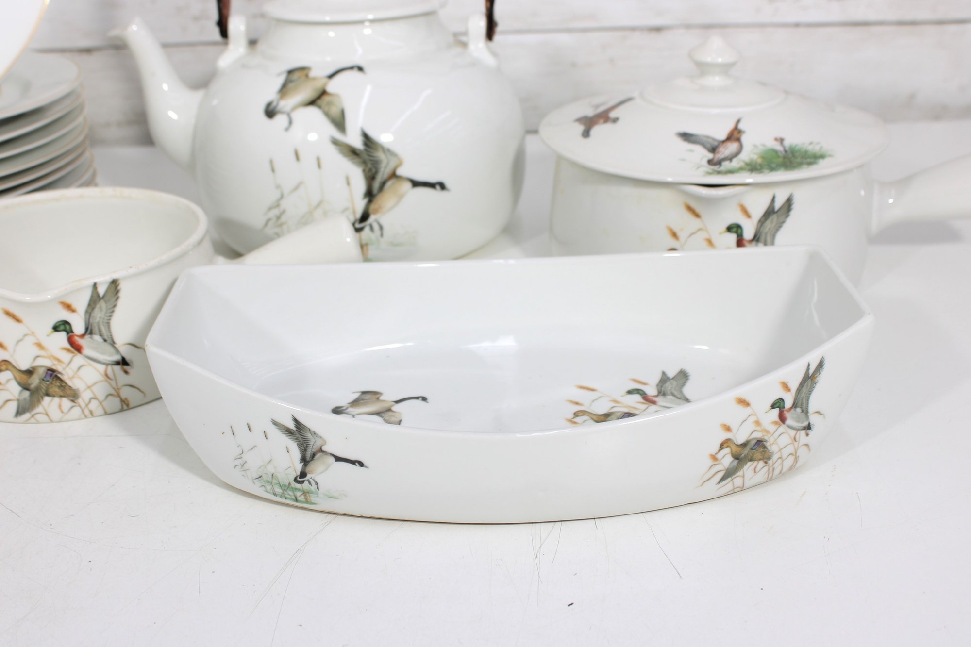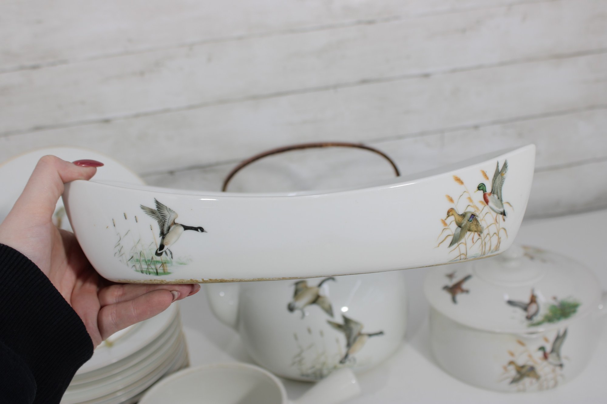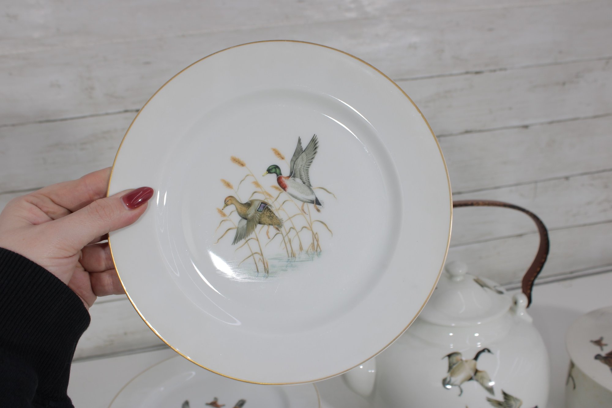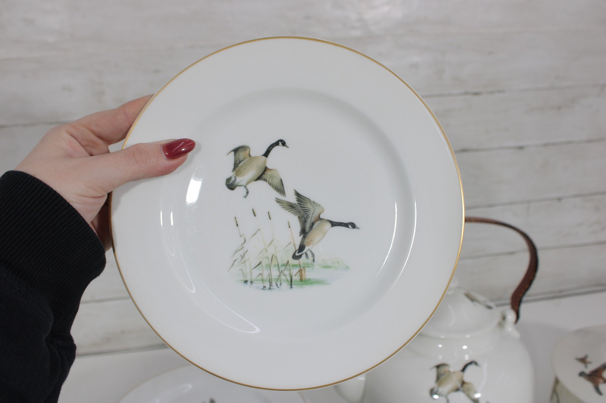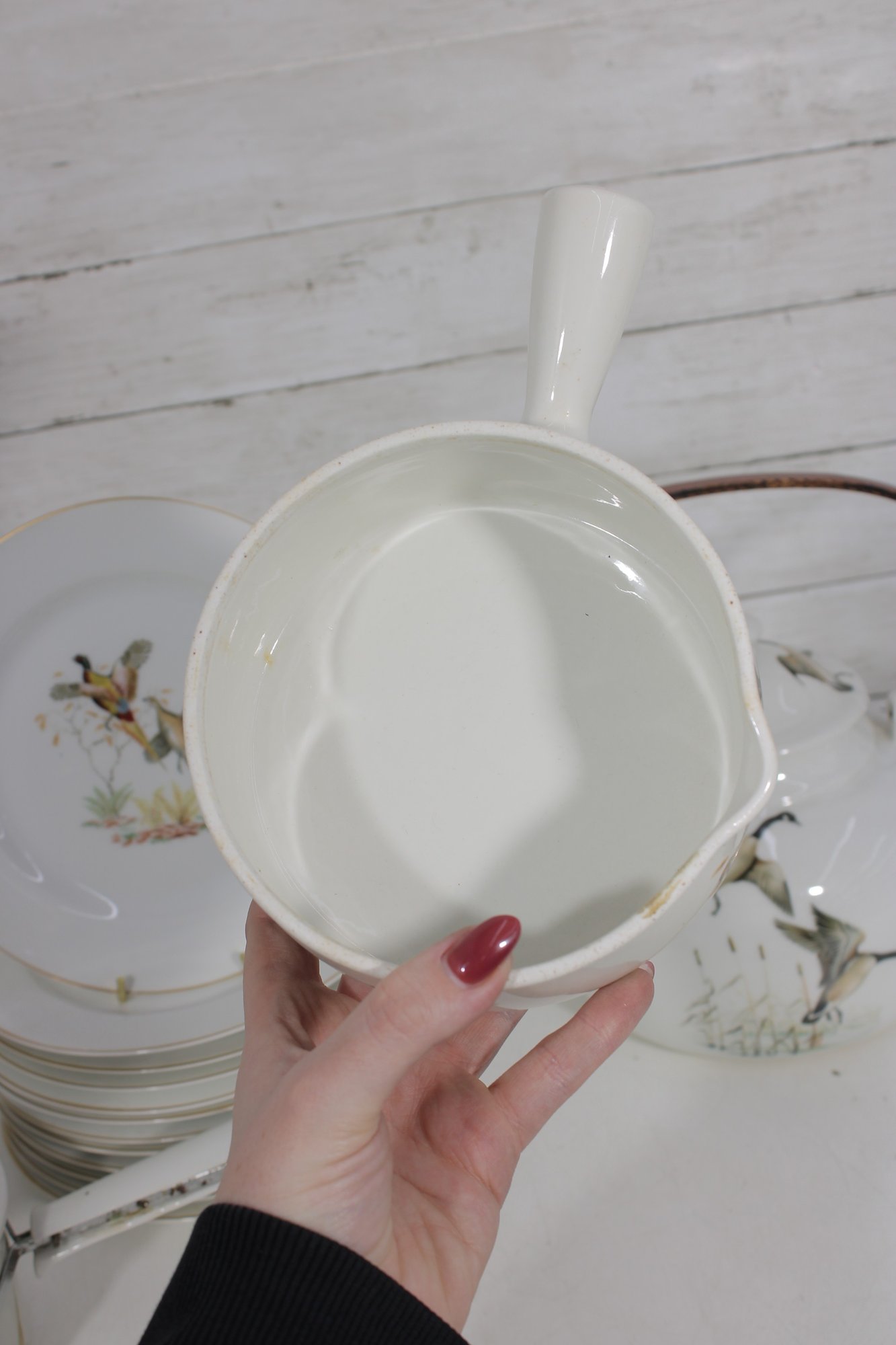 This impressive collection includes a variety of dinner plates and serving pieces, making it ideal for display, entertaining, or expanding a vintage porcelain collection. The artwork depicts pheasants and other birds in flight and in field scenes, capturing the charm of traditional European sporting tableware.