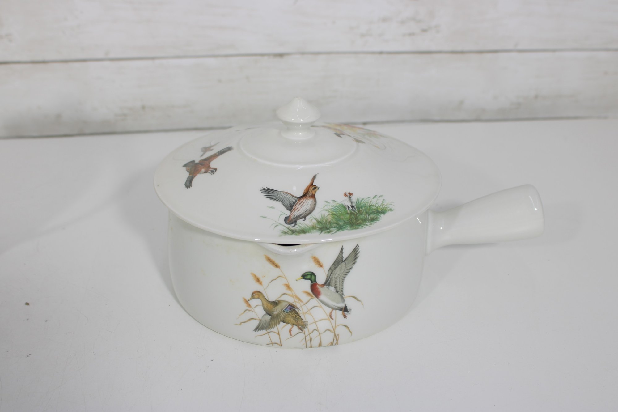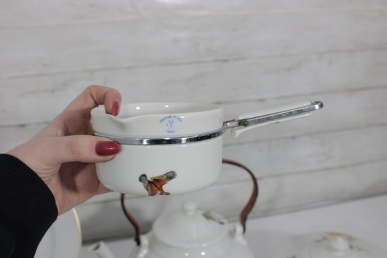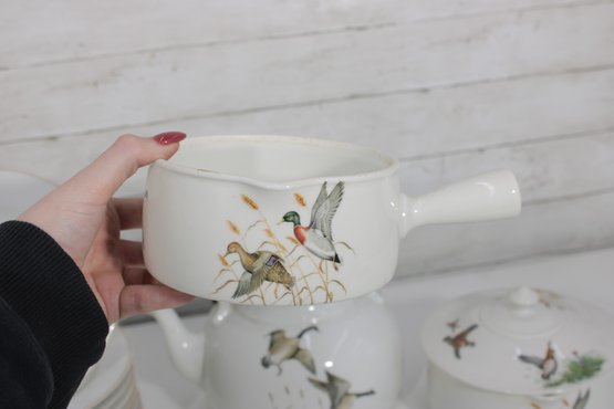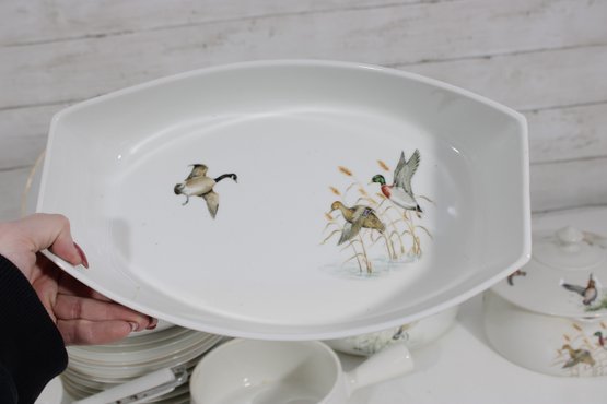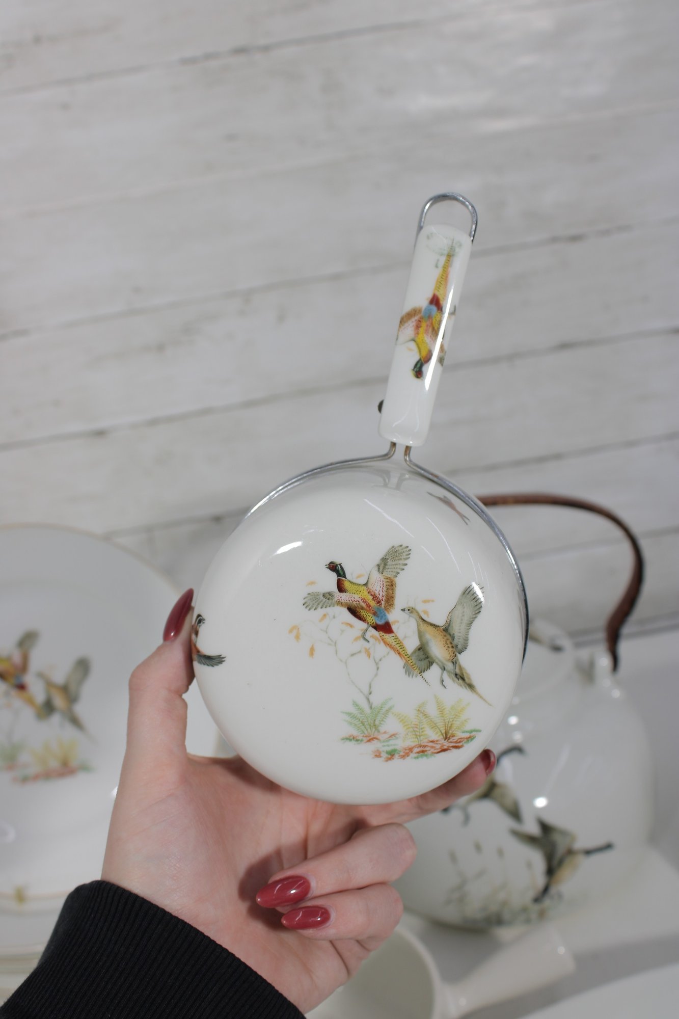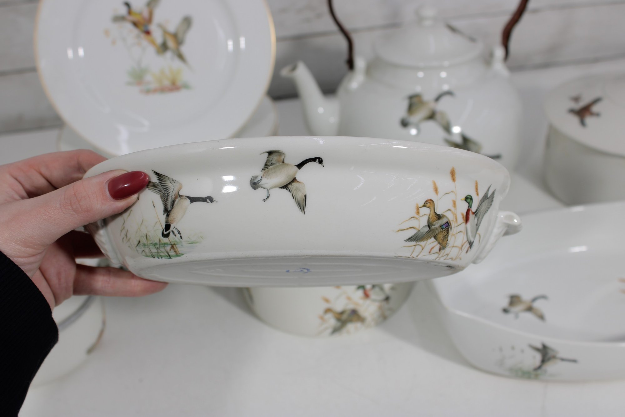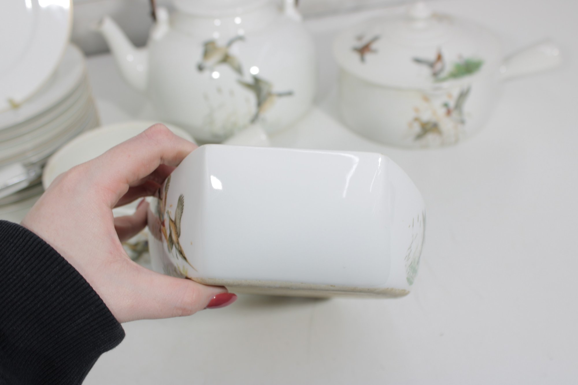 This impressive collection includes a variety of dinner plates and serving pieces, making it ideal for display, entertaining, or expanding a vintage porcelain collection. The artwork depicts pheasants and other birds in flight and in field scenes, capturing the charm of traditional European sporting tableware.
